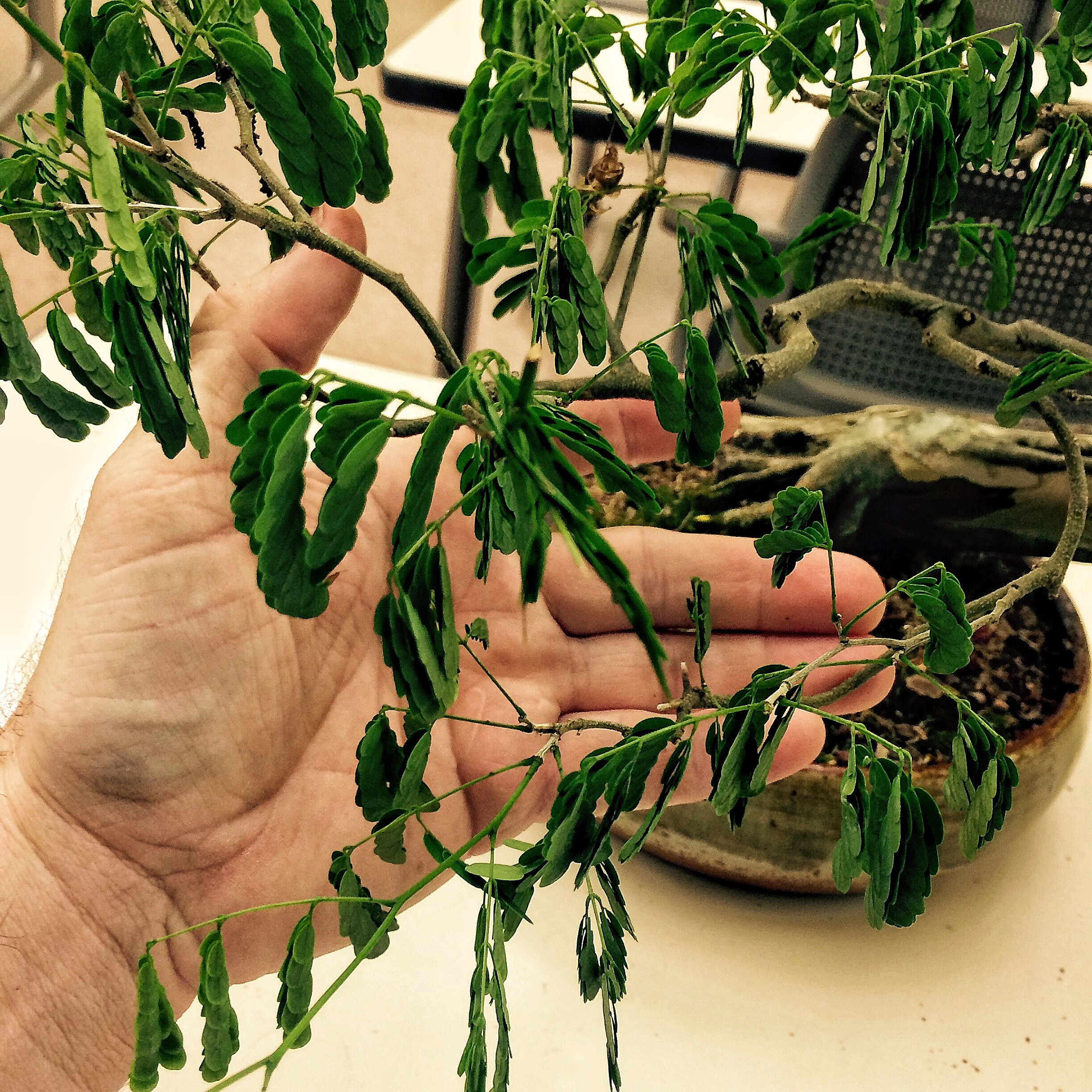 ….it’s because it’s night and the tree is indoors. The BRT’s leaves just do that in response to lowered light or, as you might guess when you think of the name, in the rain.