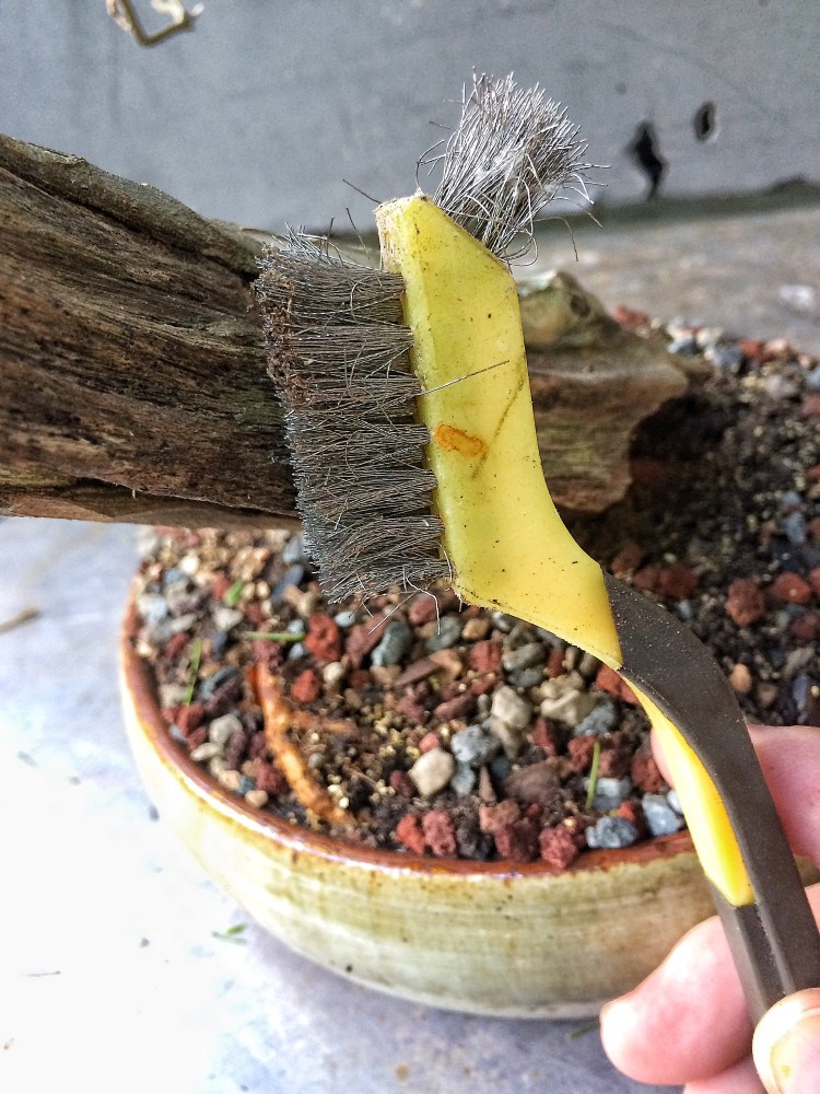 Now, back at The Nook (I’ve been at the CFBC meeting, if you couldn’t recognize the locale) I need to clean and apply lime sulfur to the deadwood.