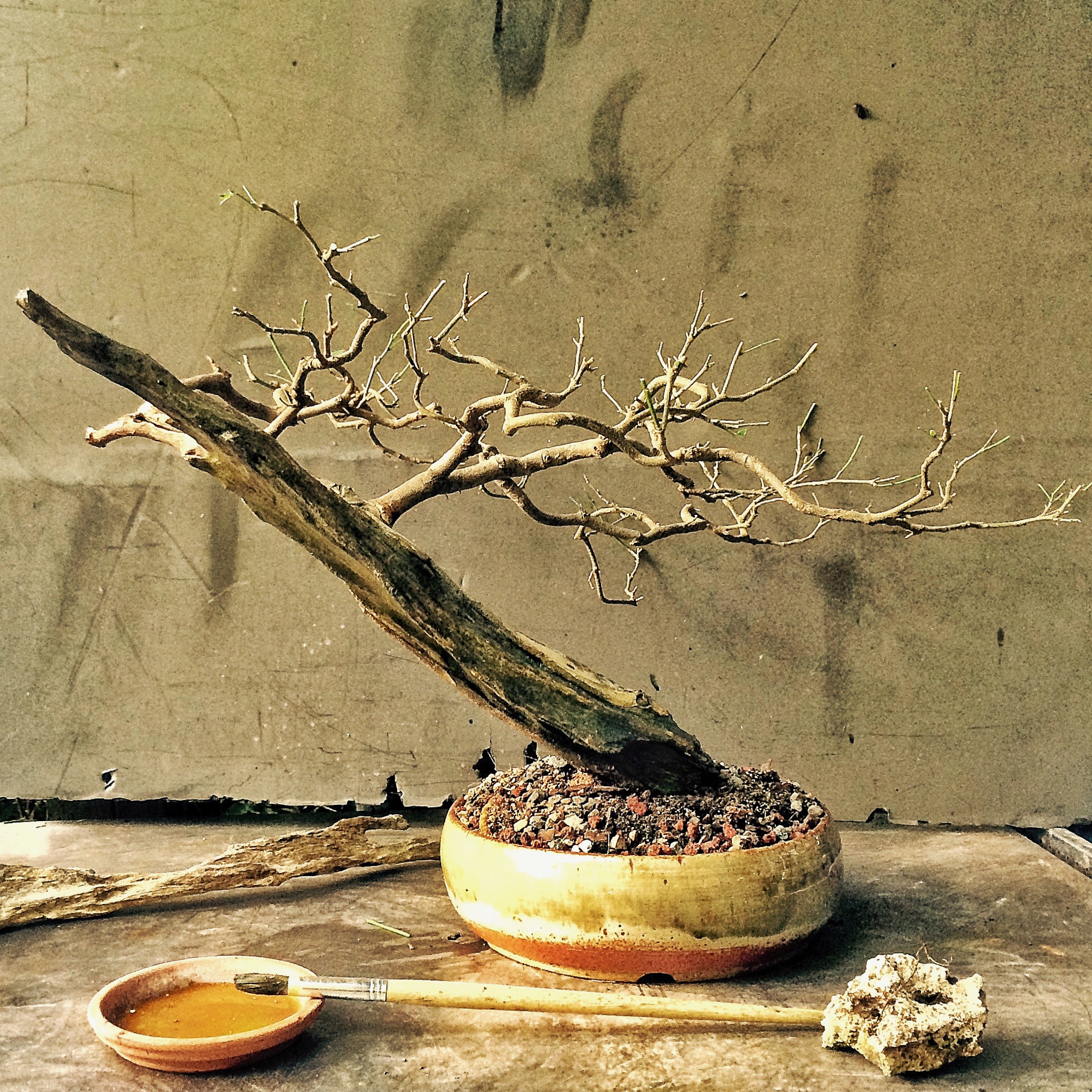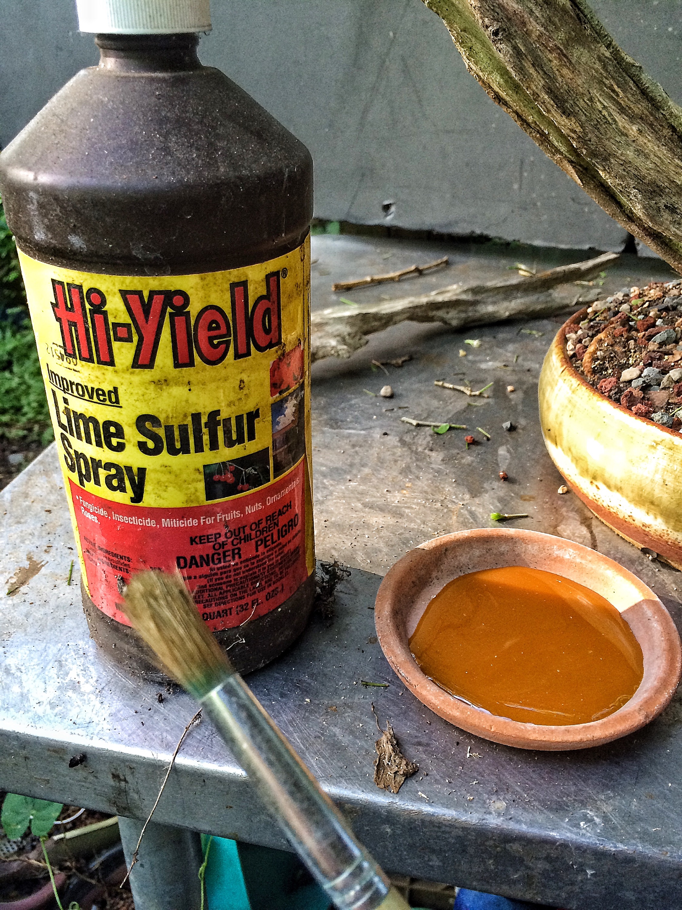 I use lime sulfur full strength, since I will get asked and (at the chagrin of the re-bottlers out there, to whom I apologize to some but not to others) you can find this brand on the Internet, in this giant bottle, for less than buying a tiny bottle that says “for bonsai” on it somewhere. Just be aware that there are several states in the U.S. whose respective regulatory agencies have limited or banned the sale of lime sulfur and you may get a visit from a jack-booted, polo-shirted bureaucrat, trying to justify his continued employment, vampiricly suckling on the public teat.