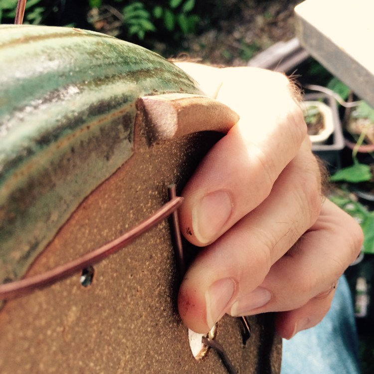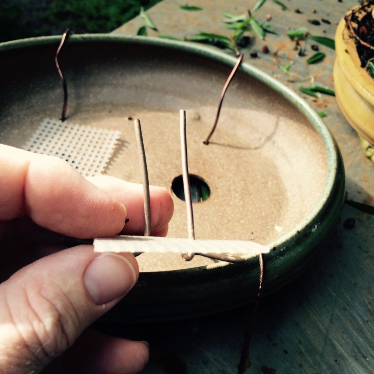 And then bend the ends going through the hole, flush with the bottom of the pot.
