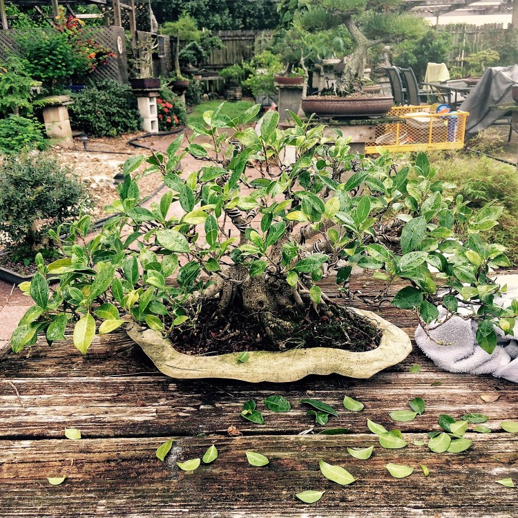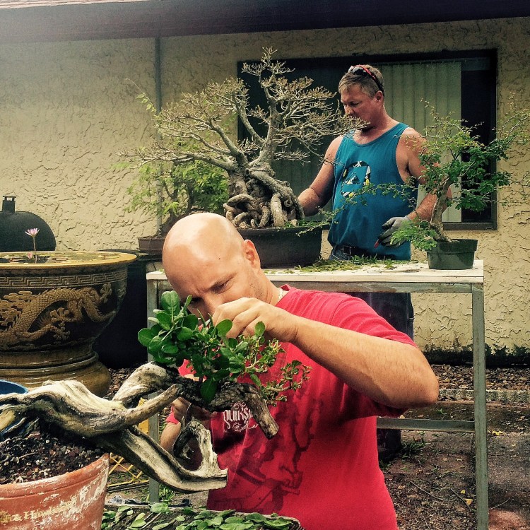 Although he looks a bit like Yule Brenner there. That’s Donny in the background performing the Herculean task of defoliating a massive ficus salicaria. Dave is working on a collected buttonwood from Puerto Rico while I was busy defoliating and un-wiring my tree.