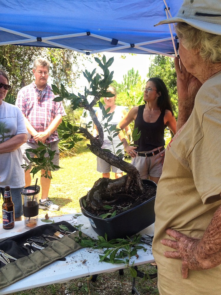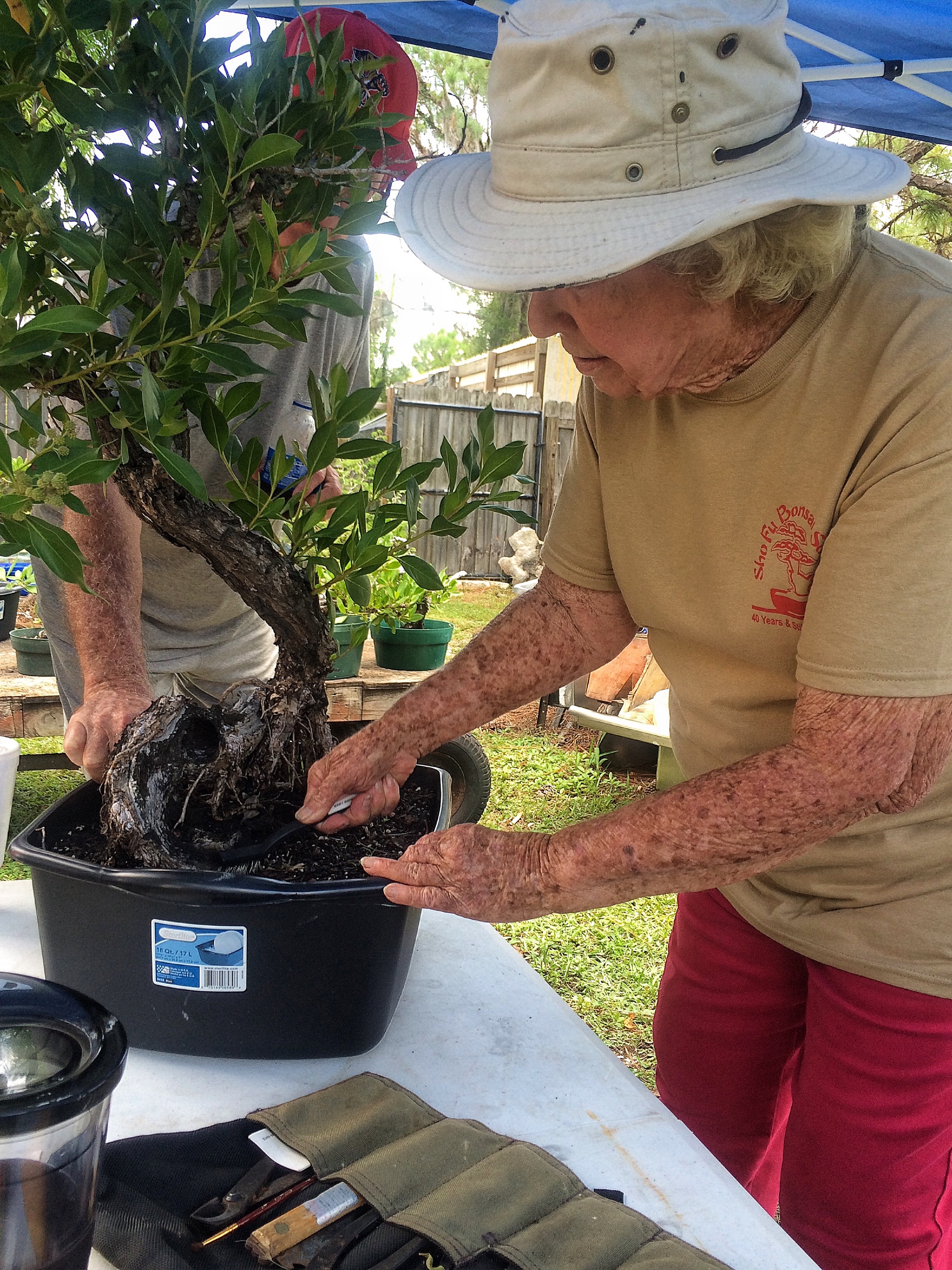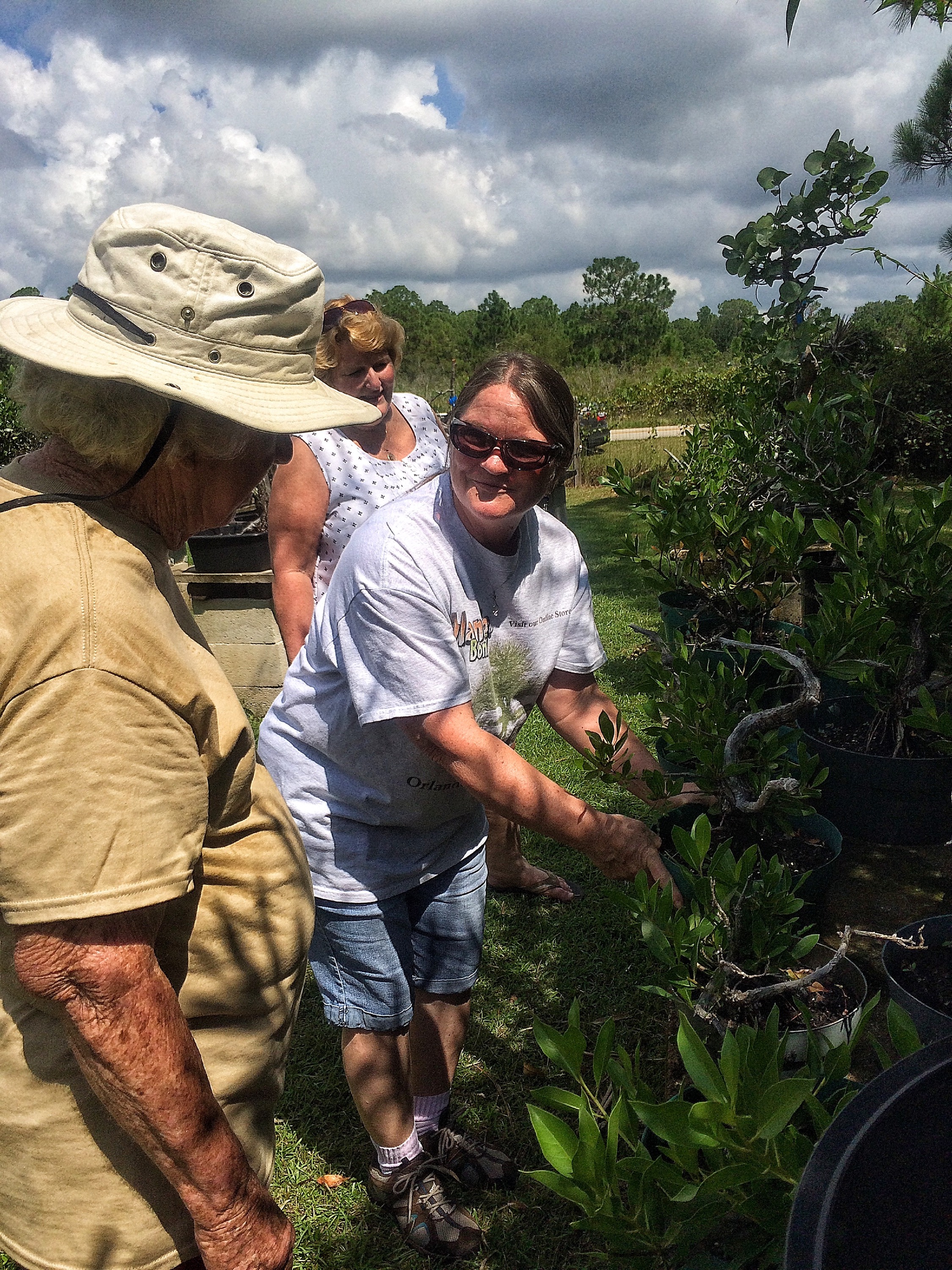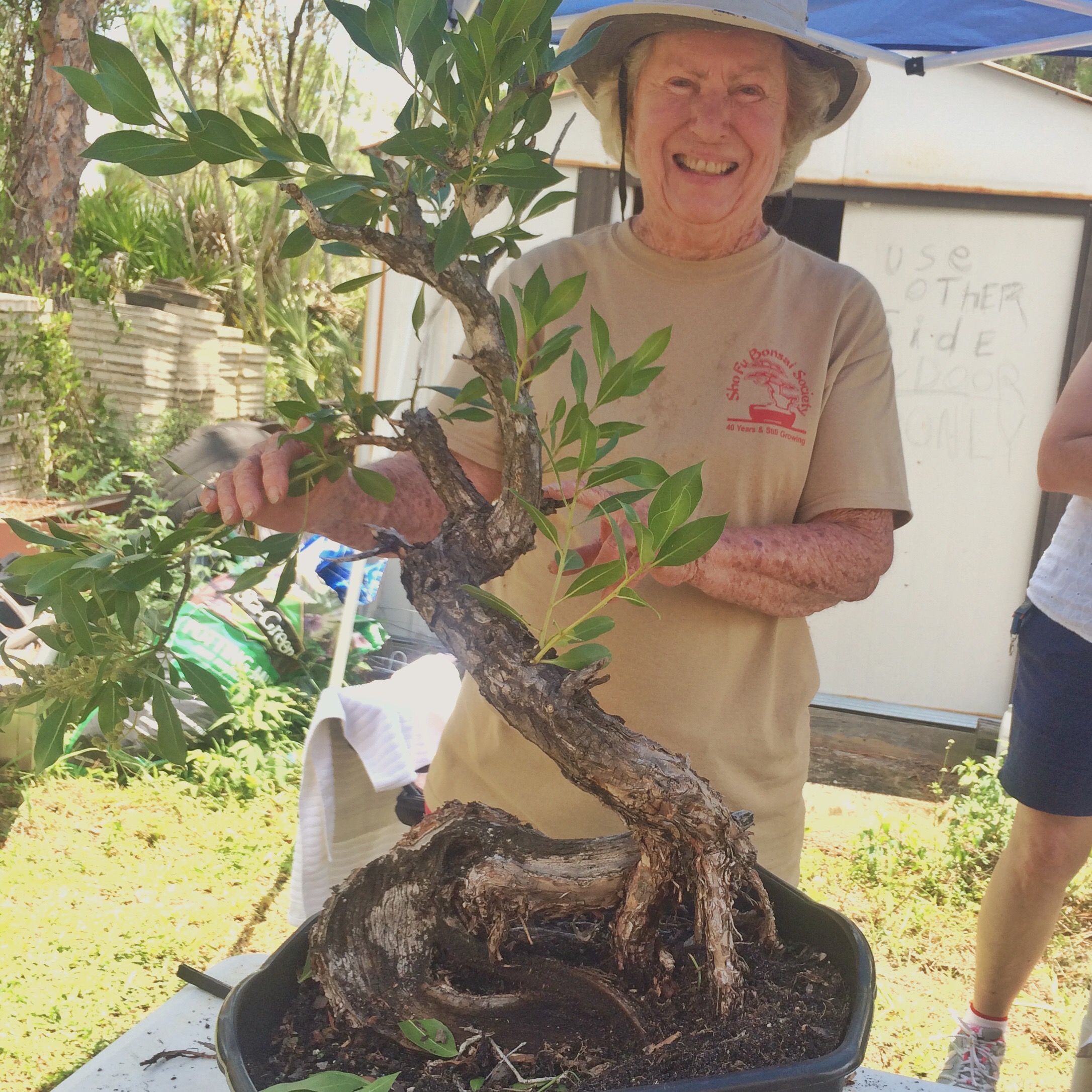 The Central Florida Bonsai Club has an annual fieldtrip in August where we visit Mary Madison’s home in Lake Placid Florida. Mary is, indisputably, the Buttonwood Queen, owing to the fact that probably 80% of all buttonwoods that have been displayed in high profile shows were first collected from the wild by her. She specializes in rescuing the trees before the bulldozer rips them out of the ground to make way for another retirement condo or timeshare highrise.