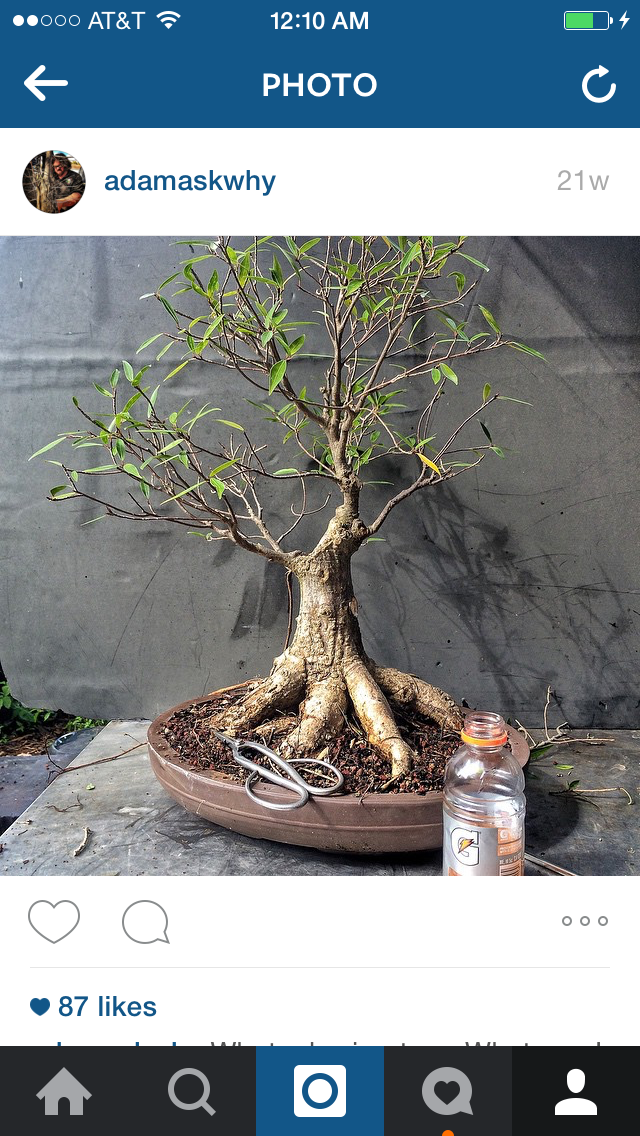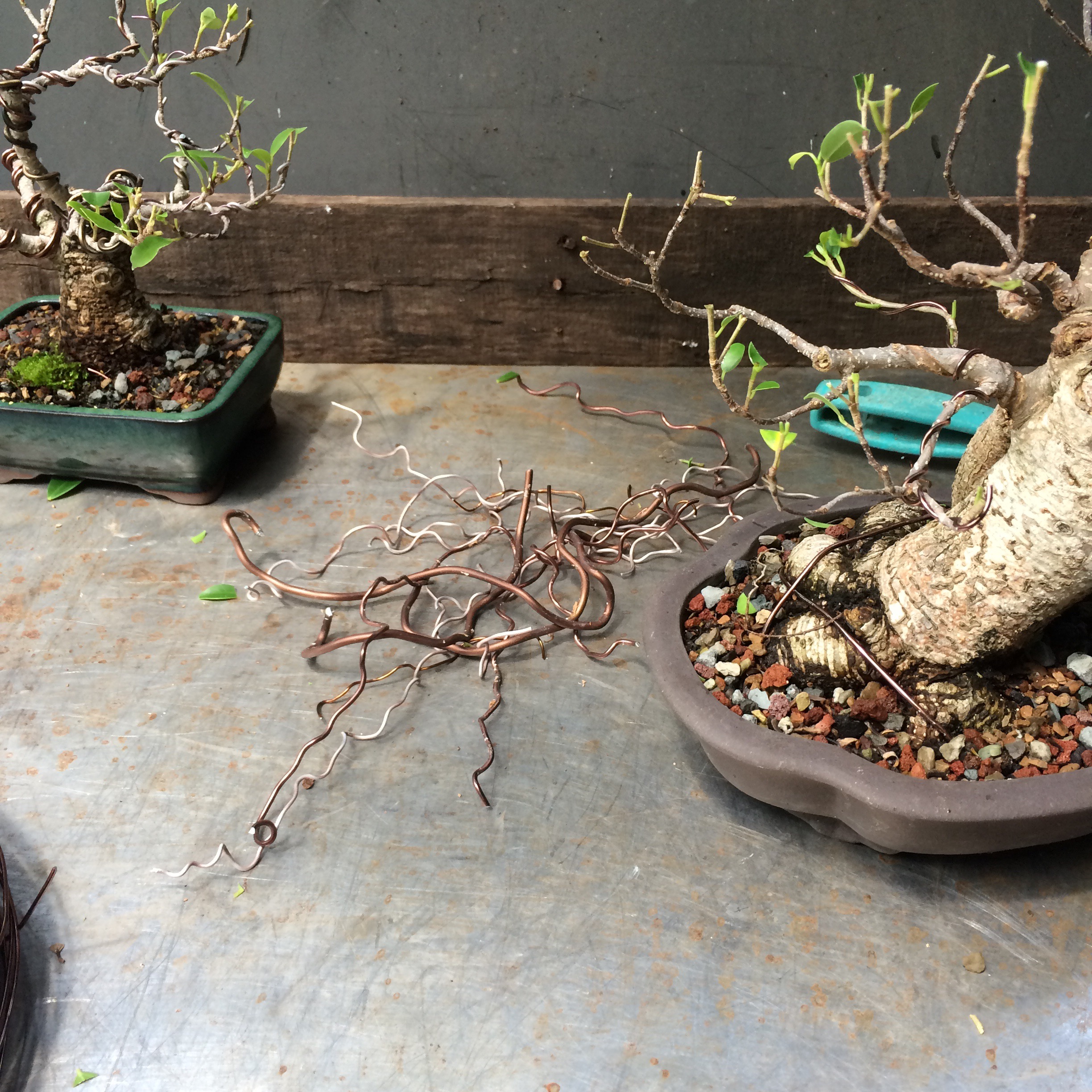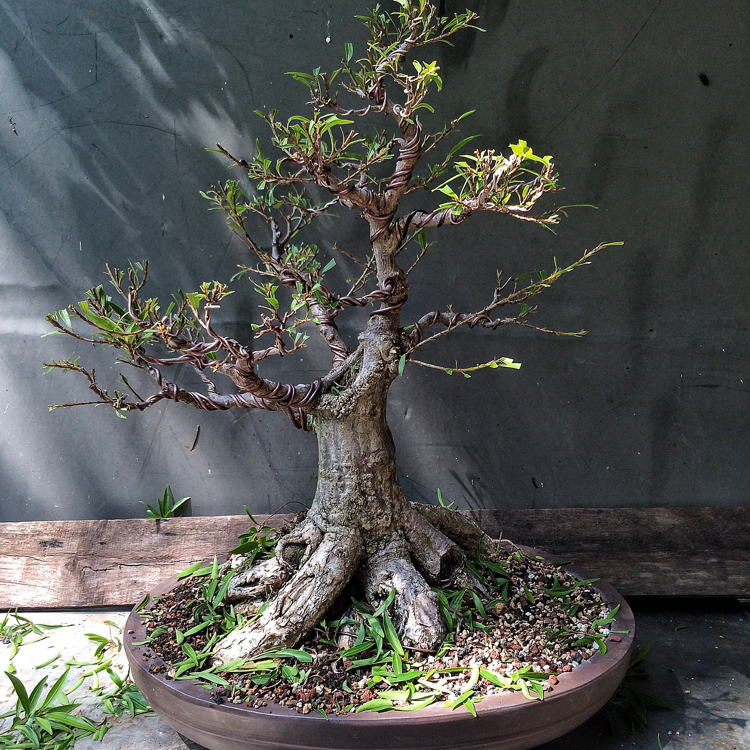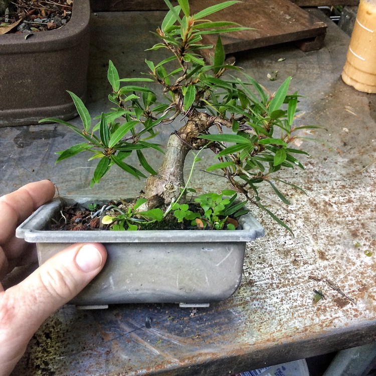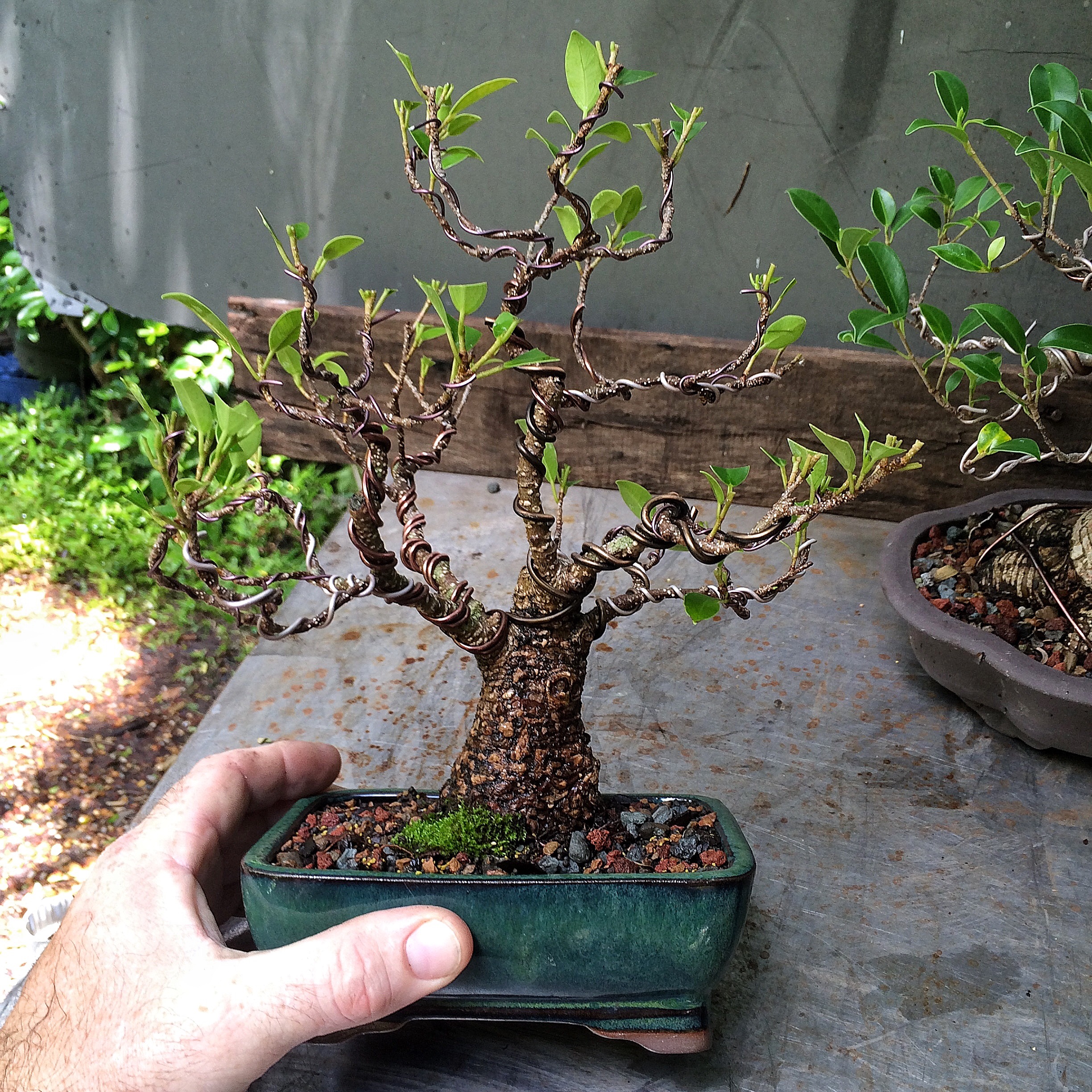 Getting back to the willow leaf….   I think that’s it. I tip pruned every branch to increase ramification. No wire though, everything is in good position. I’m impressed at how much the branches have thickened, especially on the left.   It’s good to live in la Florida, except for the transient pedophiles and intransigent pill seekers. Next two trees….. F. Microcarpas both.    Wired at the same time but only one of them repotted.