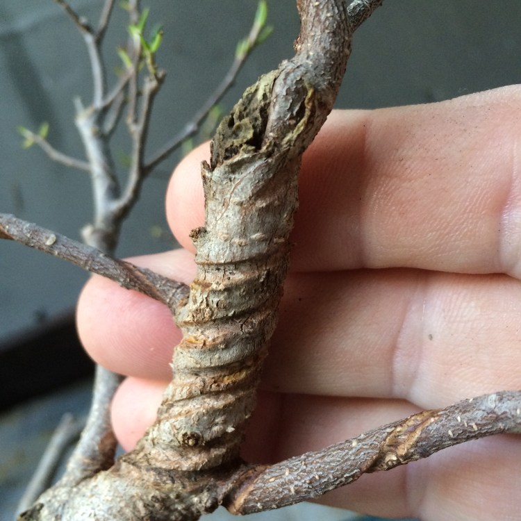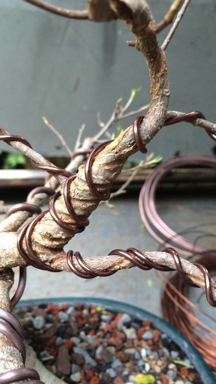 For those who don’t know, in all the books, video, papyrus scrolls offered in bonsai technique instruction, it is taught that unwinding wire off of the branch is dangerous because you could damage the branch you are unwiring. This is true. I have done it. But not lately. Why? I teach the Adamaskwhy method of wire removal specifically because you can damage a branch. It forces you to be more cognizant of the fragility of the branch and to have more respect for that fragility. It also increases your comfort level and muscle memory in the motion of winding/unwinding a stiff wire around a branch. In other words, taking wire off makes you better at putting it on. This is why I use aluminum wire almost exclusively. You can’t unwind most copper wire because it stiffens when you bend it.