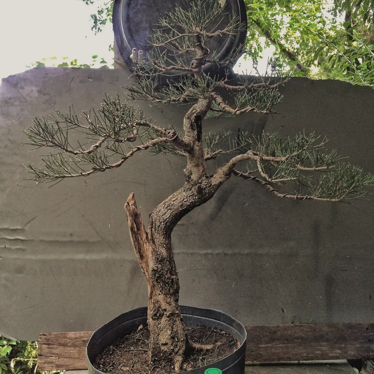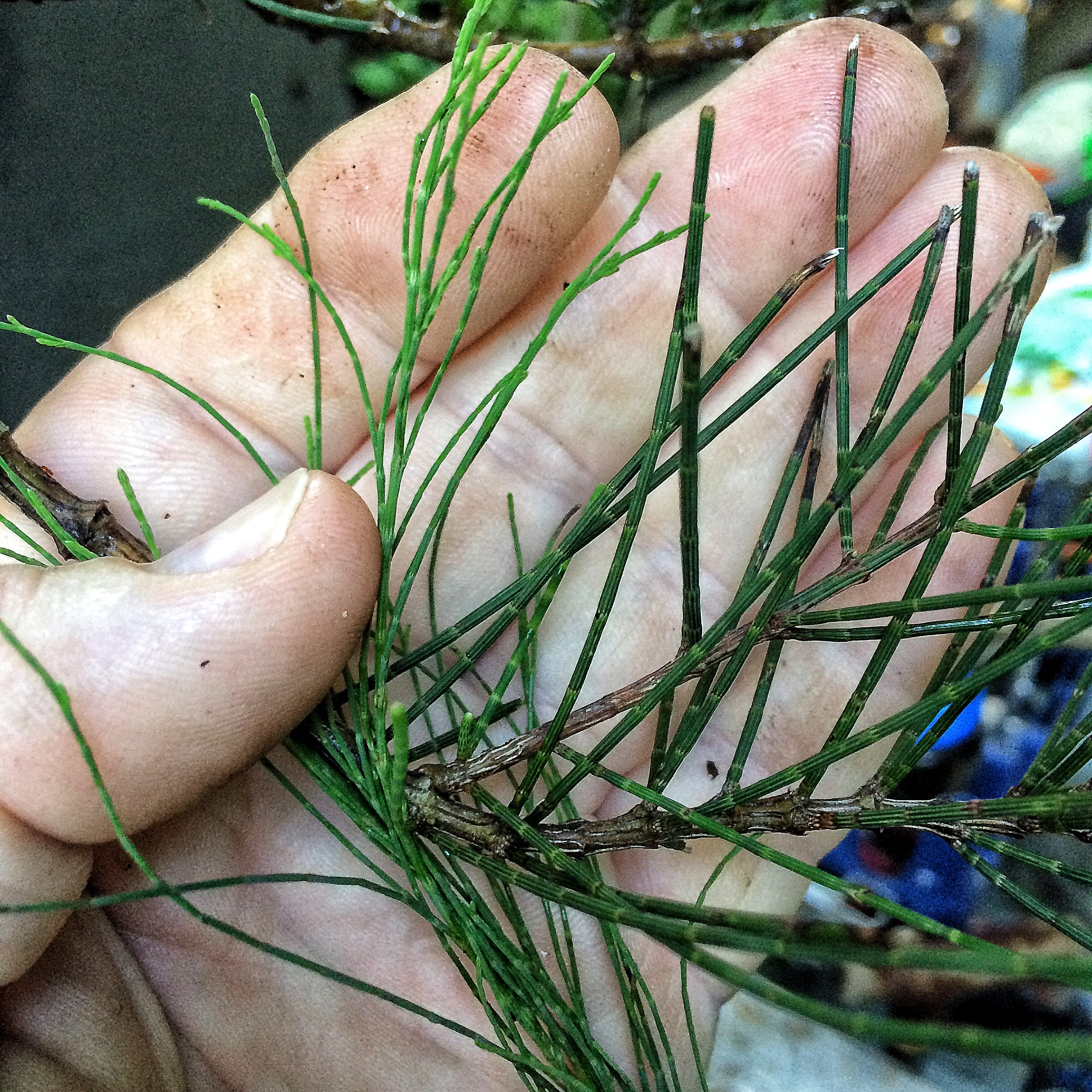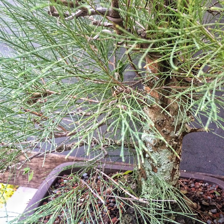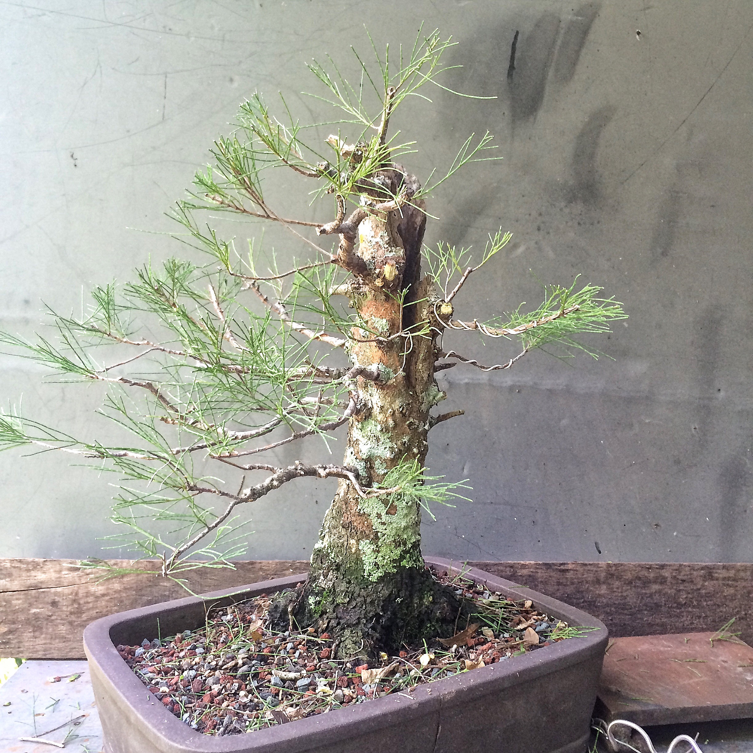 The example above is from a different leaf variety that grows near the Melbourne/Merrit Island FL area. It has considerably thicker needles.    The one I’m working on now is the foliage on the left. The foliage/tree on the right may be one of the monoecious species of casuarinas out there (c. equestifolia is dioecious, meaning that it produces both male and female flowers on the same plant, not requiring an opposite sexed plant nearby to produce viable seeds. Making it a more invasive plant, for obvious reasons). It might be a c. equestifolia subspecies incana, which has thicker needles. It’s also not the best species for bonsai as the foliage is so coarse and doesn’t get very dense except with lots of work.  I’m getting there. This tree belongs to a friend who challenged me and said I couldn’t get the foliage pads dense. Uh huh. Don’t ever say I can’t do something.  I need to repot and wire out some of the newer growth. Tomorrow.