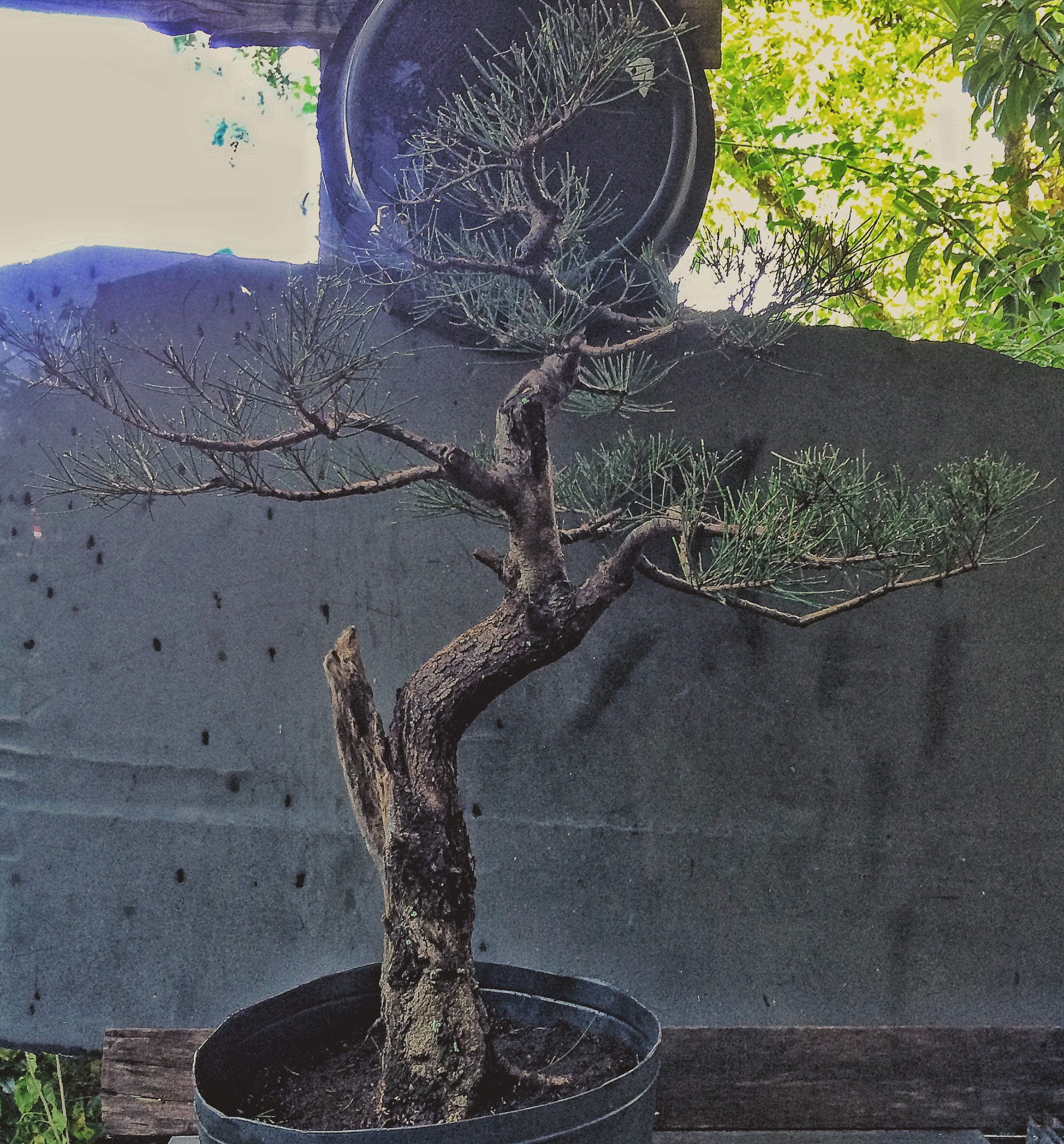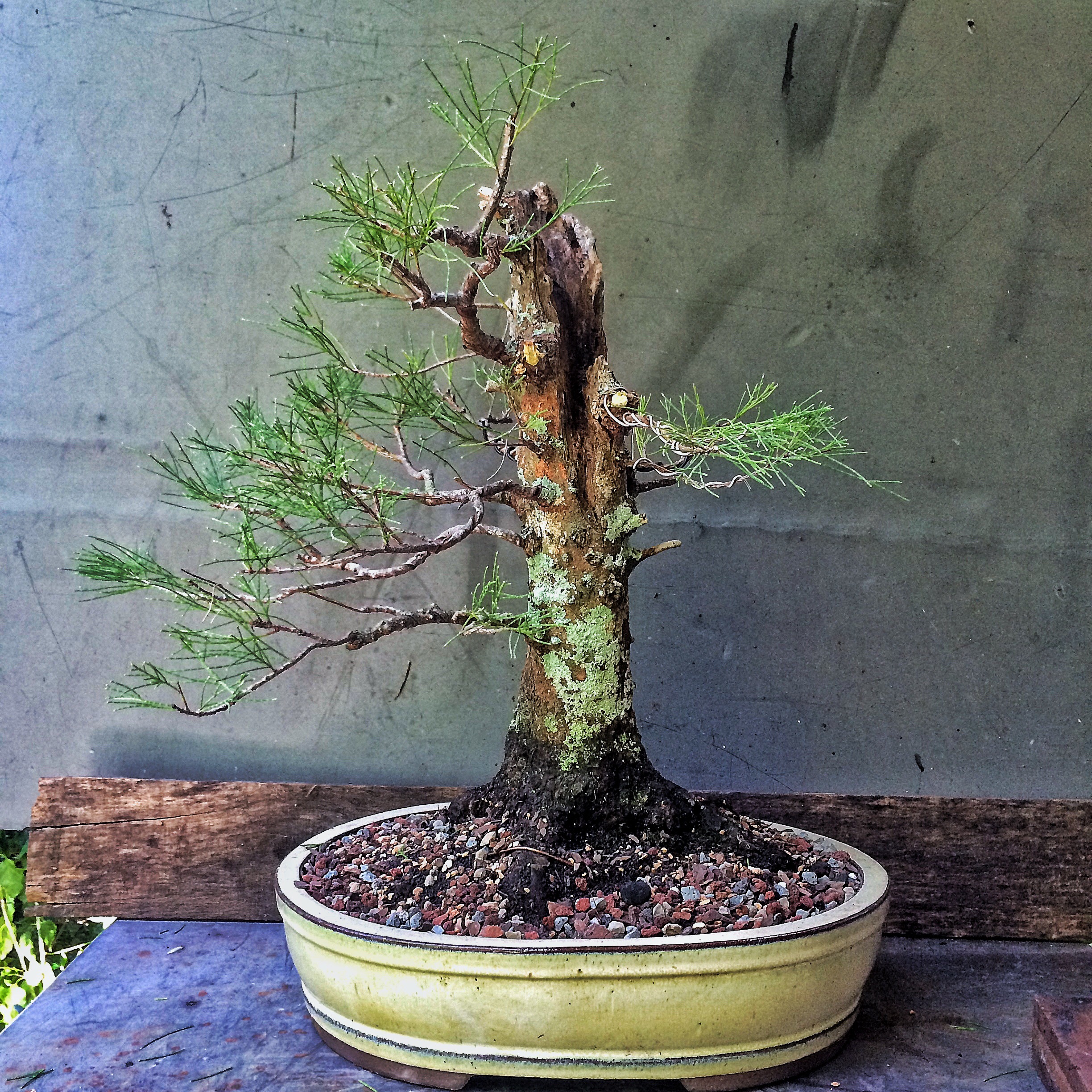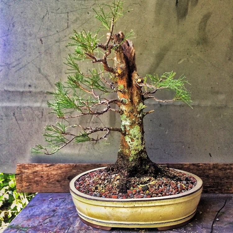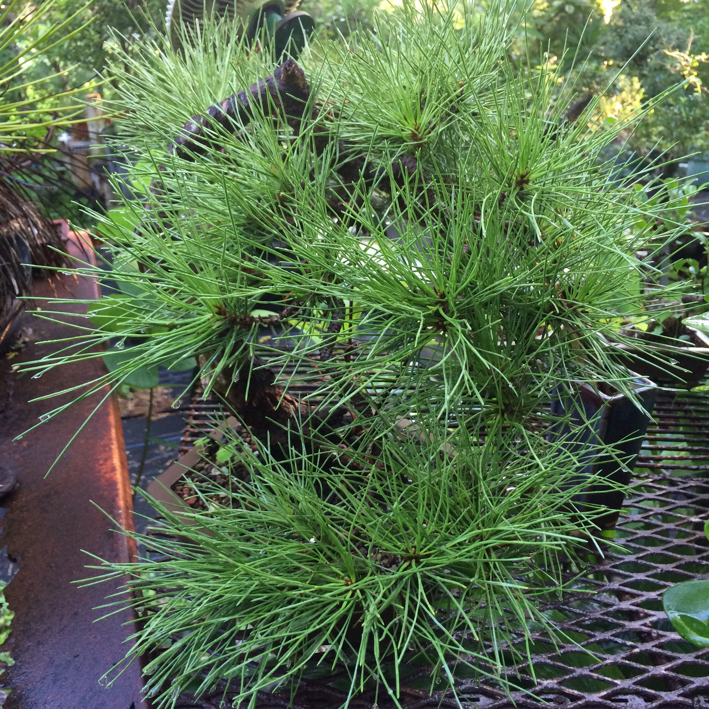 The example above is from a different leaf variety that grows near the Melbourne/Merrit Island FL area. It has considerably thicker needles.    The one I’m working on now is the foliage on the left. The foliage/tree on the right may be one of the monoecious species of casuarinas out there (c. equestifolia is dioecious, meaning that it produces both male and female flowers on the same plant, not requiring an opposite sexed plant nearby to produce viable seeds. Making it a more invasive plant, for obvious reasons). It might be a c. equestifolia subspecies incana, which has thicker needles. It’s also not the best species for bonsai as the foliage is so coarse and doesn’t get very dense except with lots of work.  I’m getting there. This tree belongs to a friend who challenged me and said I couldn’t get the foliage pads dense. Uh huh. Don’t ever say I can’t do something.  I need to repot and wire out some of the newer growth. Tomorrow.