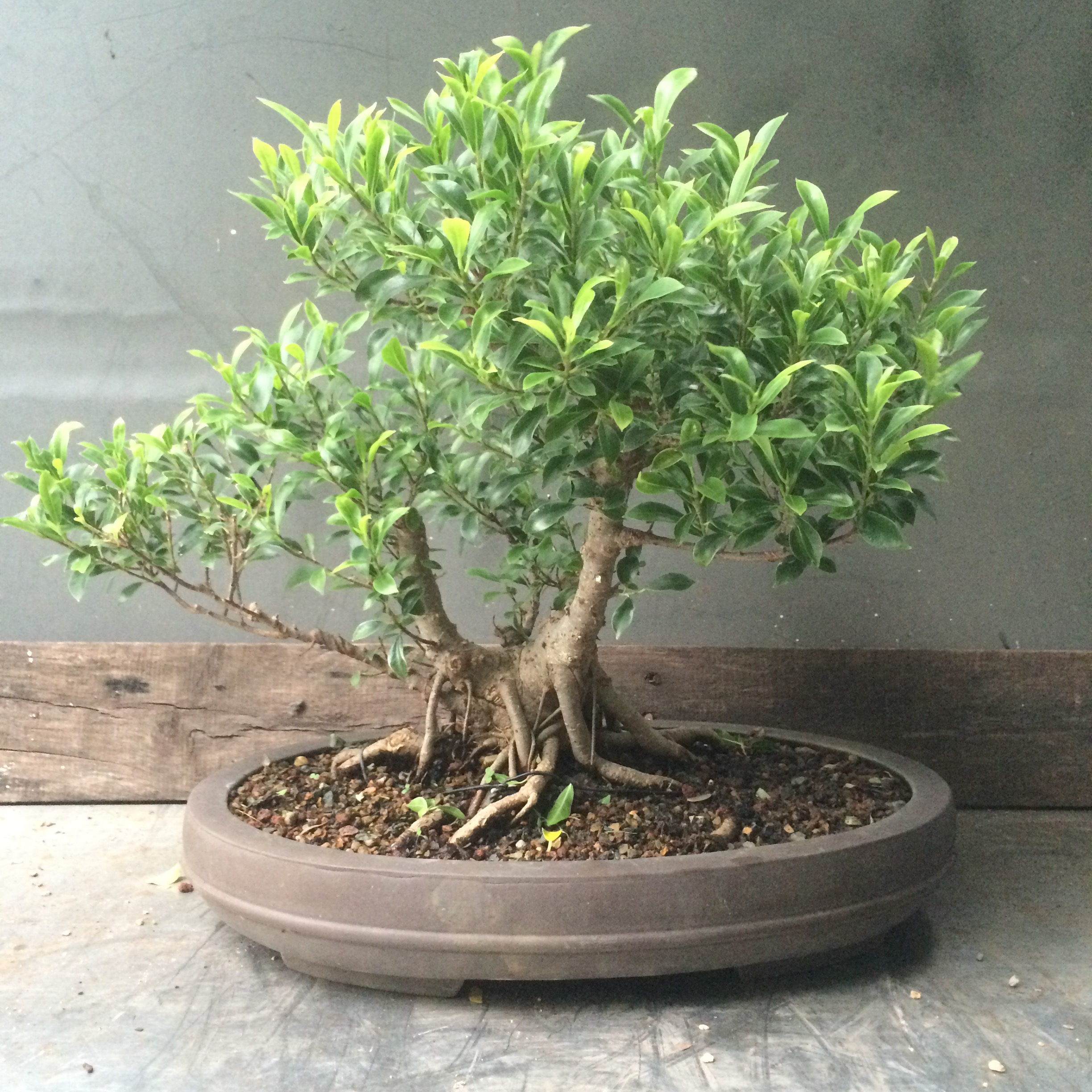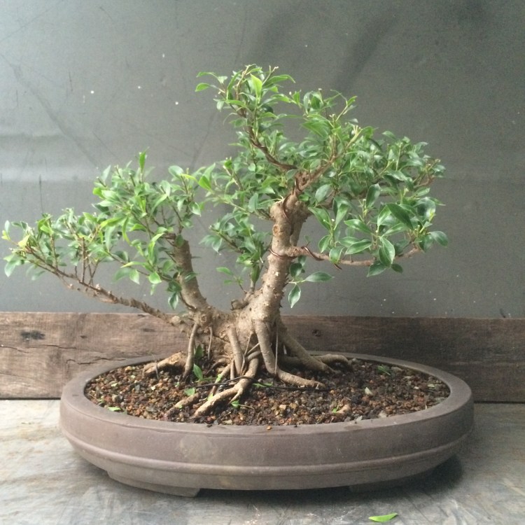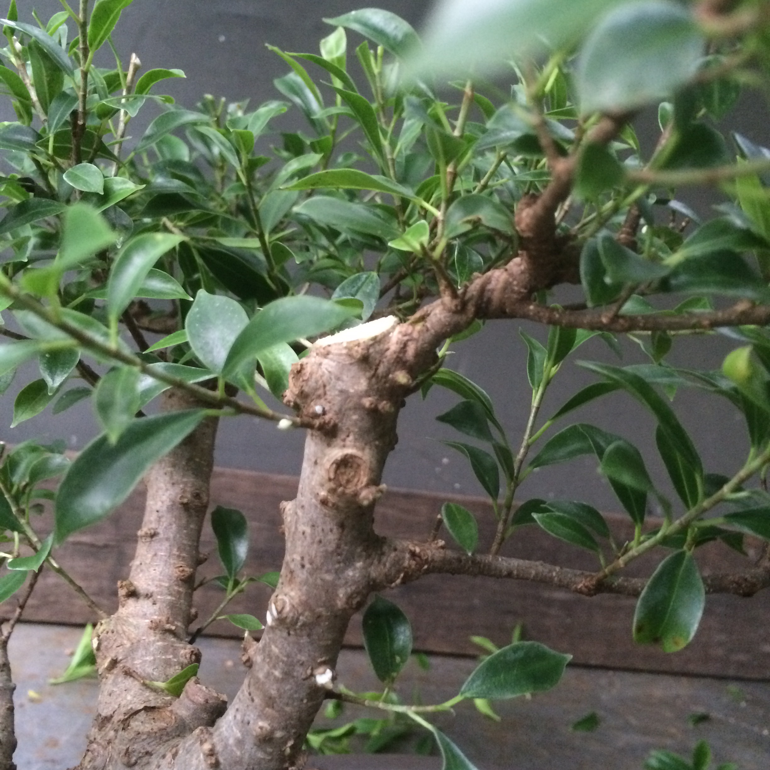 Attend to exhibit “A” on the left! A ficus microcarpa “melon seed”. A spectacular varietal dwarf that is causing a mild stir in the tropical bonsai culture because it has such tiny leaves.