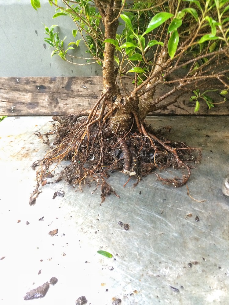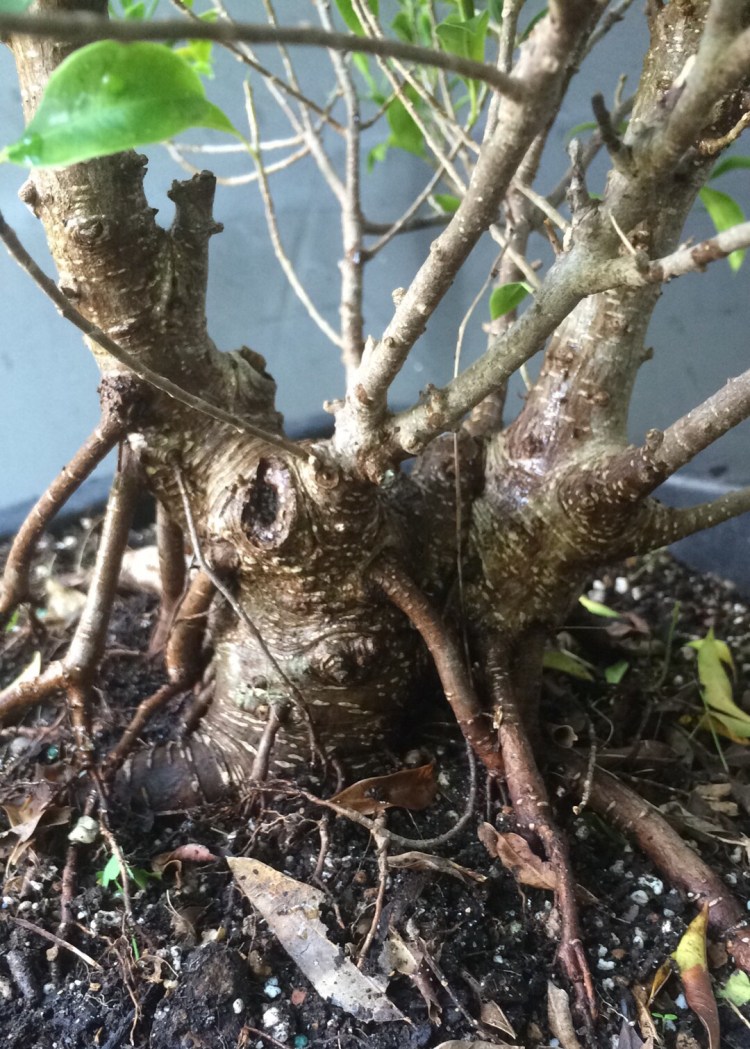 Ficus are clever in the fact that they have big, fleshy roots used for energy storage (for getting through those long winter nights so common in the tropics……?) and we find a few that must be excised (not to worry, the trunk is, as well, an excellent container of energy for our intrepid and much (about to be) abused fig (for, as you know, dear reader, a ficus is a fig is a ficus the world over, and under as well, as they say in Hades, “A flight of figs ease fear for the fallen”).