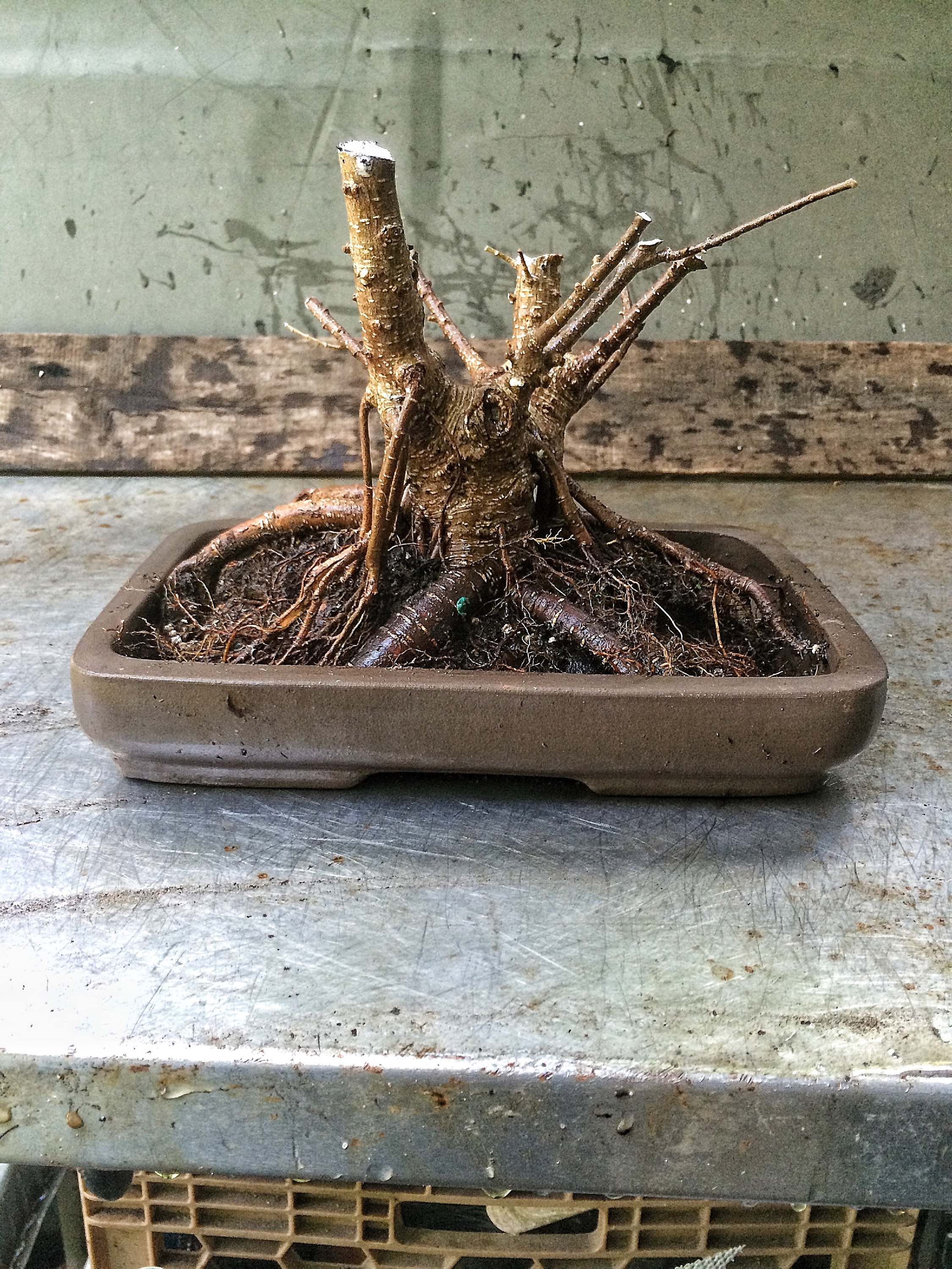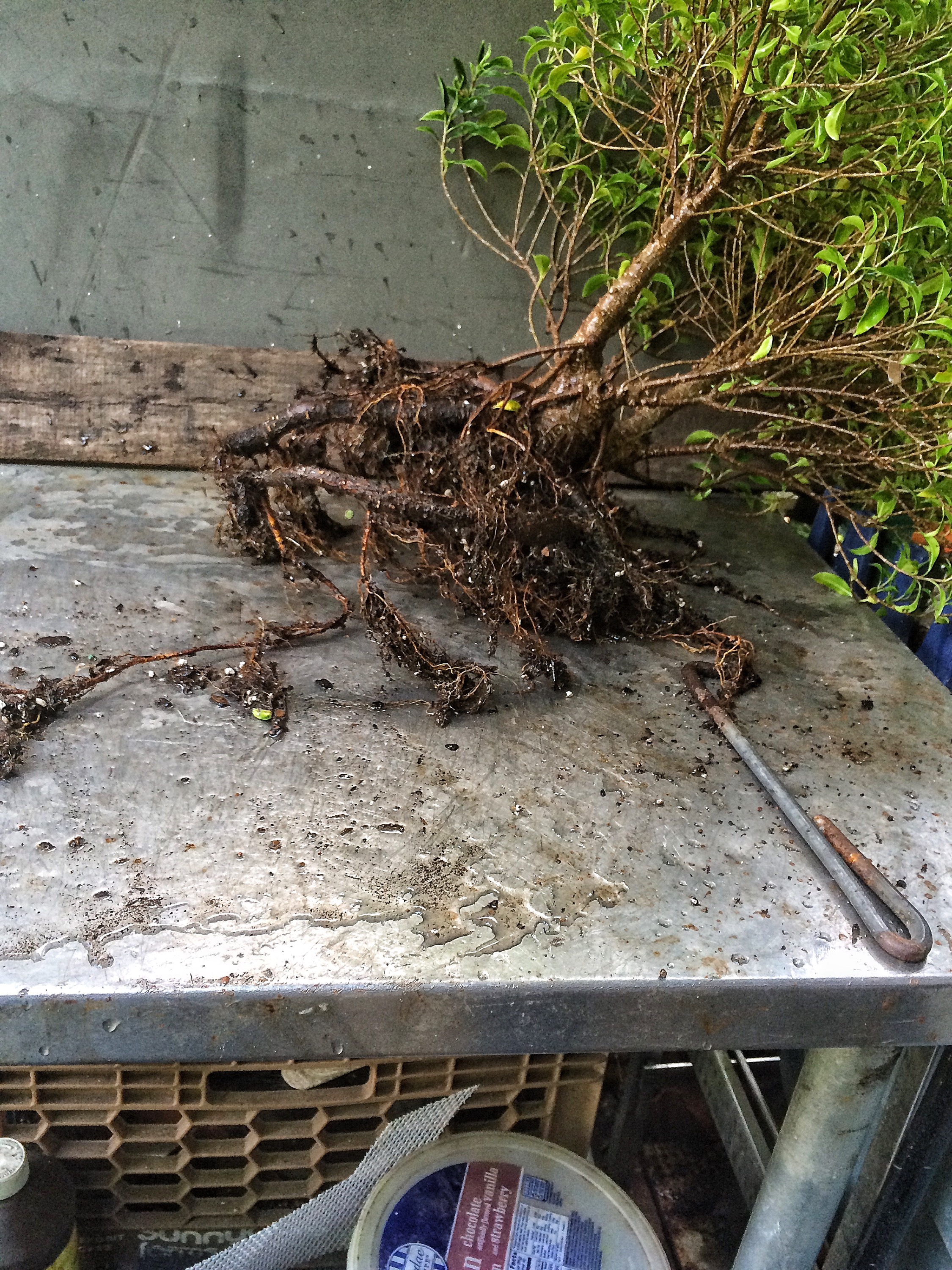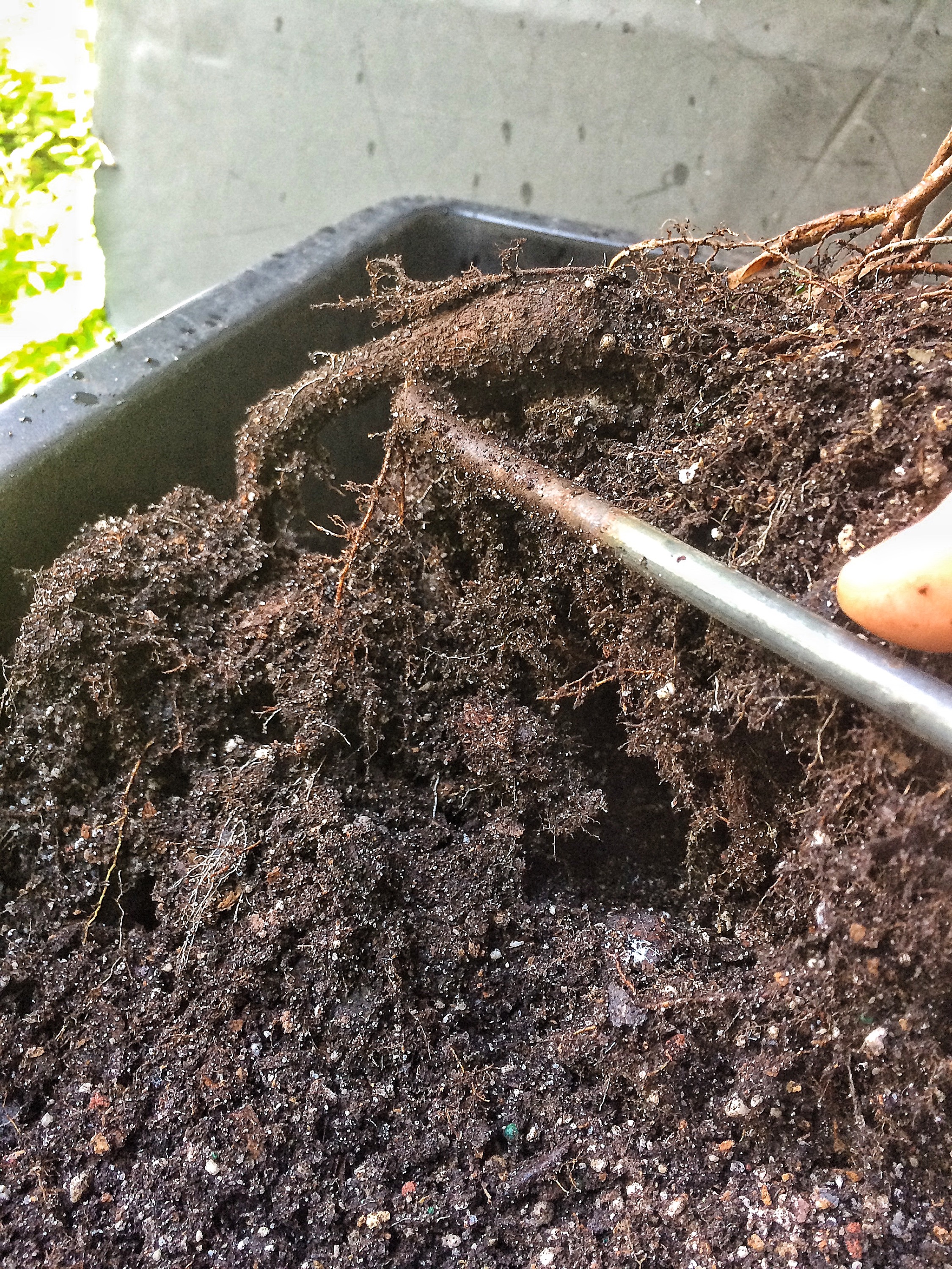 So now, ladies and gentlemen (and Bertha) the time has come for the magic to be revealed. For that astounding feat of ingenious plant craft we like to call, rather plainly, actually, the “put it in the pot to see if we need to cut any more roots” part of the demonstration.
