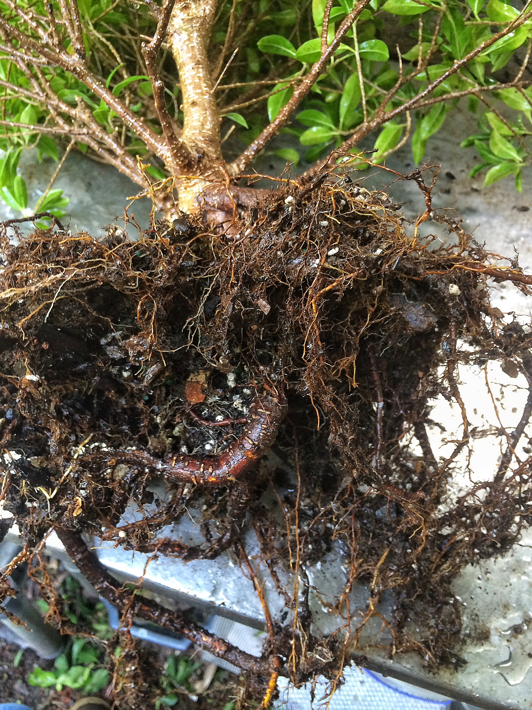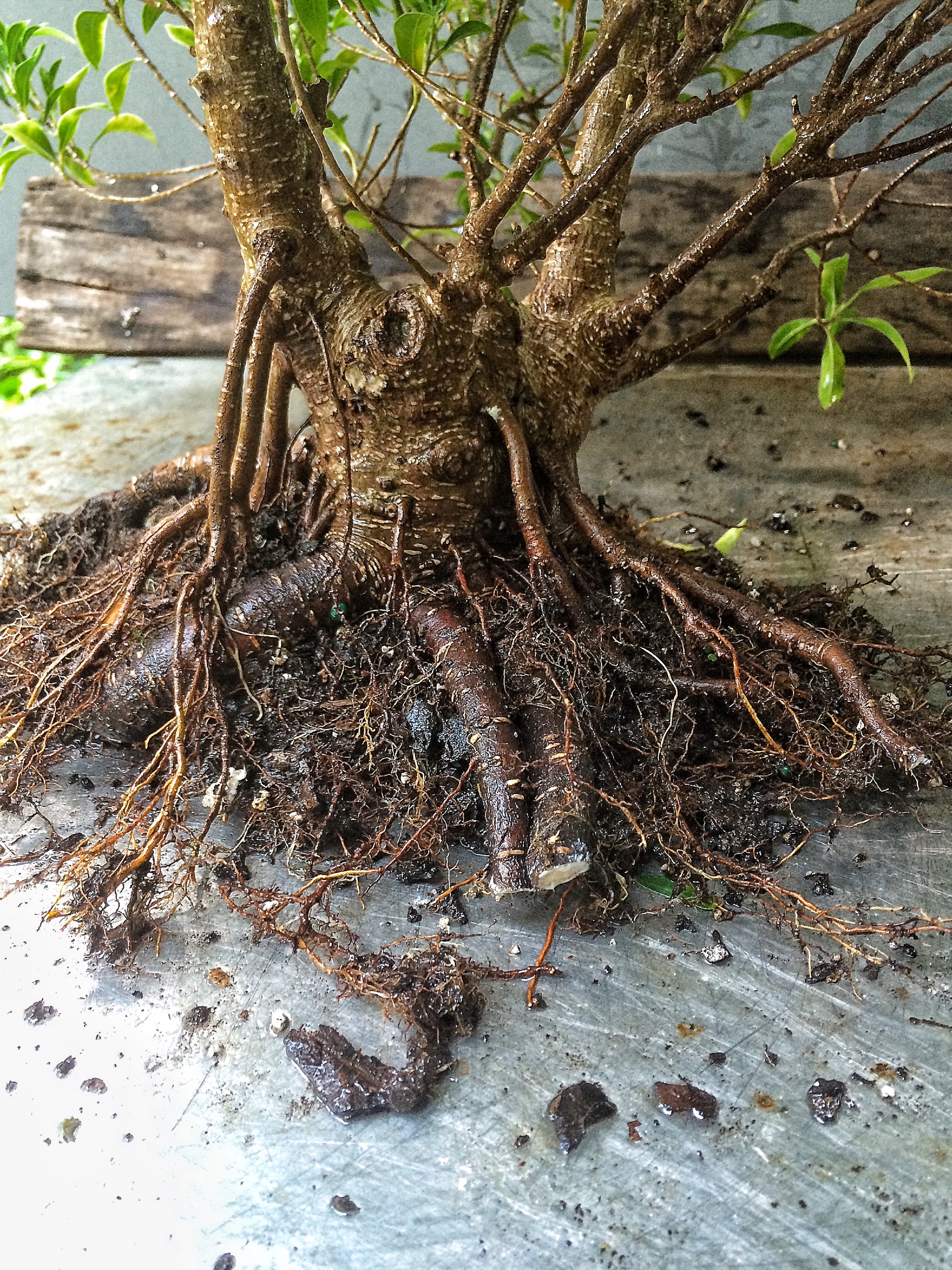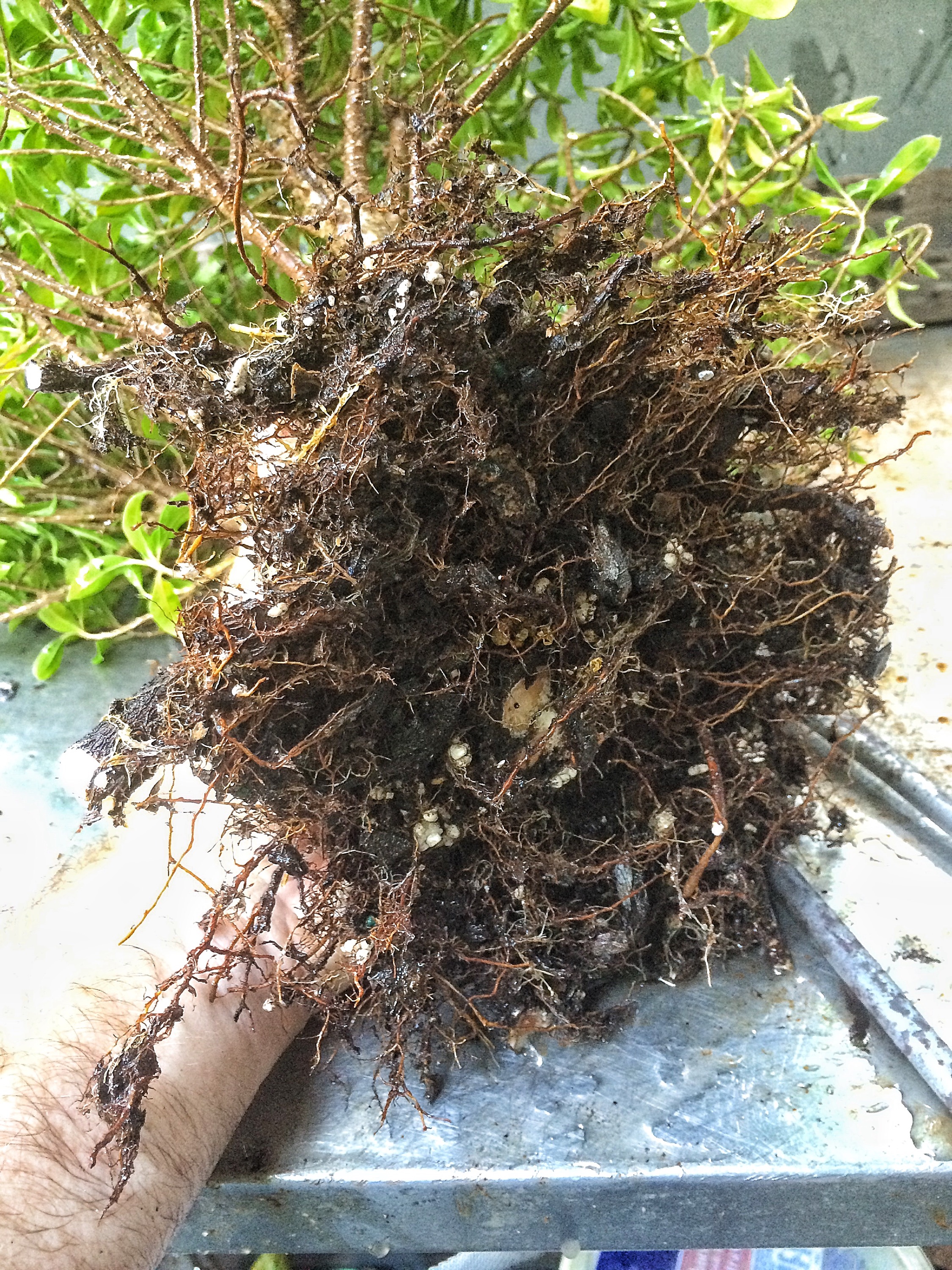 So now, ladies and gentlemen (and Bertha) the time has come for the magic to be revealed. For that astounding feat of ingenious plant craft we like to call, rather plainly, actually, the “put it in the pot to see if we need to cut any more roots” part of the demonstration.