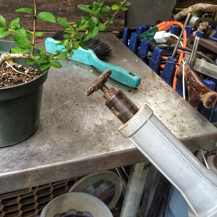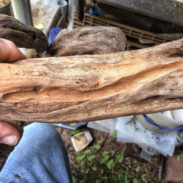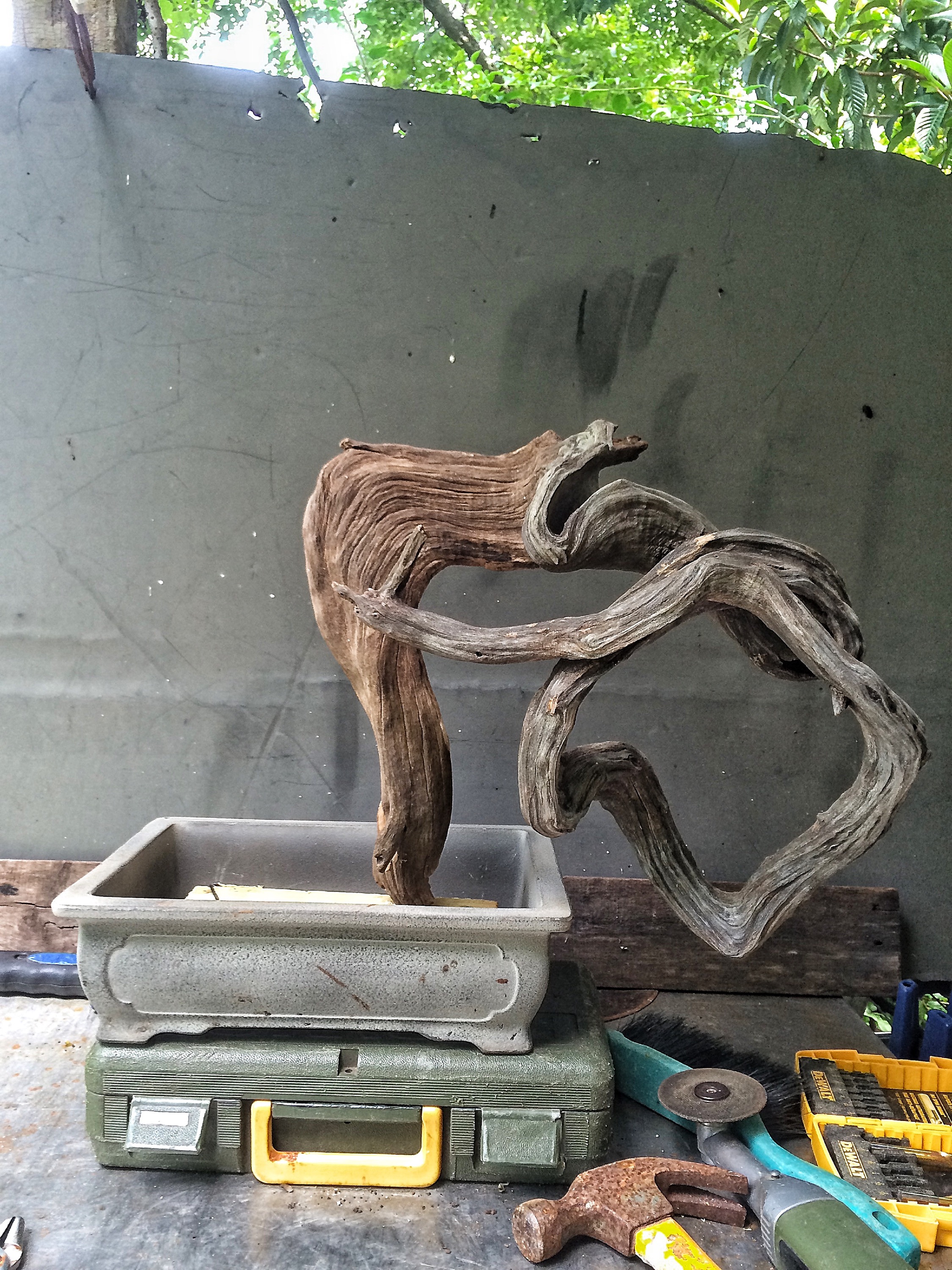 If you haven’t figured it out yet, I am putting together what is called, variously, a Phoenix graft or, as the Japanese say, a tanuki (after the trickster raccoon with giant balls. I assume they call it that because it takes great testicular fortitude to try to pass off a tree that isn’t really an “honest” tree). Basically, we take a piece of deadwood and, somehow, amazingly, cause a living branch to attach itself to said deadwood. In other words, the premna will be inserted into the groove (I layed down) and allowed to grow, and hopefully, expand enough to begin growing over the deadwood.