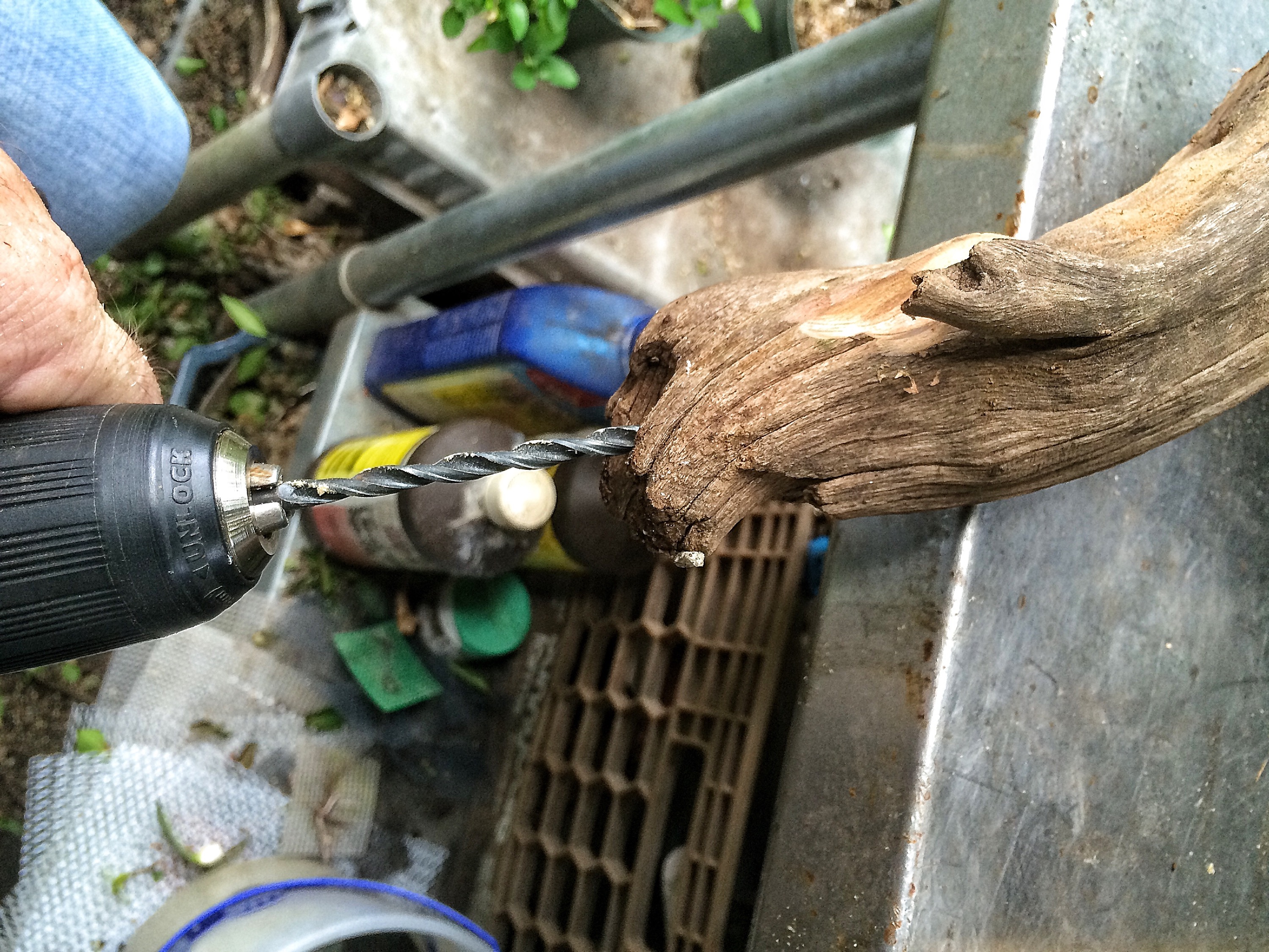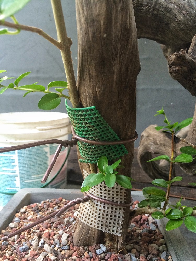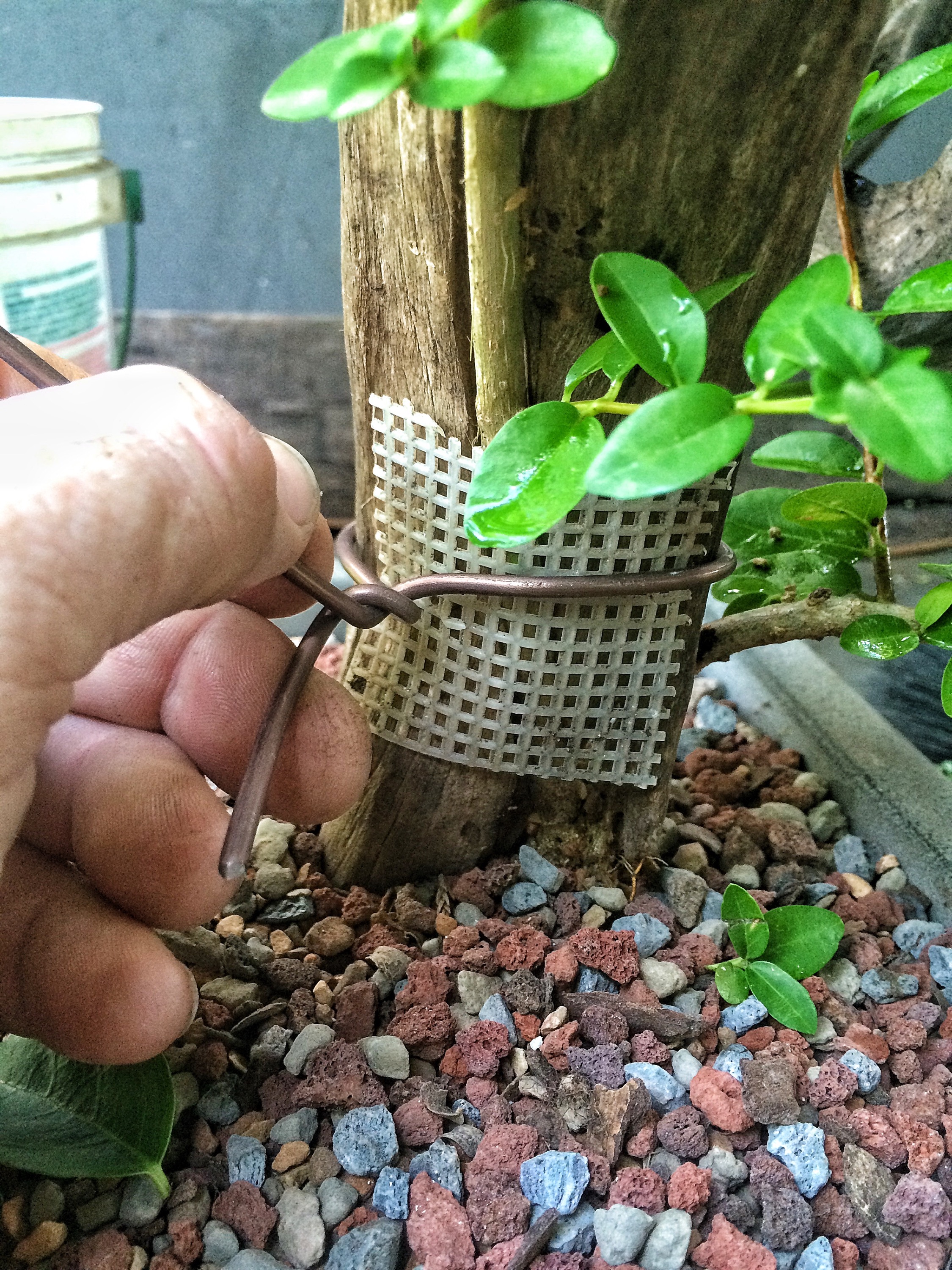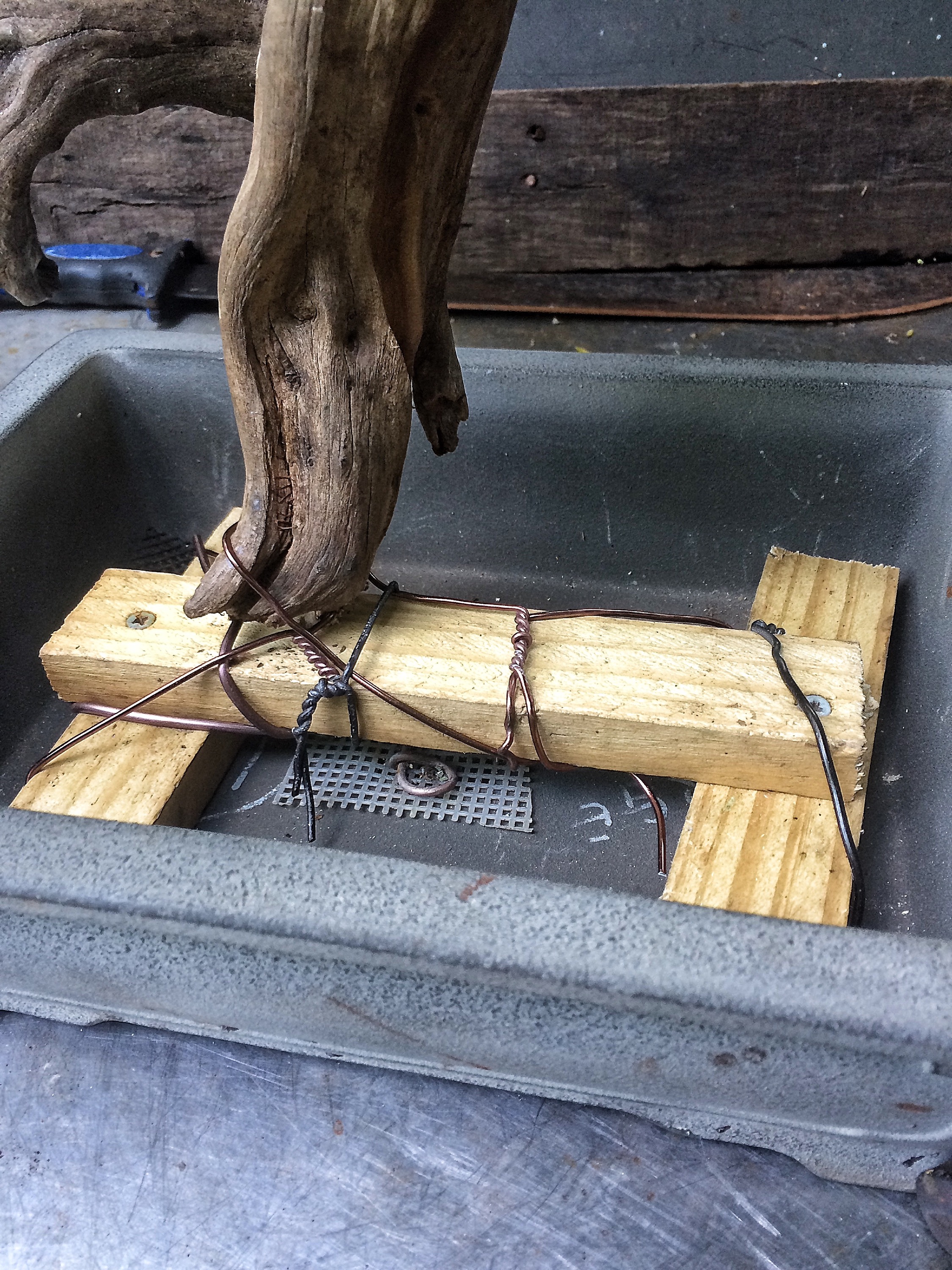 That should work. I’m pleased that I couldn’t find my staple gun or any thumbtacks, which is the usual way Phoenix grafts are performed. This method of attachment will keep the premna inside the groove (that I layed down, so soulfully, baby) and won’t mar the surrounding deadwood. I’m liking it. Now for some initial wiring (which I’m sure will need to be redone several times in the future)
