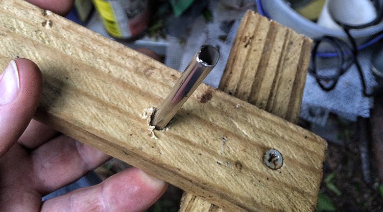 Drill a hole into the bottom of the deadwood that will then accept the aluminium chopstick.