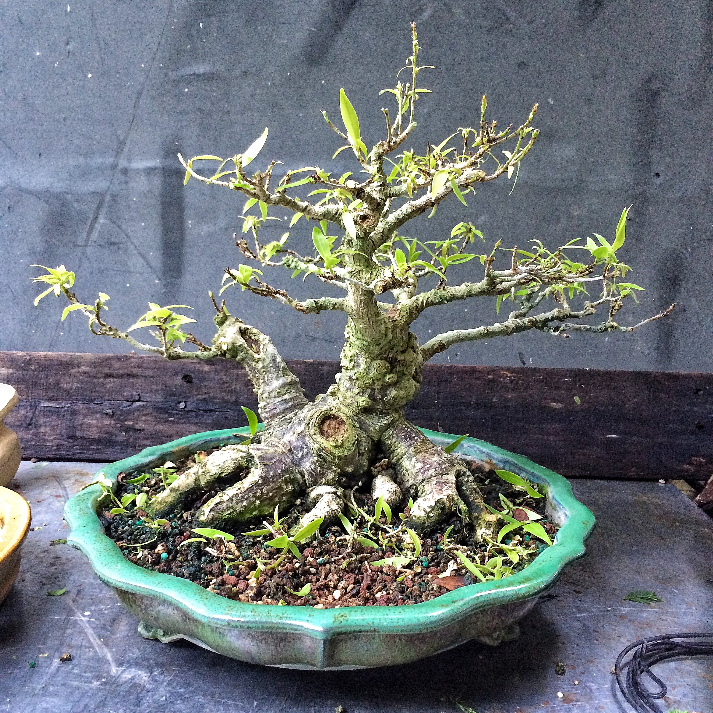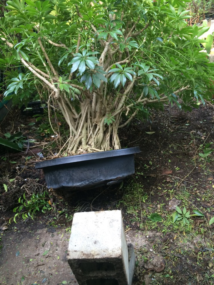 Anyway, Johnathan had to cut the tree out of the ground (it’s a schefflera arboricola, a dwarf umbrella tree. Most of the time they are not very good bonsai; it takes a huge trunk with copious aerial roots to really begin to look tree-like, or they sometimes work as a forest planting) I had had the tree sitting on a wooden pallet and, in those ten years, the tree sent roots down into the earth and subsumed the pallet, crushing it beneath itself. Growing into the ground really helped the development. This one looks like a huge banyan tree to me. I’m even going to brag a bit and say that it’s the best trunk I’ve seen on one, ever. But that might just me being a proud papa. It’s a little tall