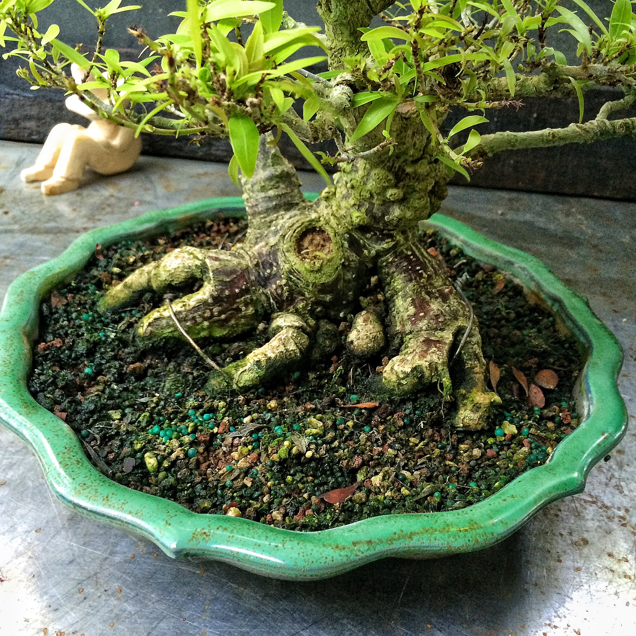 Yeah, it took ten years to grow that trunk to my satisfaction. It was about the same height when I got it from my first teacher, Ray Aldridge. He was closing his nursery at the time and he gave it to me. Ten years of no bonsai techniques at all. Just topiary trimming once a year (it was at the entrance to The Nook so it was trimmed so I could see if someone was sneaking up on me)