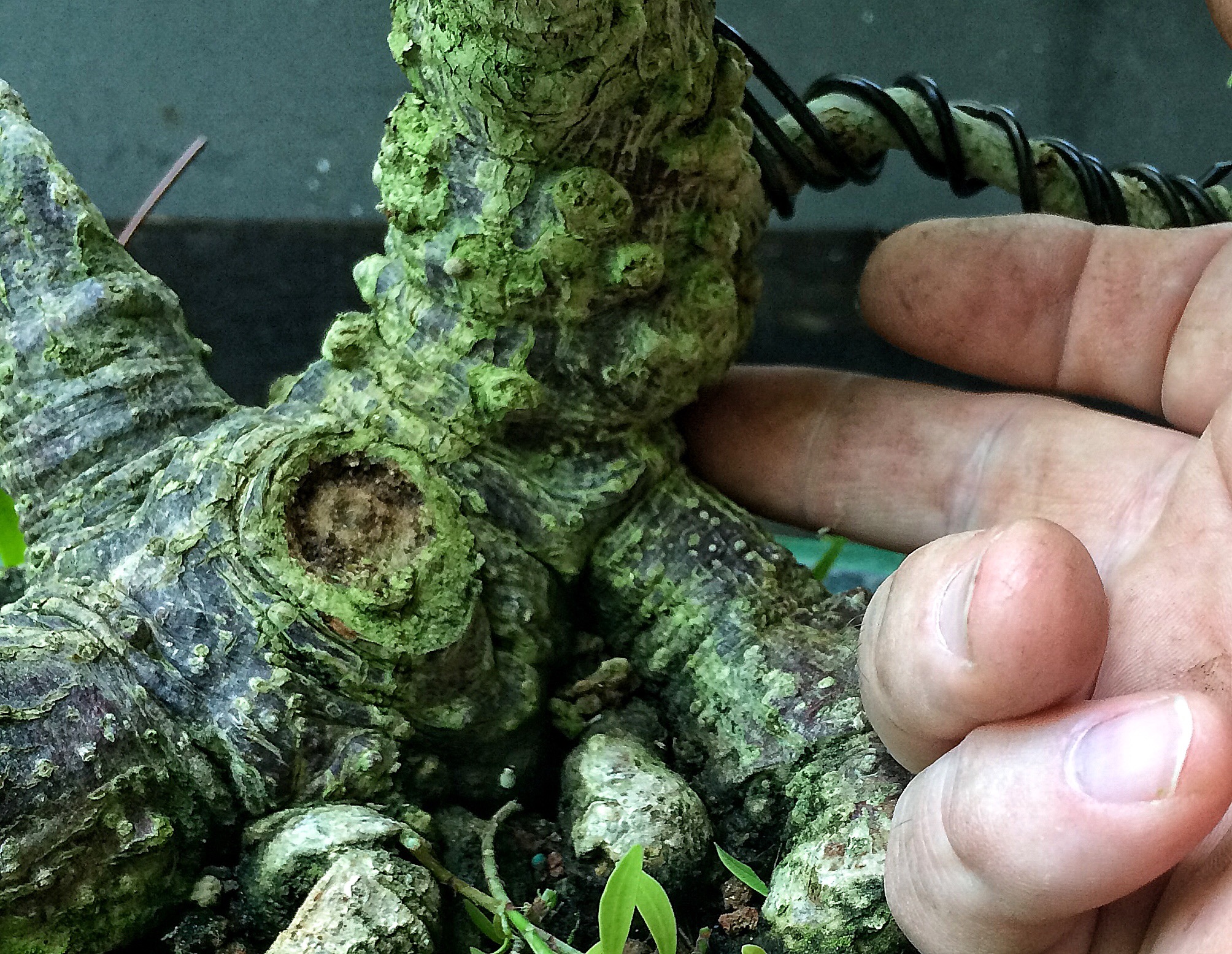 When I got the tree, you could see through the trunk and those aerial roots. Not so much now. I hadn’t really looked at it closely until Jonathan pulled it out of the ground. Wait!? You don’t know Johnathan yet? He’s my new student, apprentice really.