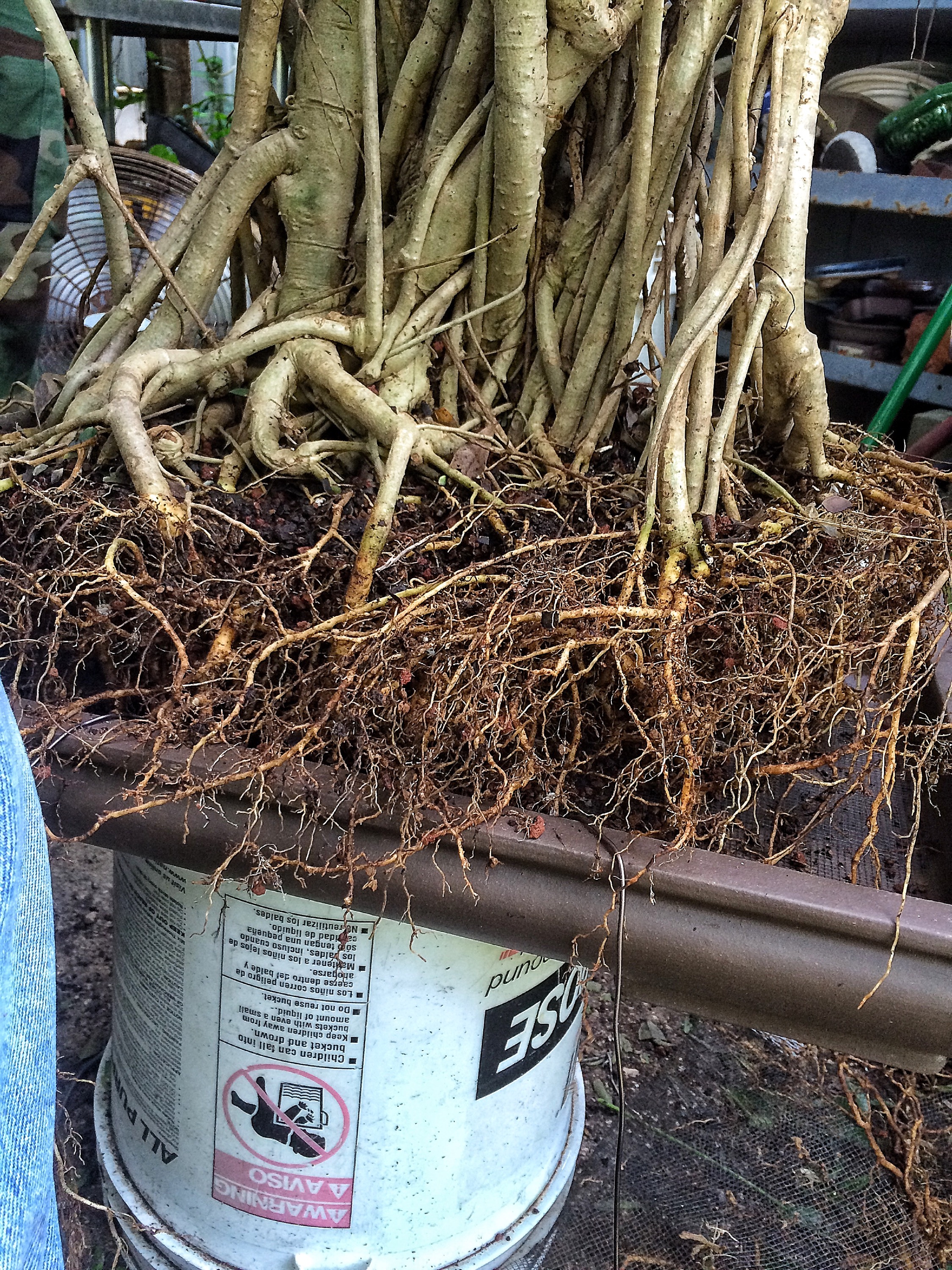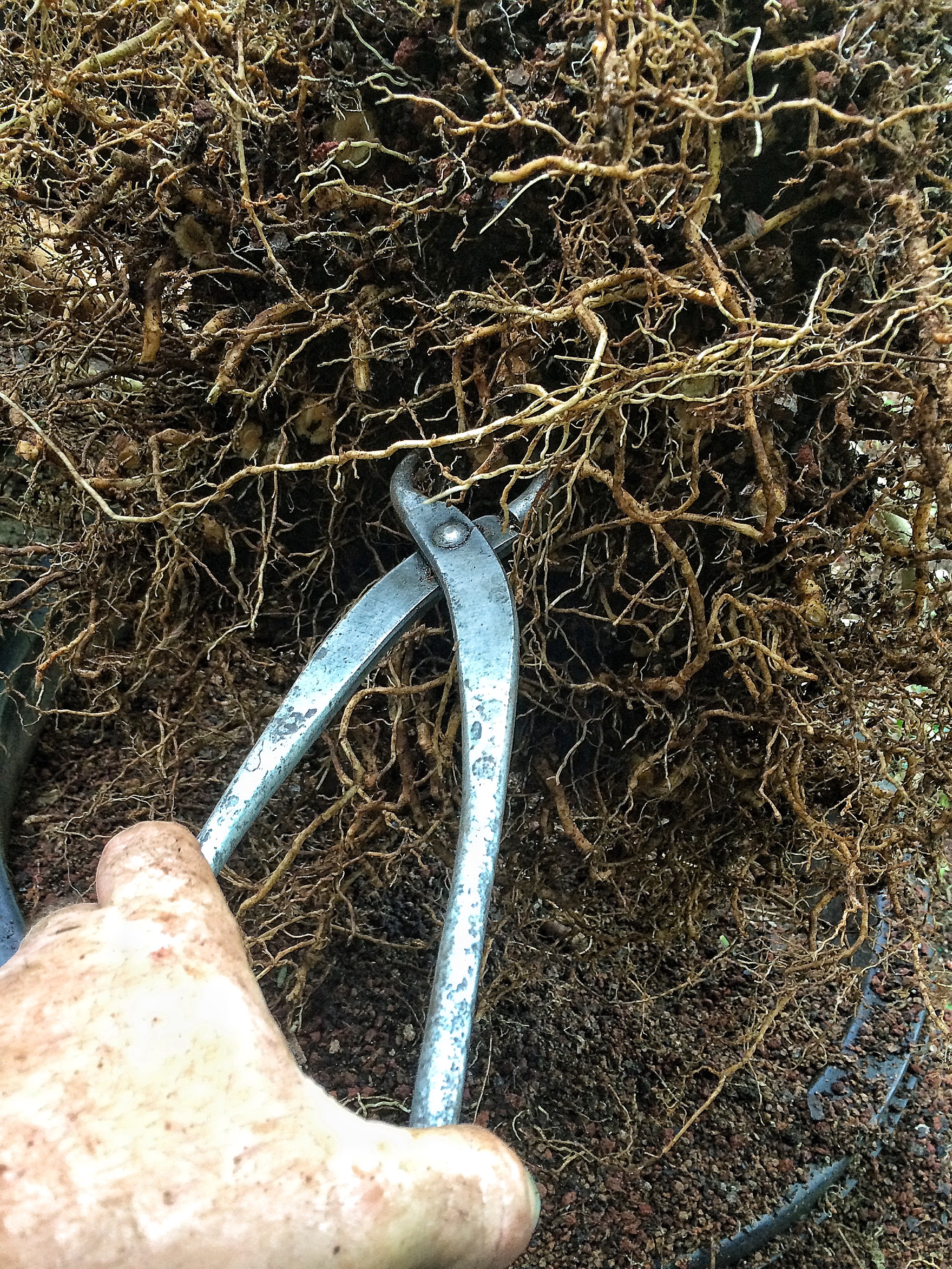 When cutting back tropical and deciduous trees for their first bonsai pot (and only if they’ve been strong growing and untouched for years) I always cut those downward growing roots as high up in the rootball as I can. Even if I’m putting it into a deeper pot (unlike this operation) I’ll cut them as though they’re going into a shallow pot. The reasoning is this: the tree, after all those years of strong growth, won’t have as much energy as it does now (when you begin growing a tree as a bonsai, it tends to weaken it to a degree) and gradually reducing the big roots (as many people teach) is like death by a thousand paper cuts. I should note that even though I am in Florida, I still should have done this root pruning last month, at the latest (it’s September now, so cross your fingers). Always do work in the correct season. I’m confident that the strength of this tree will get it through. But don’t you do it. Especially those of you in the Great White North.