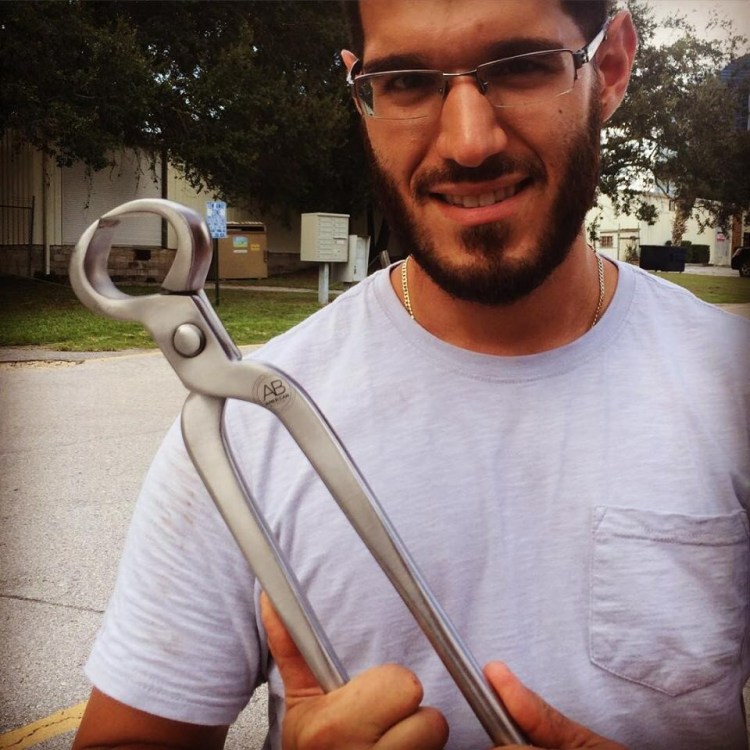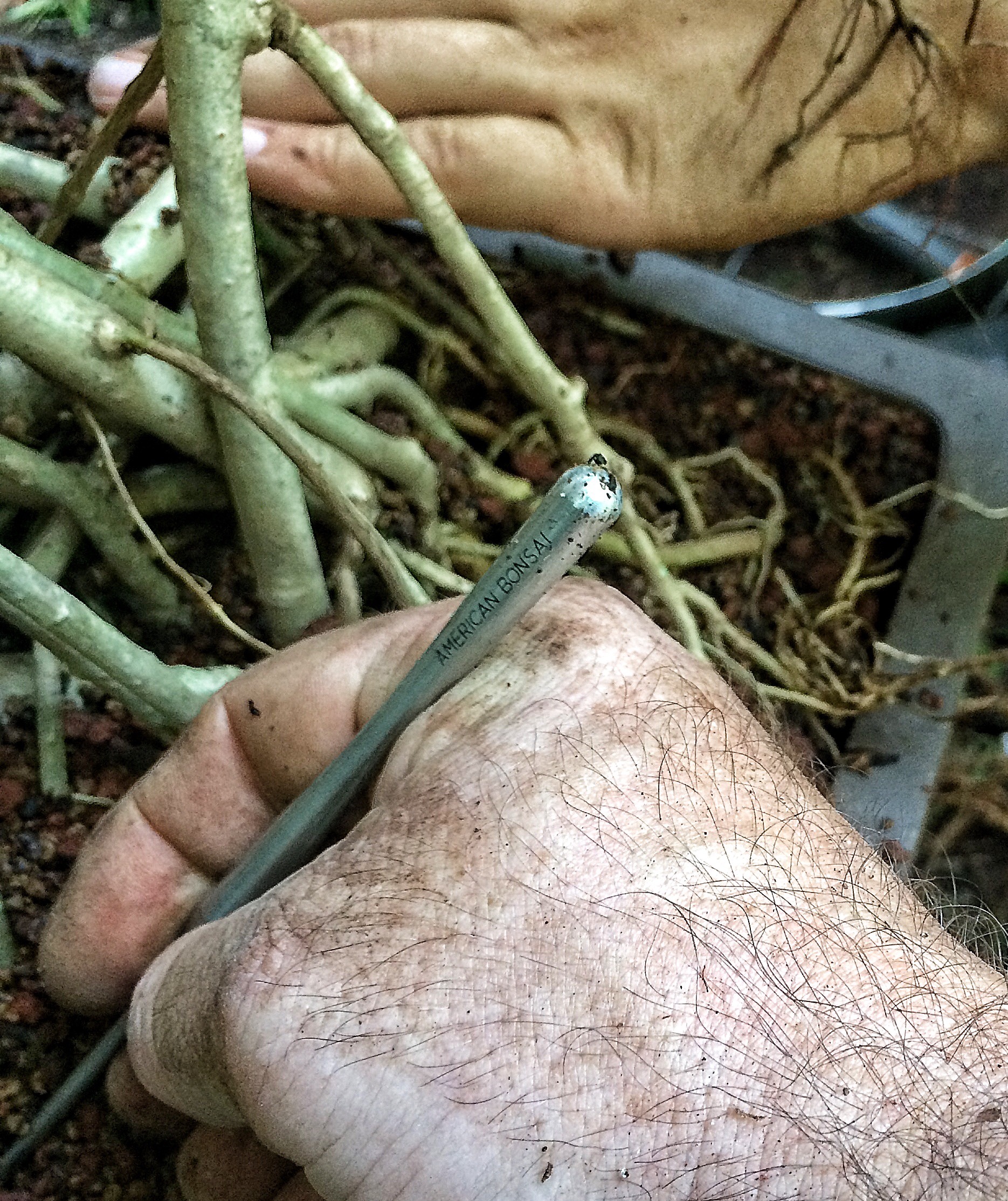 Here he is modeling the new Series 16 flush cutters from American Bonsai Tools. He wants to learn and, more importantly, wants to help. I can’t lift quite what I usta coulda and he helps with that. It’s kind of frustrating, having this ileostomy (which is basically a controlled, purposeful hernia; my small intestine is poking out of my abdomen. It makes it a challenge lifting. I have nightmares of my intestine popping out of my stomach like a jack-in-the-box or the old nuts-in-a-jar gag. BOING!)