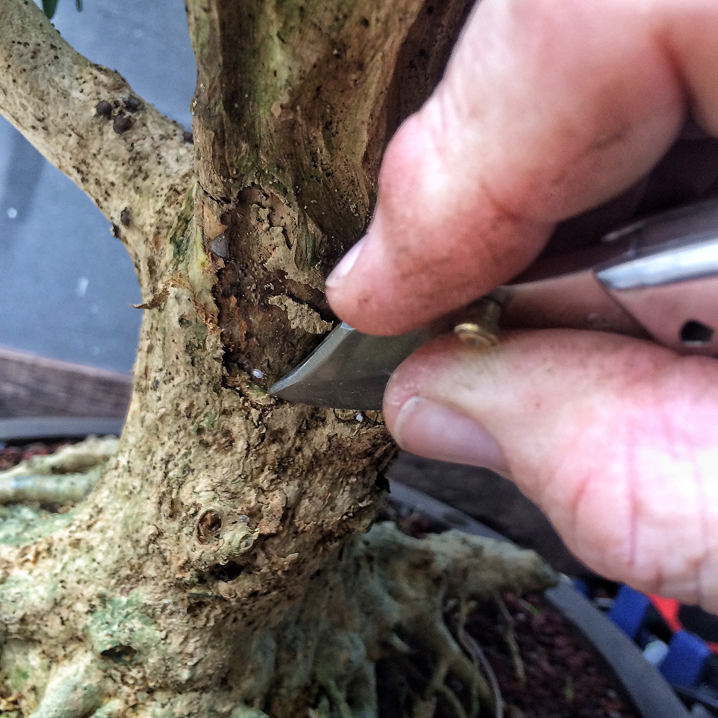 On the boxwood, that means the new growth has turned from light green to dark green and the leaf has actually hardened, it’s waxy and shiny. The new growth is almost rubbery (called “succulent” by horticulturists and gormands…well, not gourmands, unless they’re talking about roast duck) and dull. You’ve seen this tree before (click here to see its wonderful and amazing journey, filled with sketches, diagrams and 9×10, full color, glossy photographs to illustrate the story, there’s even a video with some awesome music here) I’m going to clean and treat the deadwood and define the live vein.