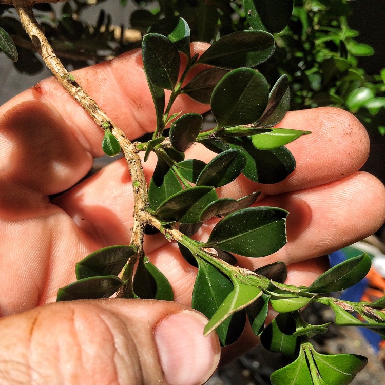 Watch the Facebook or Instagram feeds for updated pics, I expect it to pop new growth pretty quickly. Fertilizer, light water and slight shade (for today, just to protect from sunburn on the branches with the heavy pruning I just did. But, in the winter, full sun, cold winds and boxwoods don’t go together. Those two things, cold and full sun, cause the boxwood to catalyze the chlorophyll in the leaves and turn it to beta carotene, changing them from green to orange. If this happens, you need to remove the orange leaves or they could kill the branch). And that’s all for today.