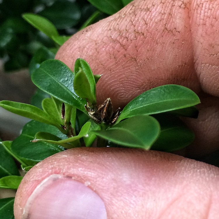 This is the new bud on a boxwood. The spearpoint looking thingy (technically the shape is called a a bodkin point, a spear/arrowhead point designed for piercing armor).