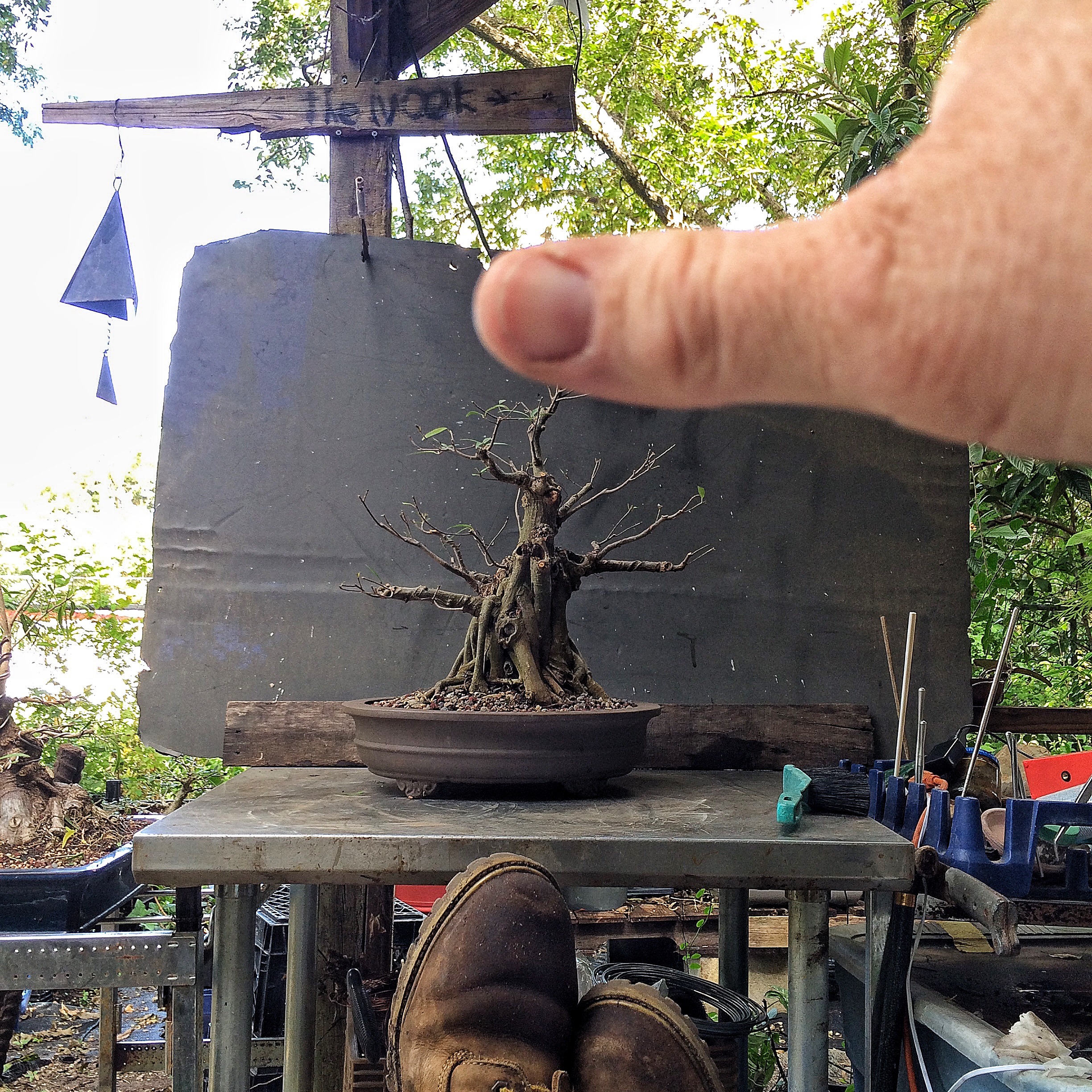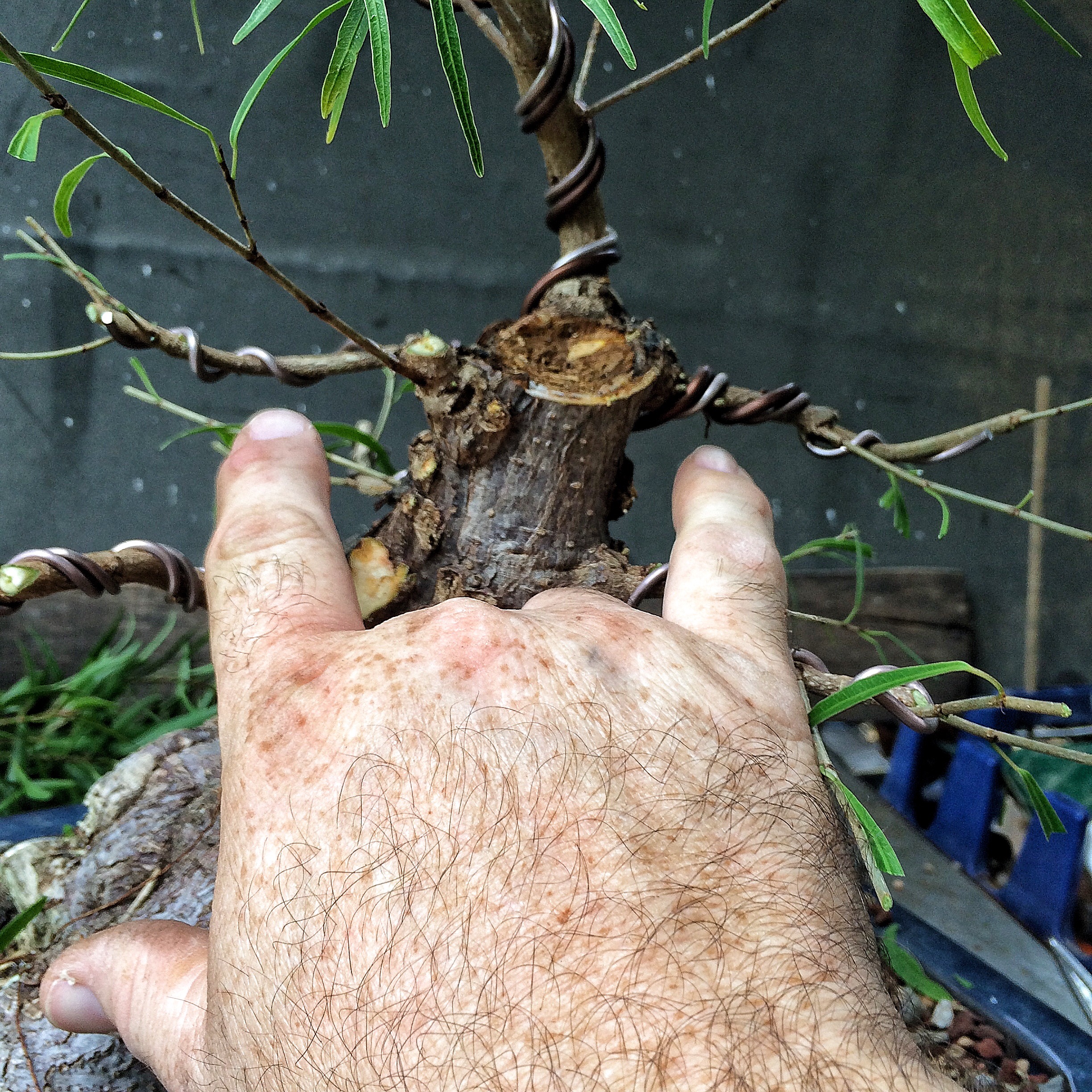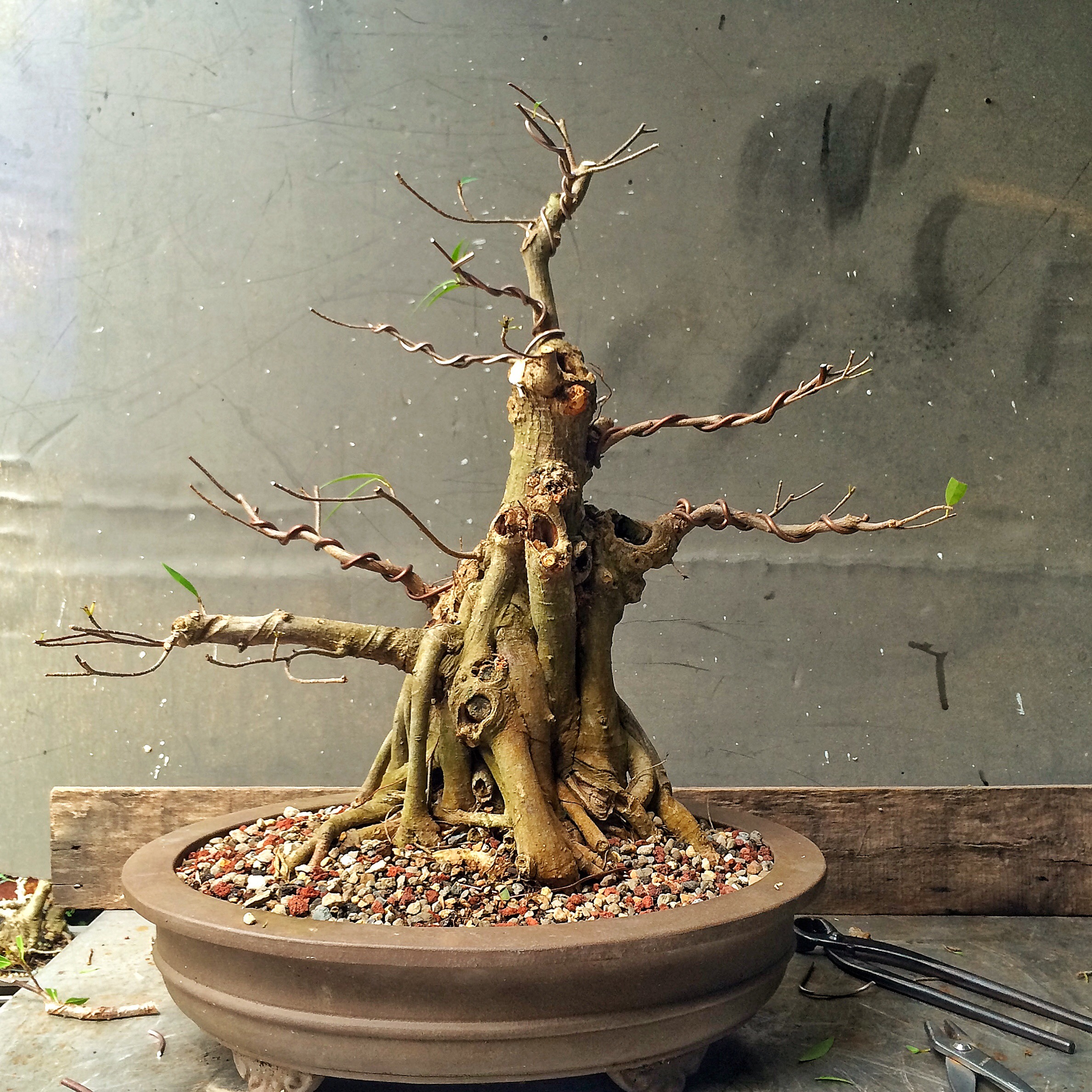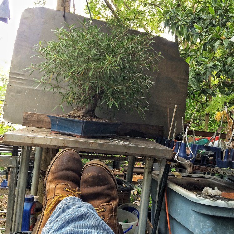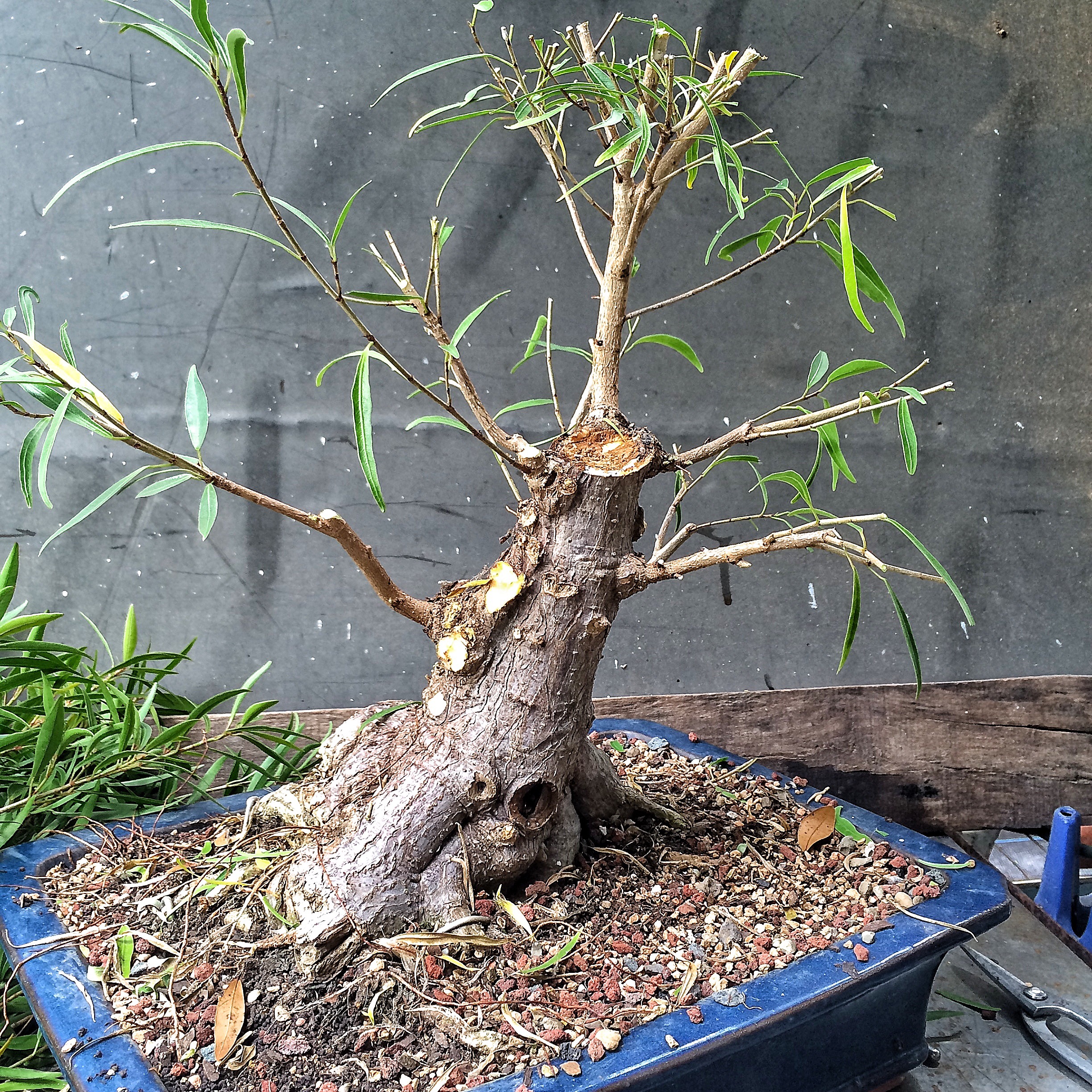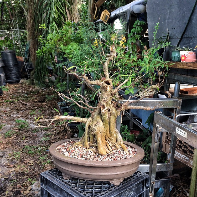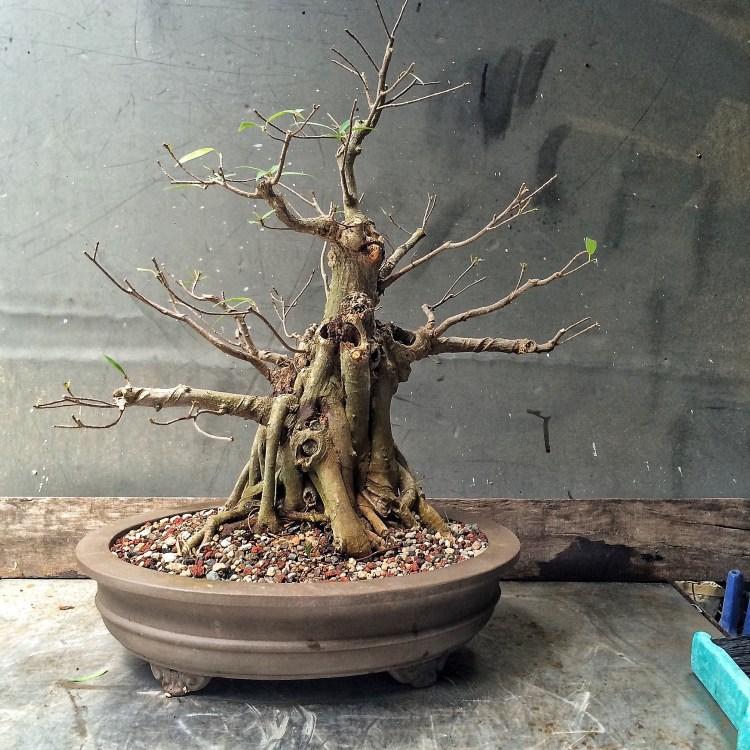 You have seen this tree before. It involved a trunk chop I believe. I just can’t find the link. Sorry. I have failed you, miserably, as the curator of my own work (I seriously need a manager. Someone to tell me where to go, to talk to venues, clubs and promoters for me. Most importantly, to deal with enumeration and amenities. Any takers?) I suppose I should begin. Oh, I’ll be working on this fat bottomed tree too. Another Willow leaf ficus.