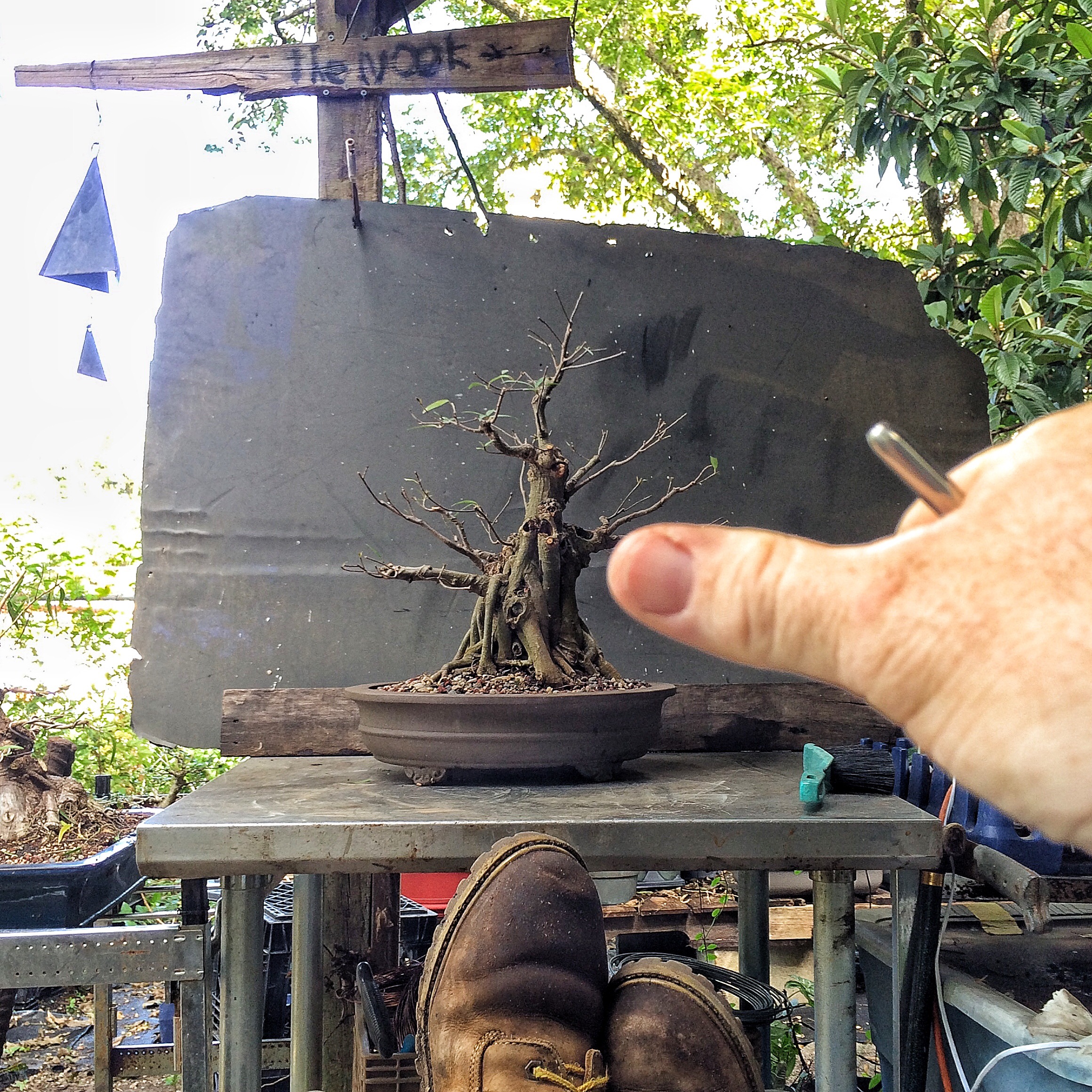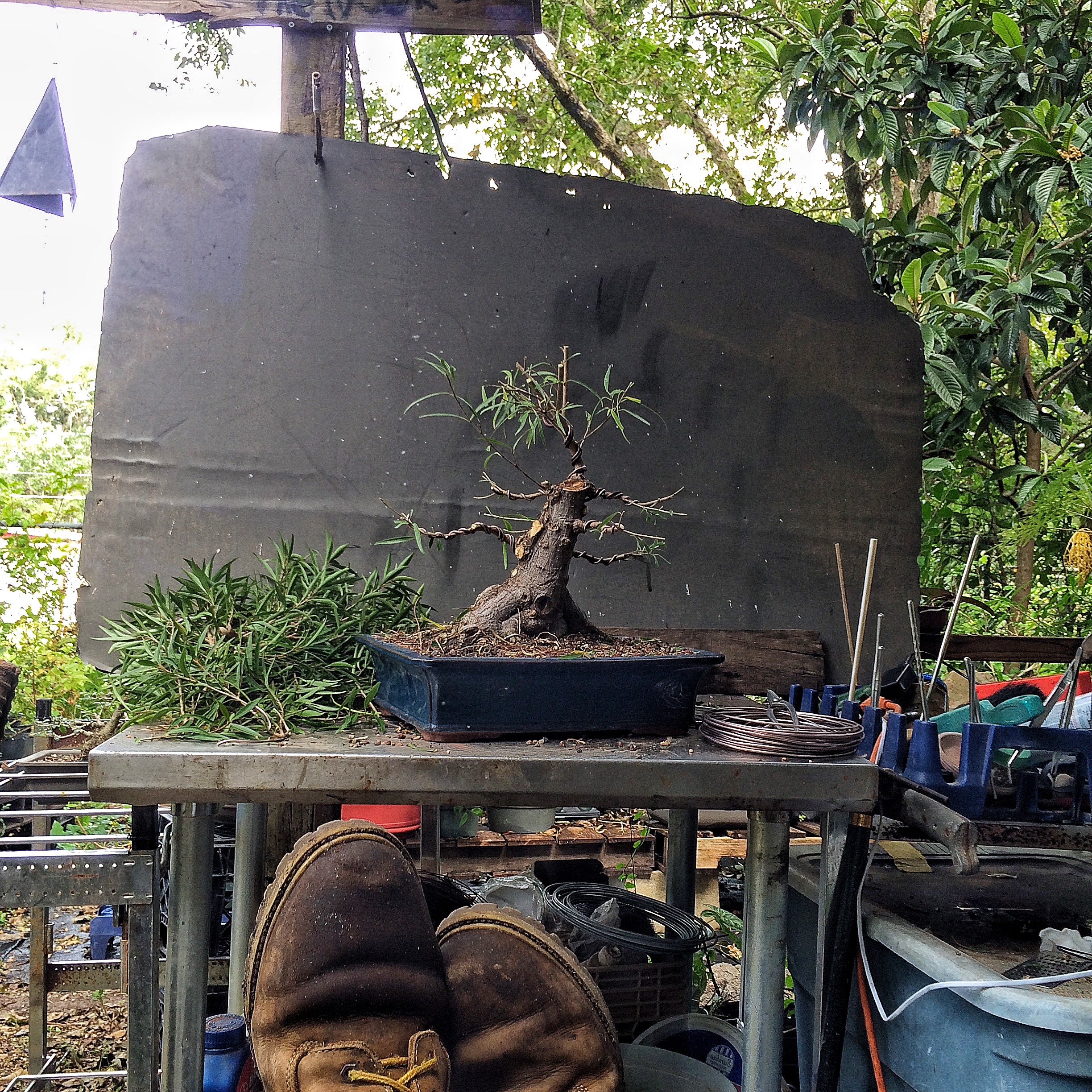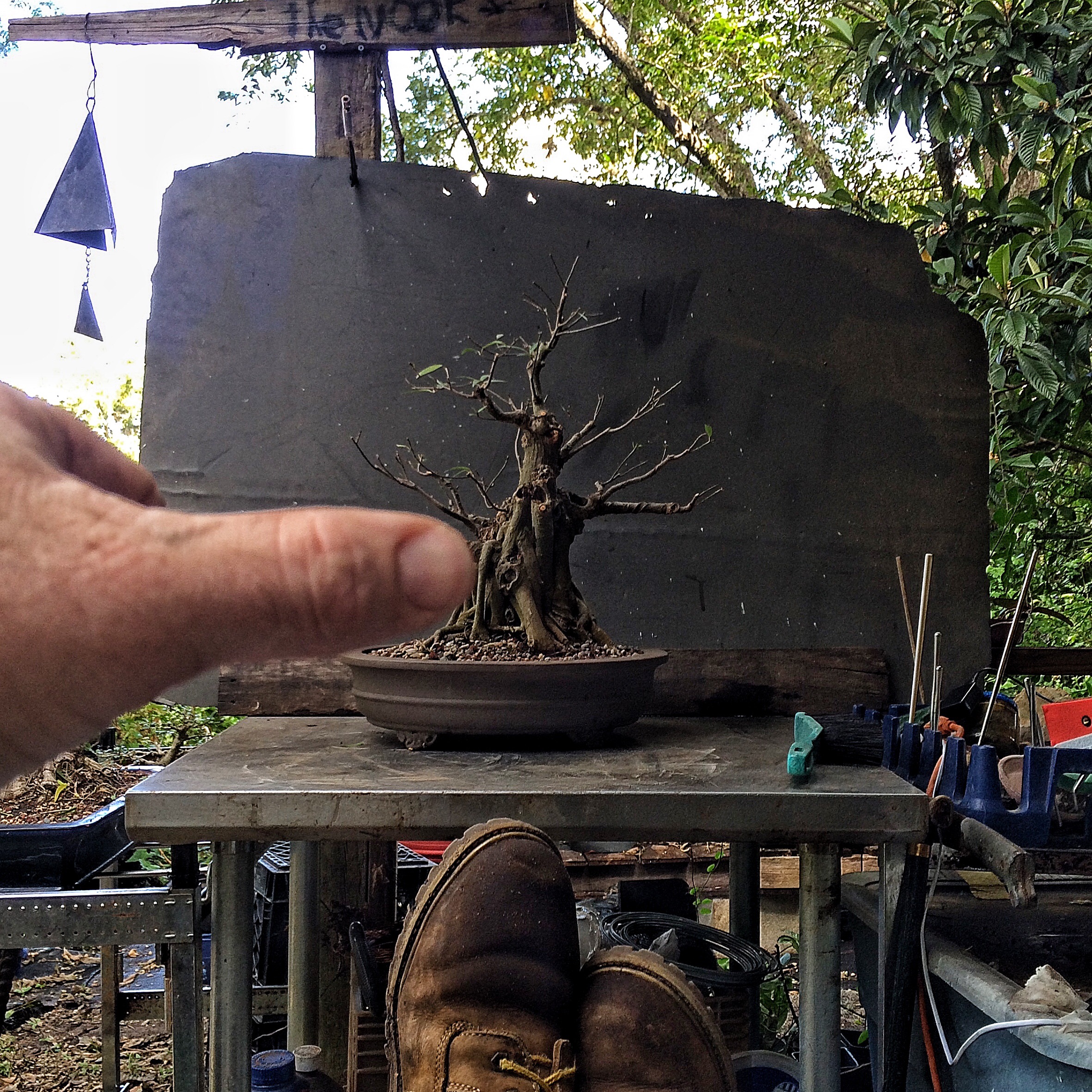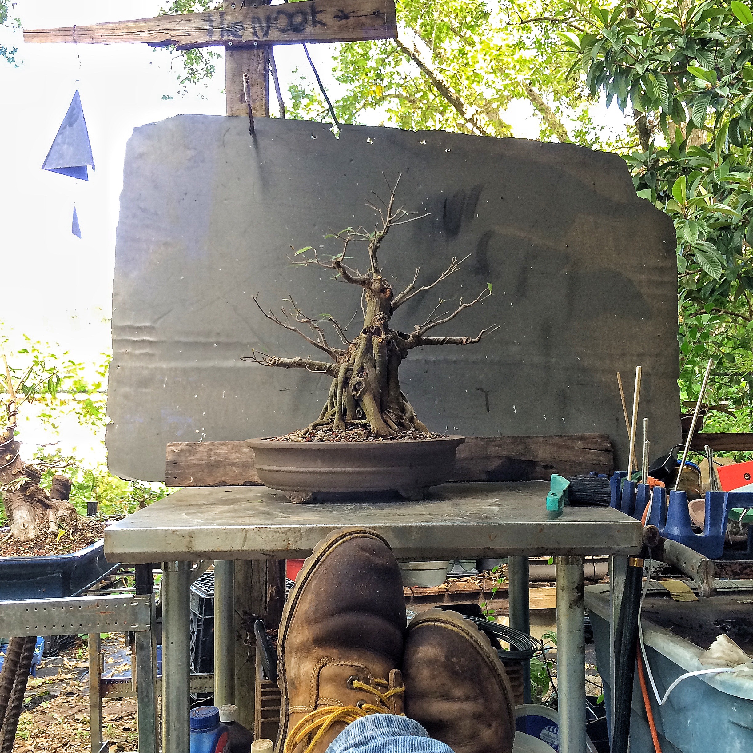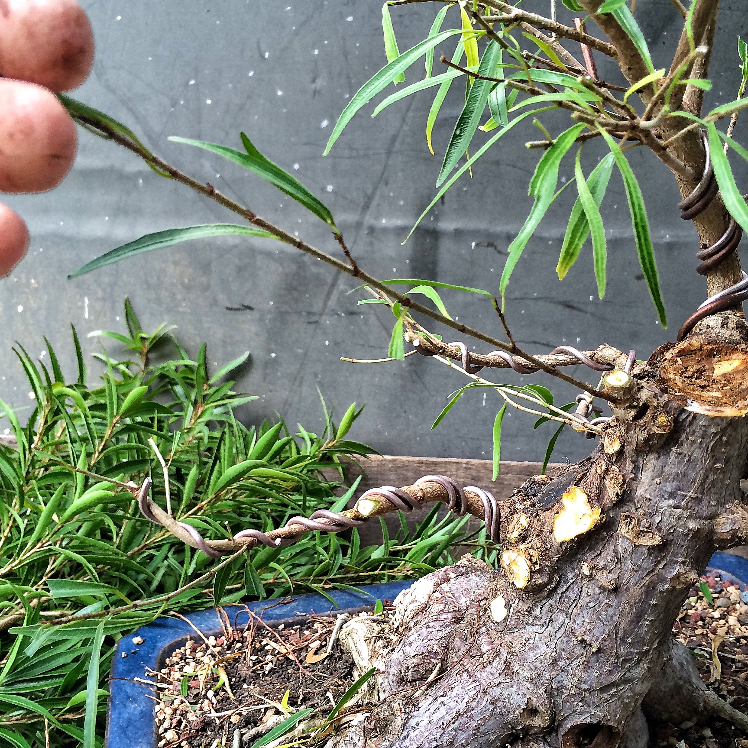 You have seen this tree before. It involved a trunk chop I believe. I just can’t find the link. Sorry. I have failed you, miserably, as the curator of my own work (I seriously need a manager. Someone to tell me where to go, to talk to venues, clubs and promoters for me. Most importantly, to deal with enumeration and amenities. Any takers?) I suppose I should begin. Oh, I’ll be working on this fat bottomed tree too. Another Willow leaf ficus.