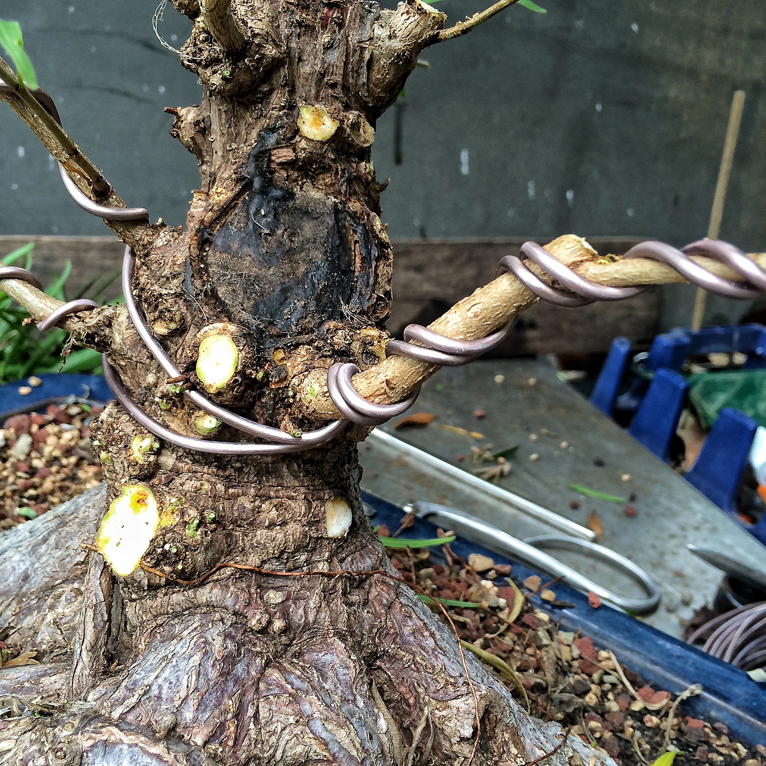 The traditional bonsai dogma calls for one big one (that’s what she said) because it’s “prettier”. But two wires provide for more support and less breakage when bending your branch. And it lets me anchor the wires mo’ betta from branch to branch.