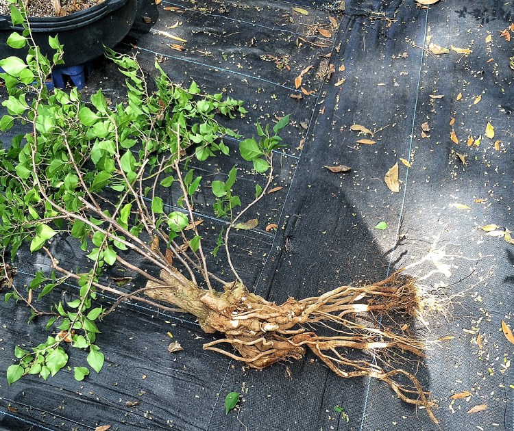 Then, because it’s too late in the year to cut back the roots too much, we up-potted it into a slightly larger pot.