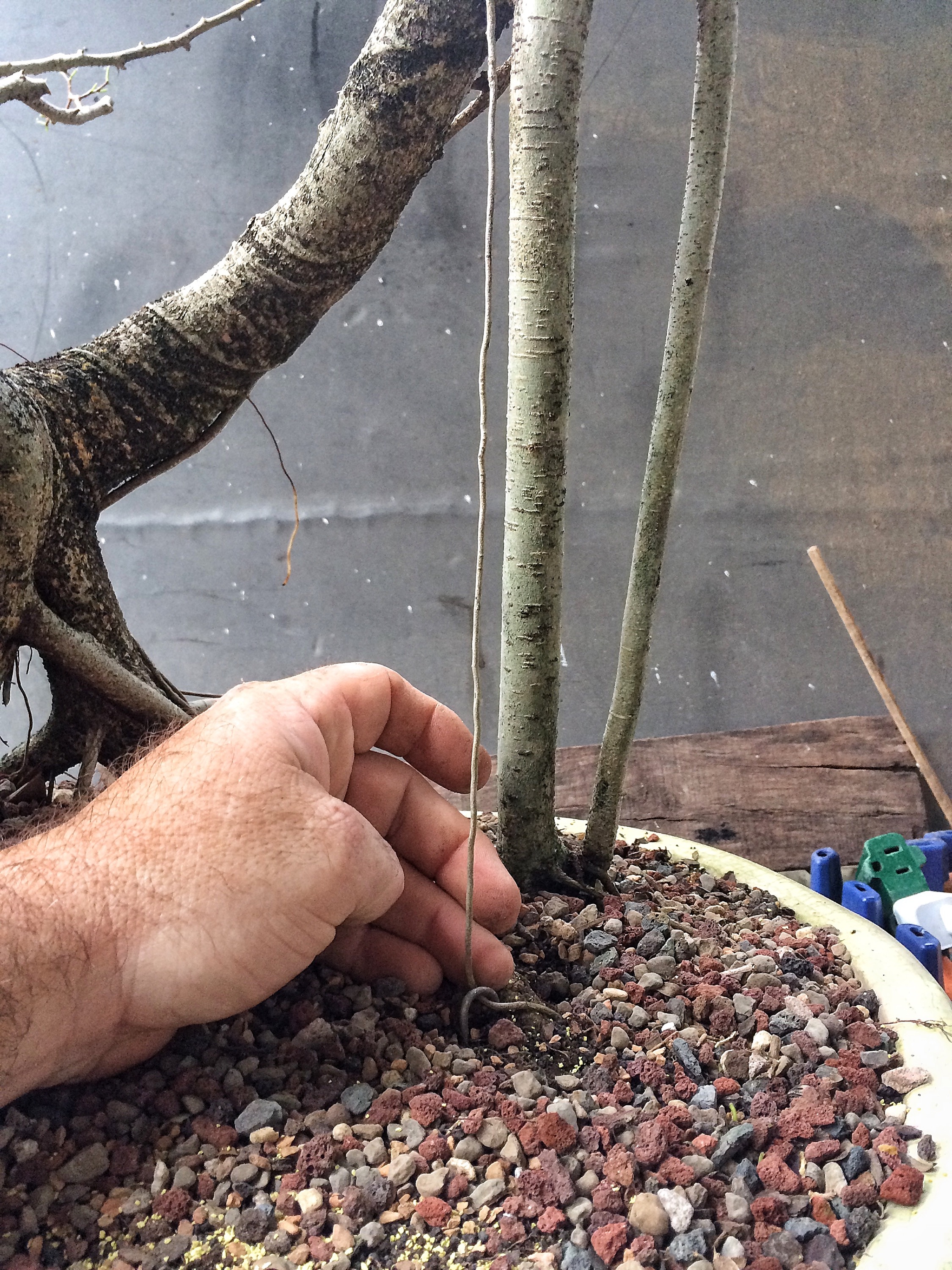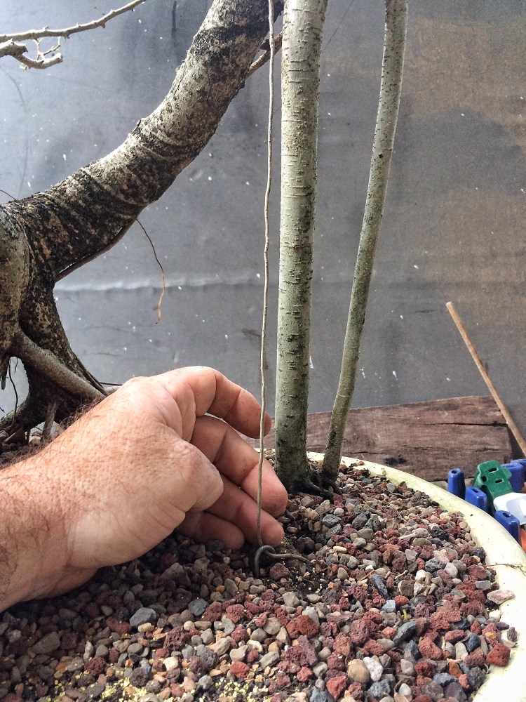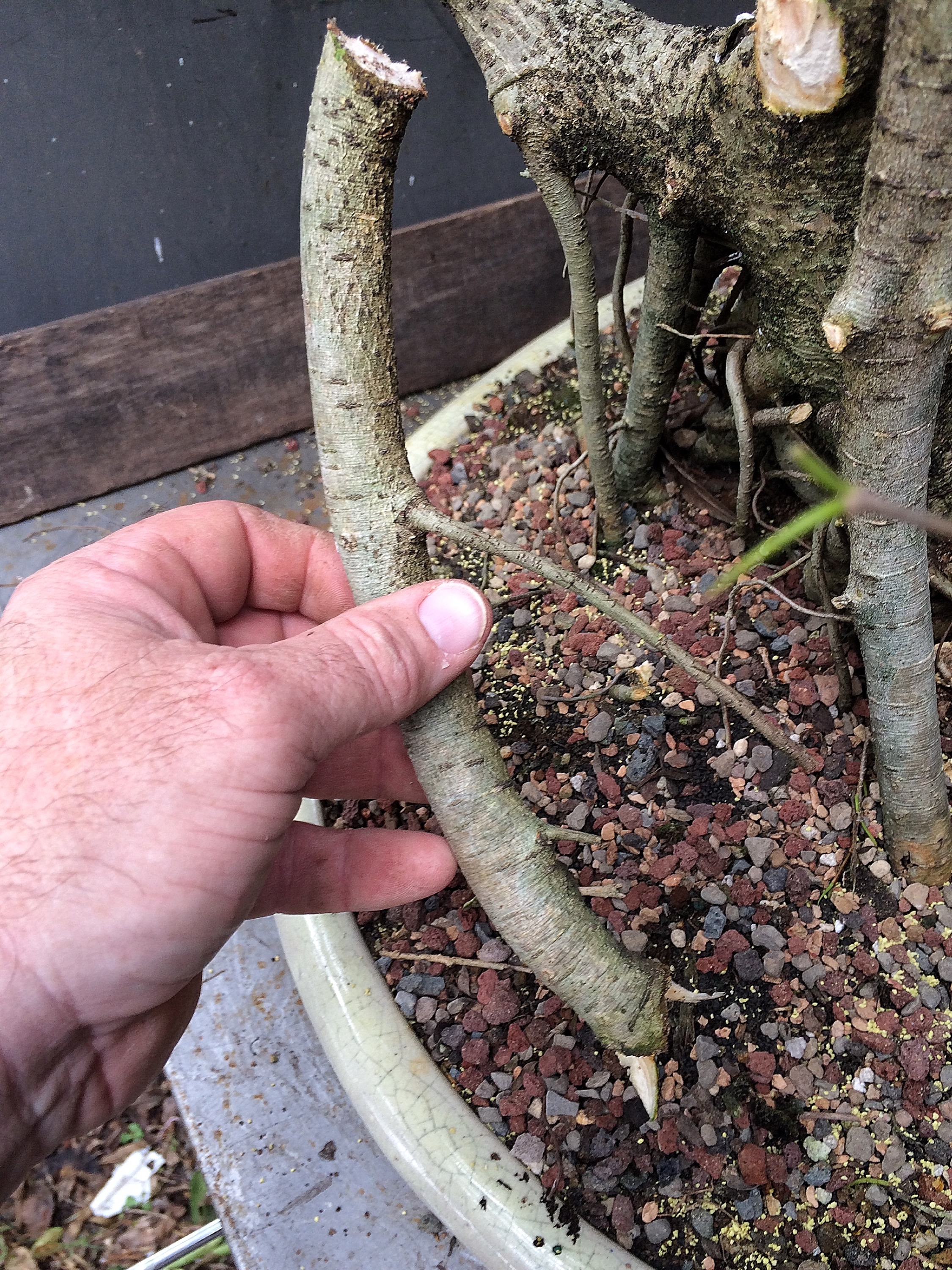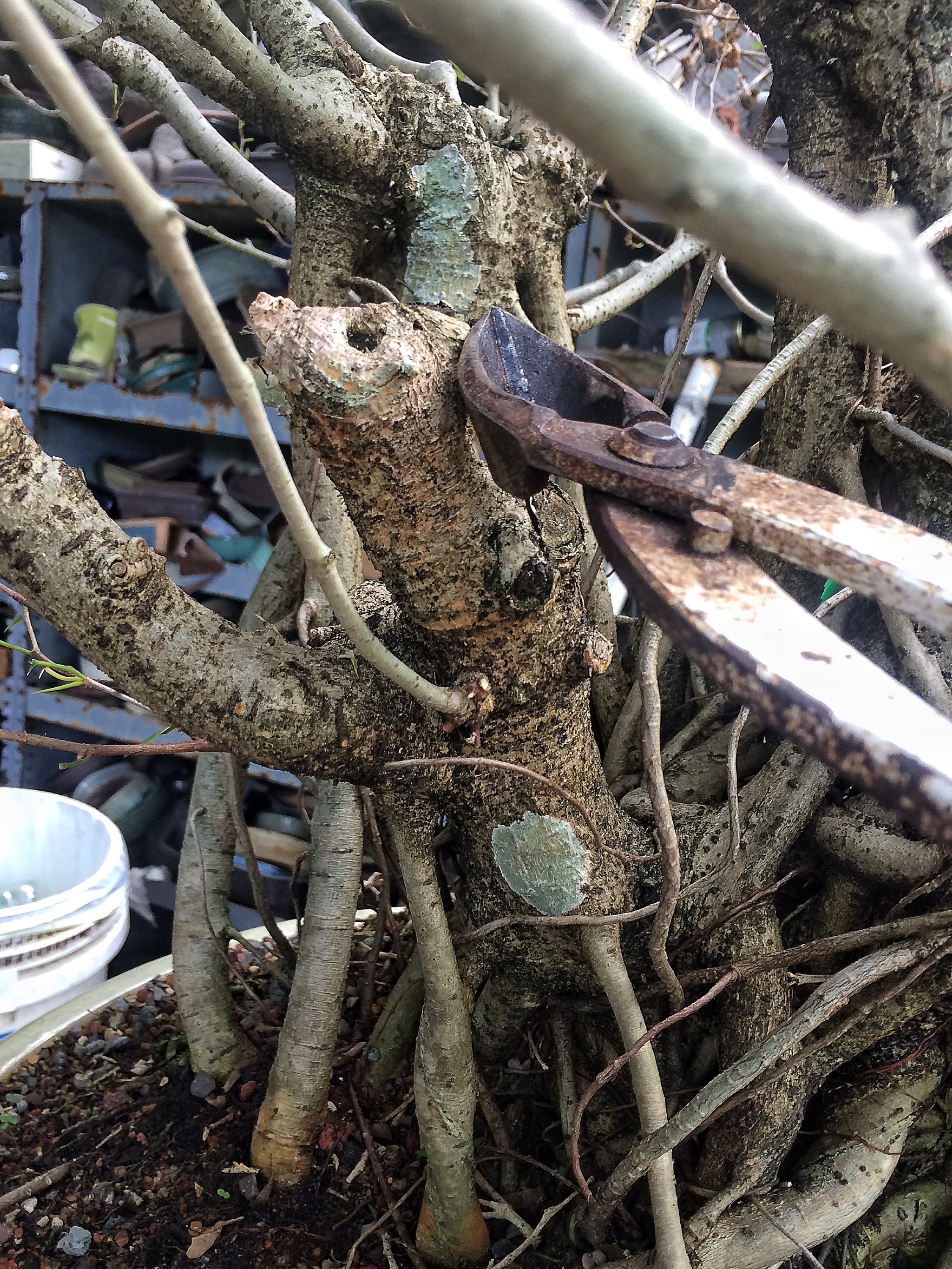 Don’t ask me why I’m using these ugly, rusty concaves when I have bright shiny American Bonsai tools to use. They were just handy.