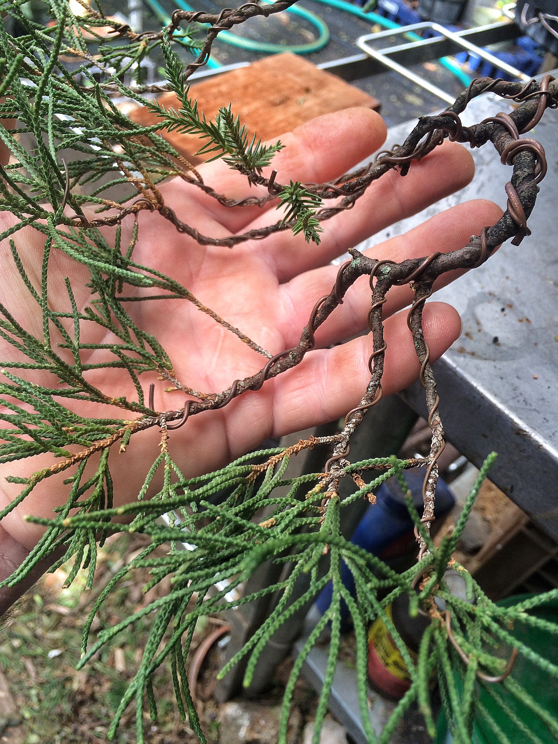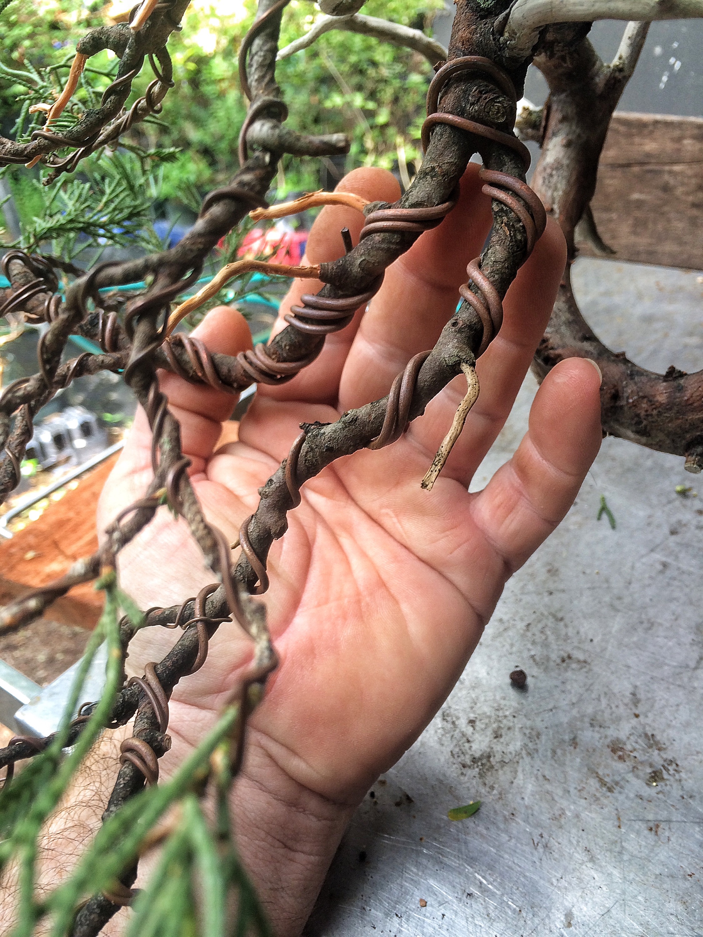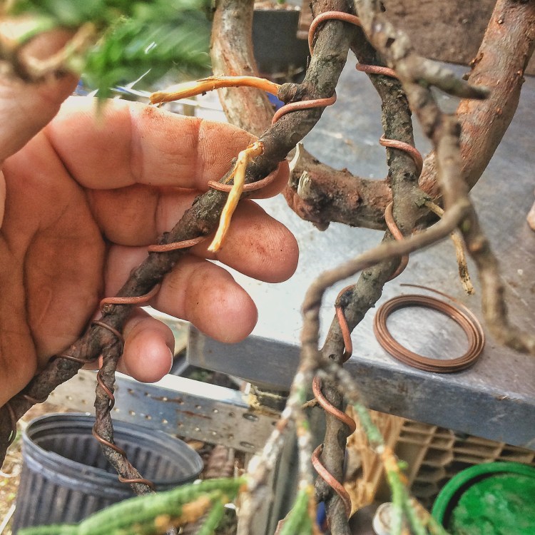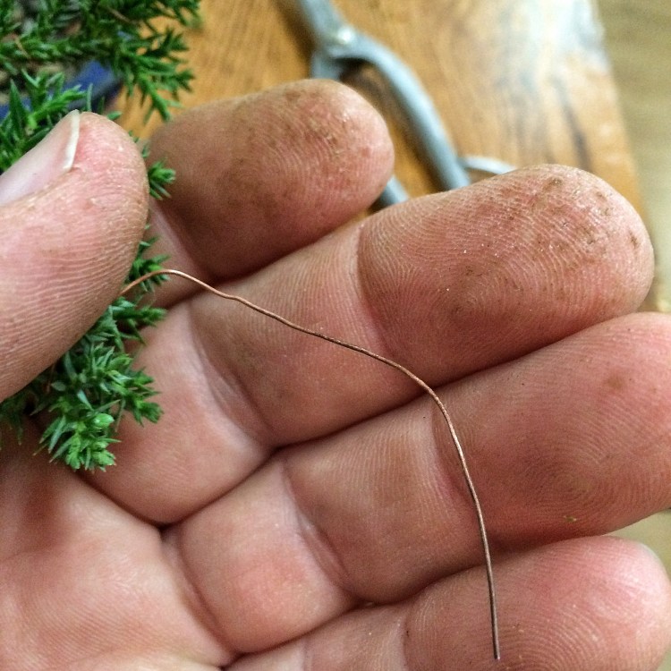 Yep, that’s correct. Copper wire. I figured that I could mend some fences a bit because it seems that a few people were offended by my off the cuff statements about using copper and growing tropical trees. Now, don’t get me wrong, if you’re growing a ficus, which needs rewiring 3-4 times in Florida’s intensive growing season, I still think it’s insane to use it. But on conifers like these junipers, go right ahead. And I had this wire sitting around and I have some junipers that need work. Why not. Let’s see what I can do, right?