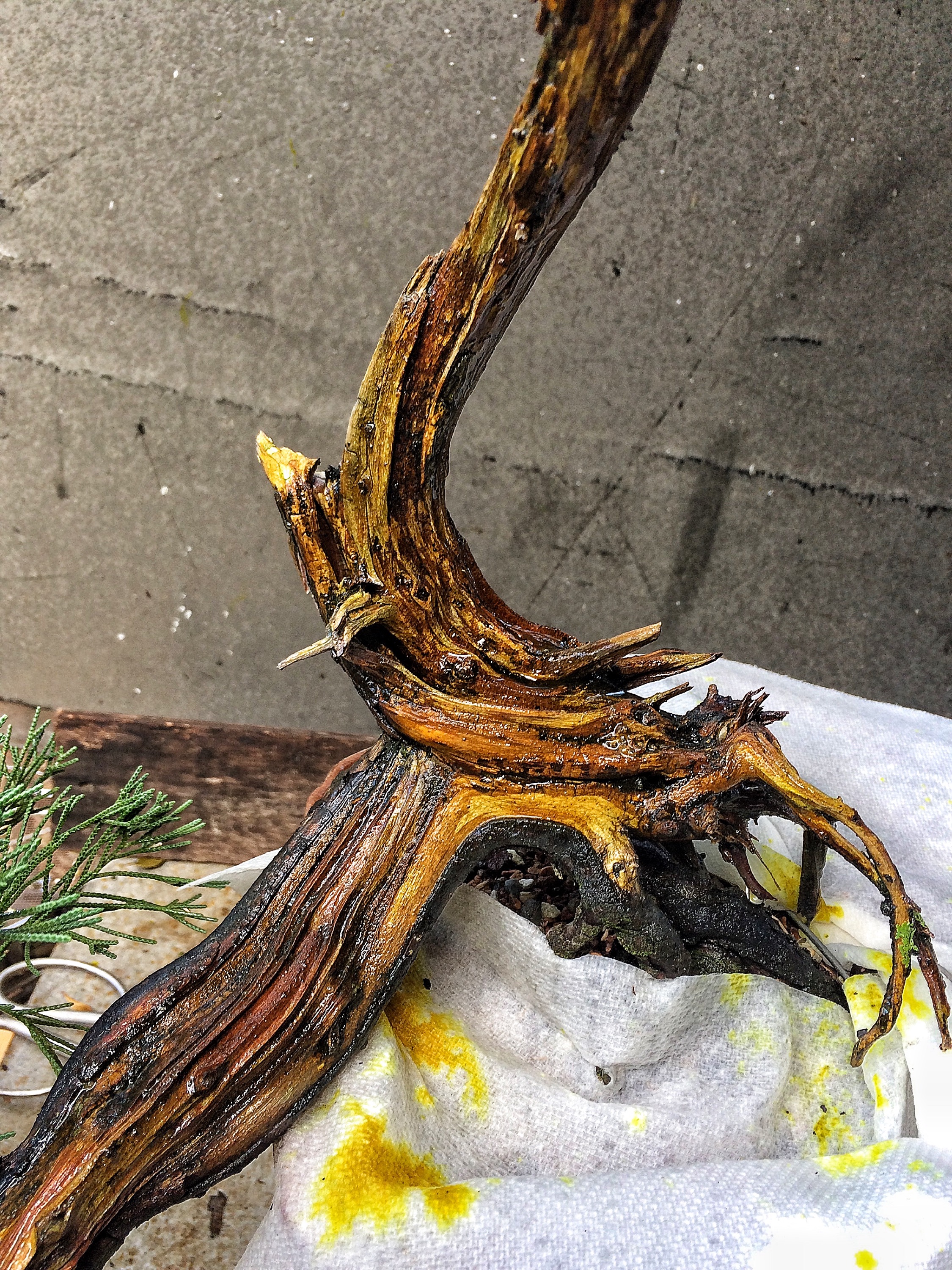 2. Ciao Adam, fammi capire sul ginepro più grande hai ripassato il zolfo-calce per fare risaltare il vecchio lavoro di jin, quando lo dai inizialmente é giallo poi ossidandosi con l’aria diventa grigio-bianco …..è. Così? Dove posso reperire questa mistura magica? Ciao ti seguo sempre dalla bella Italia.💀💪🏾💀💪🏾💀