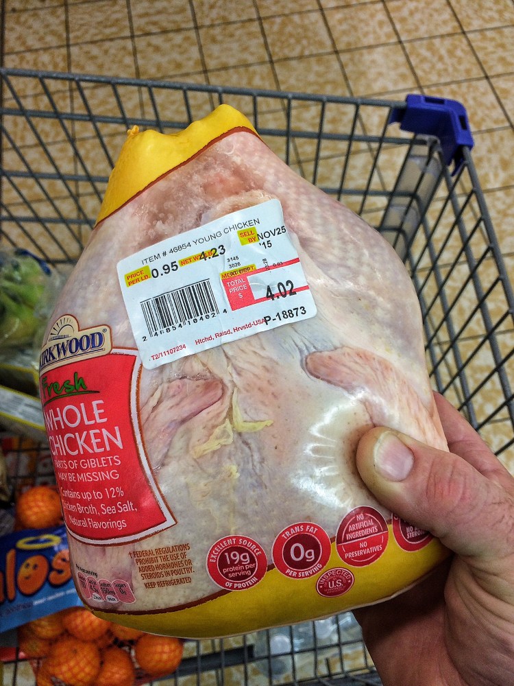 Looks like a back, a wing, and two thighs. I’m making my own stock for the soup and this is the beginning of my flavor profile. I used a “rotisserie” rub on the grilled chicken last night and that plus the grilled aspect, will add to the complexity of the broth.