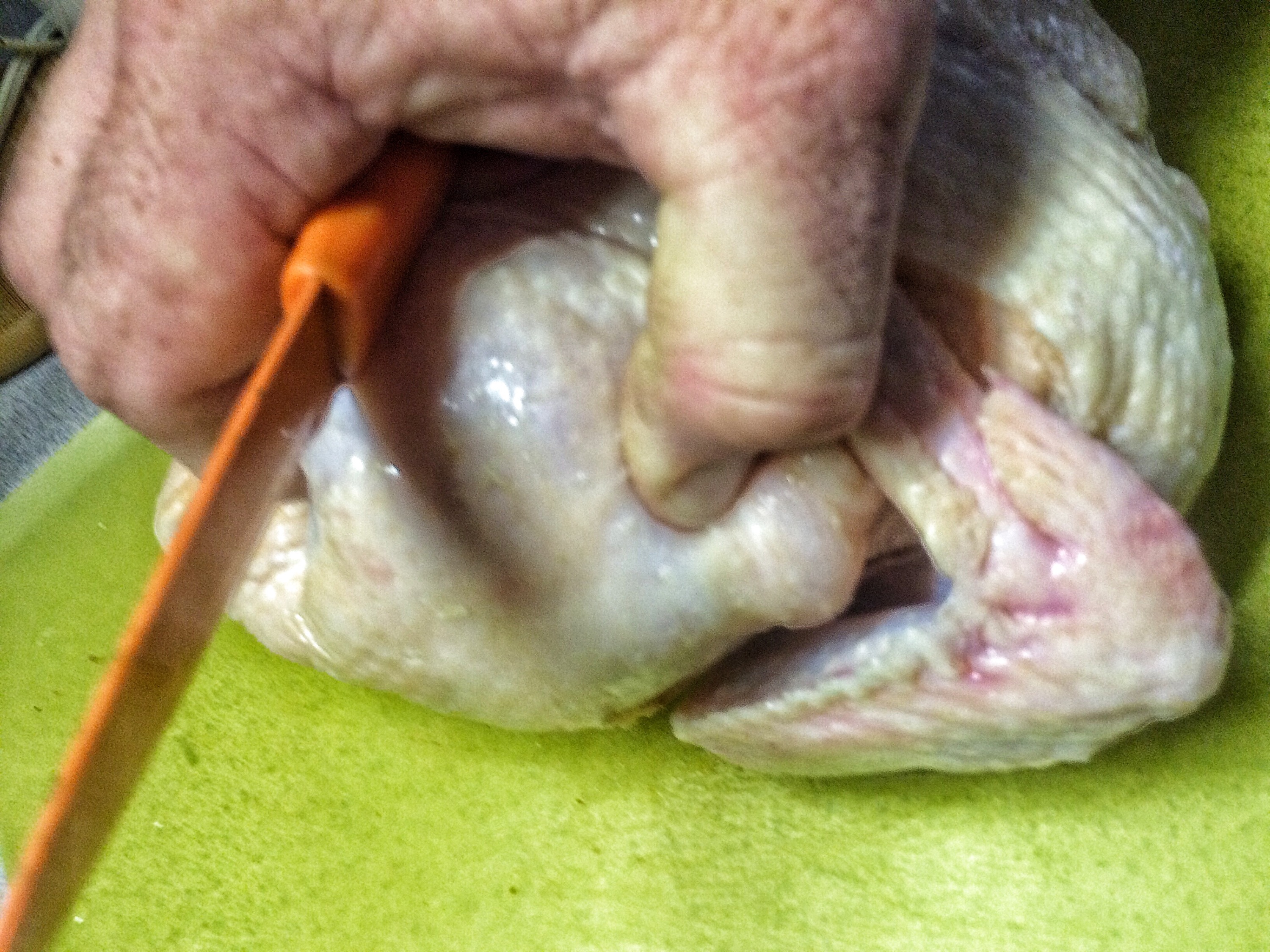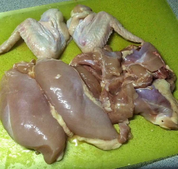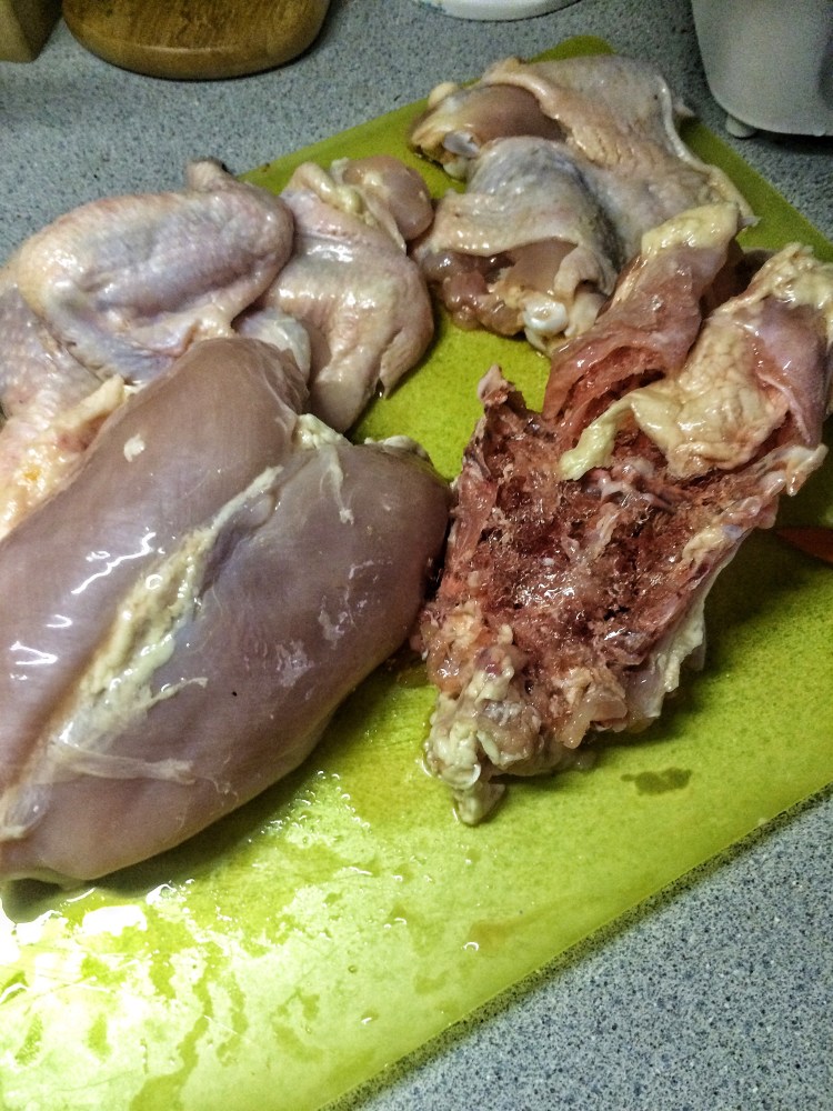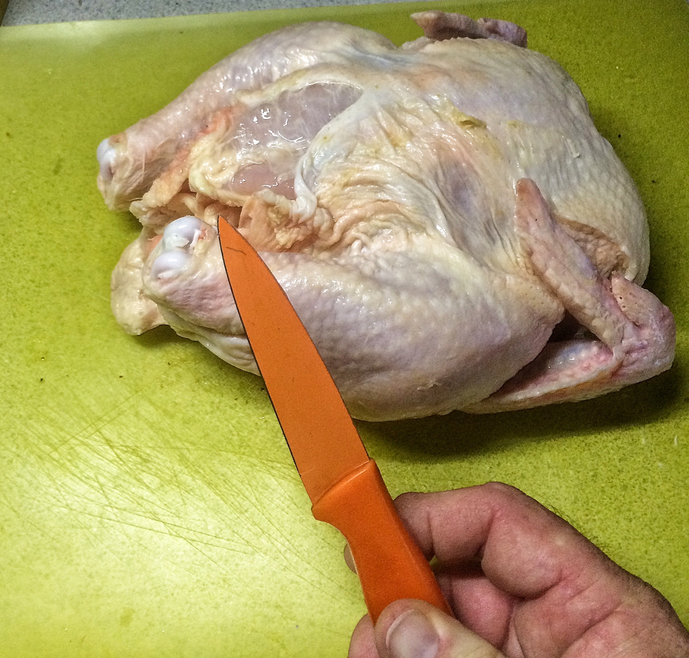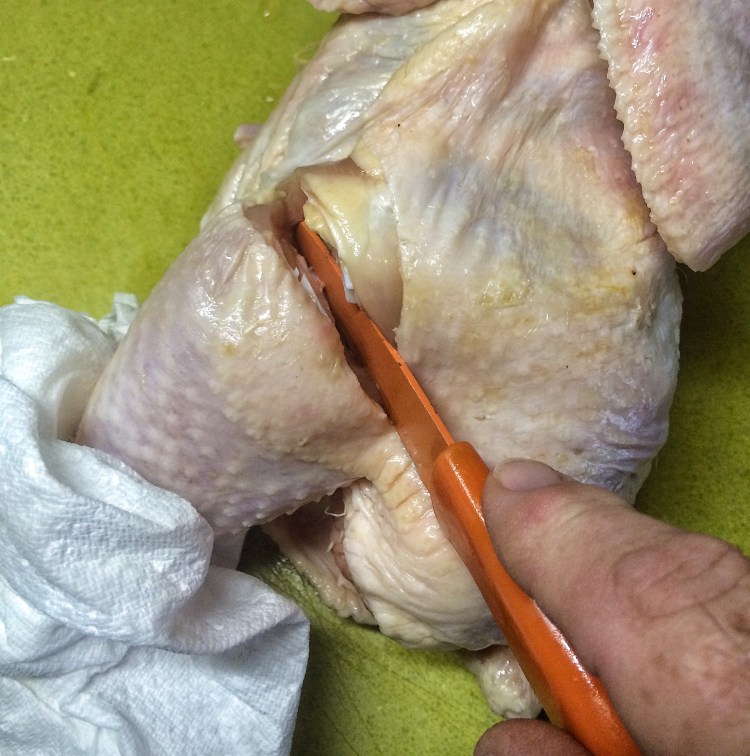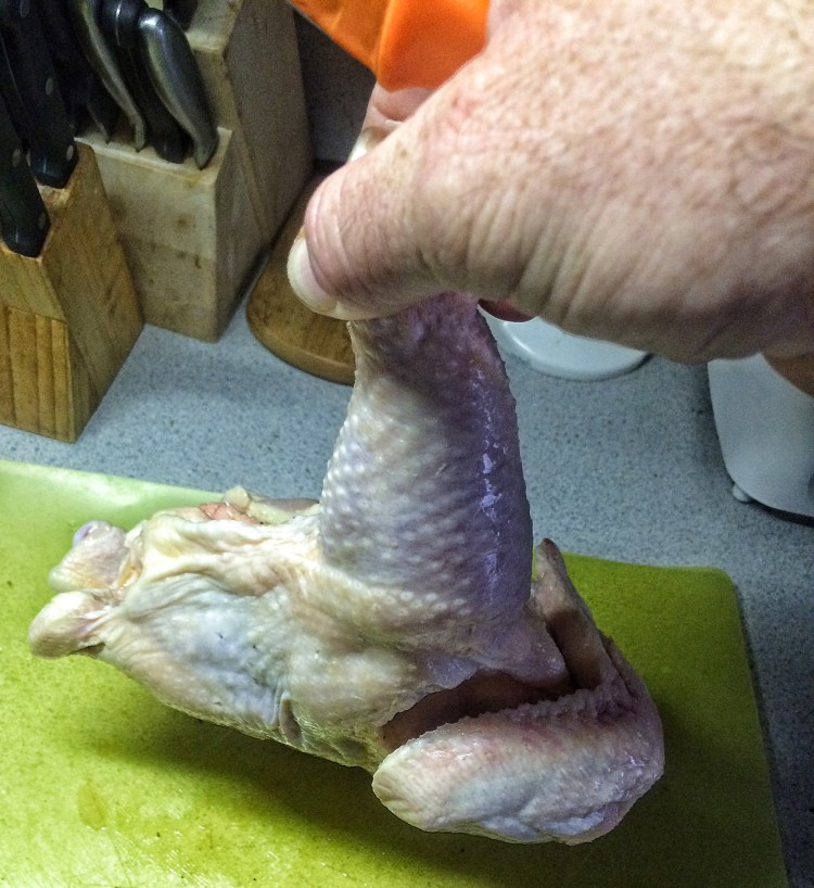 Now, there are many tutorials out there on how to cut up a chicken. This one from Alton Brown is pretty well done (click here to see it) I do it slightly different but the principles are the same (just like in bonsai…..ah). First, grab a leg and hold it up.  Not your leg showoff, the chickens.