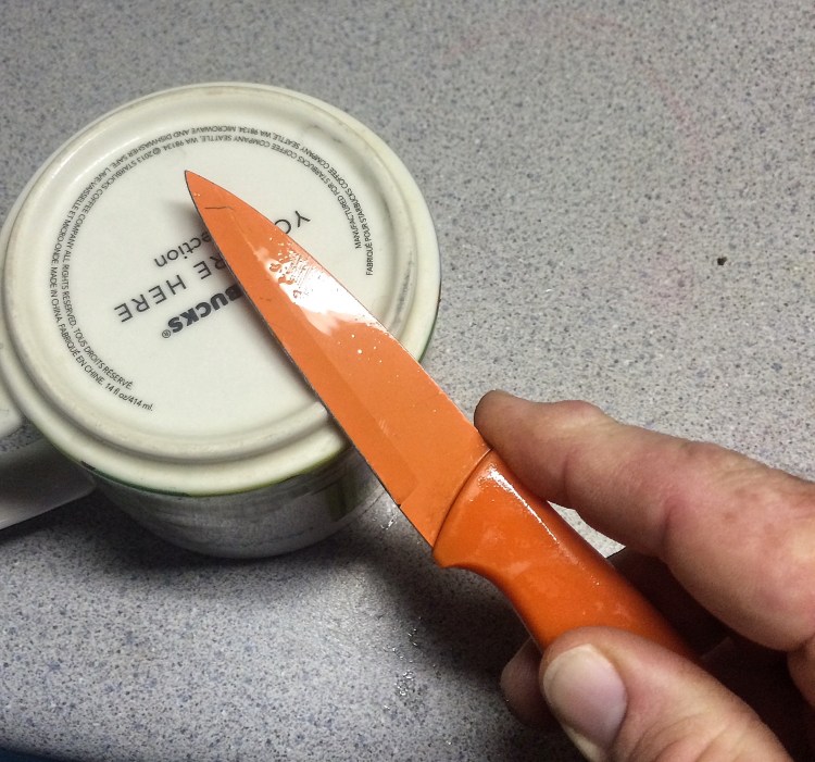 If it’s not sharp, grab a coffe cup and hone it on the unglazed bottom ridge of the cup.