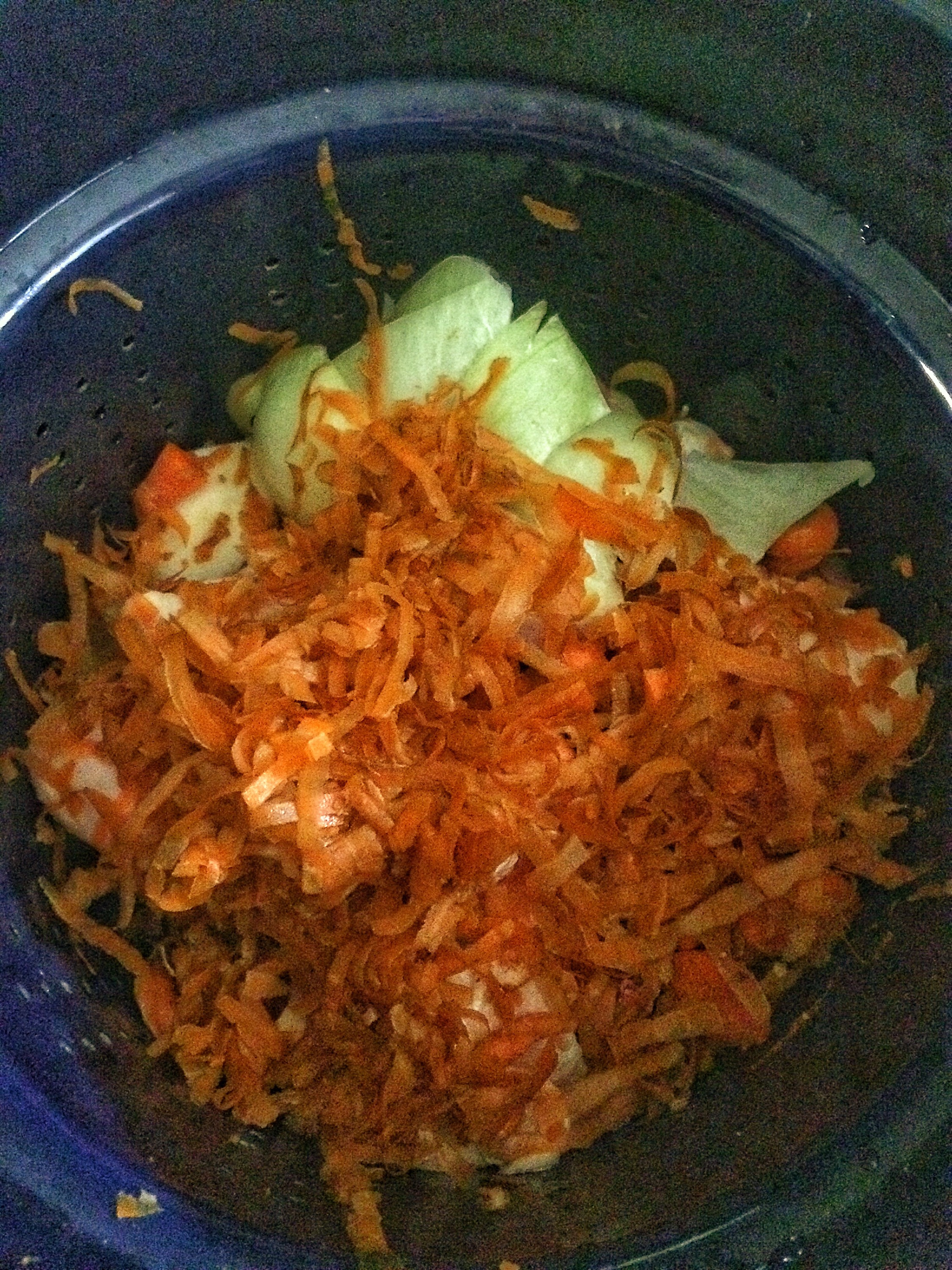 Next, the veggies. I’m not one to waste food, and I need the flavor in the broth, but putting good veggies in the broth destroys them…..what to do? Watch.