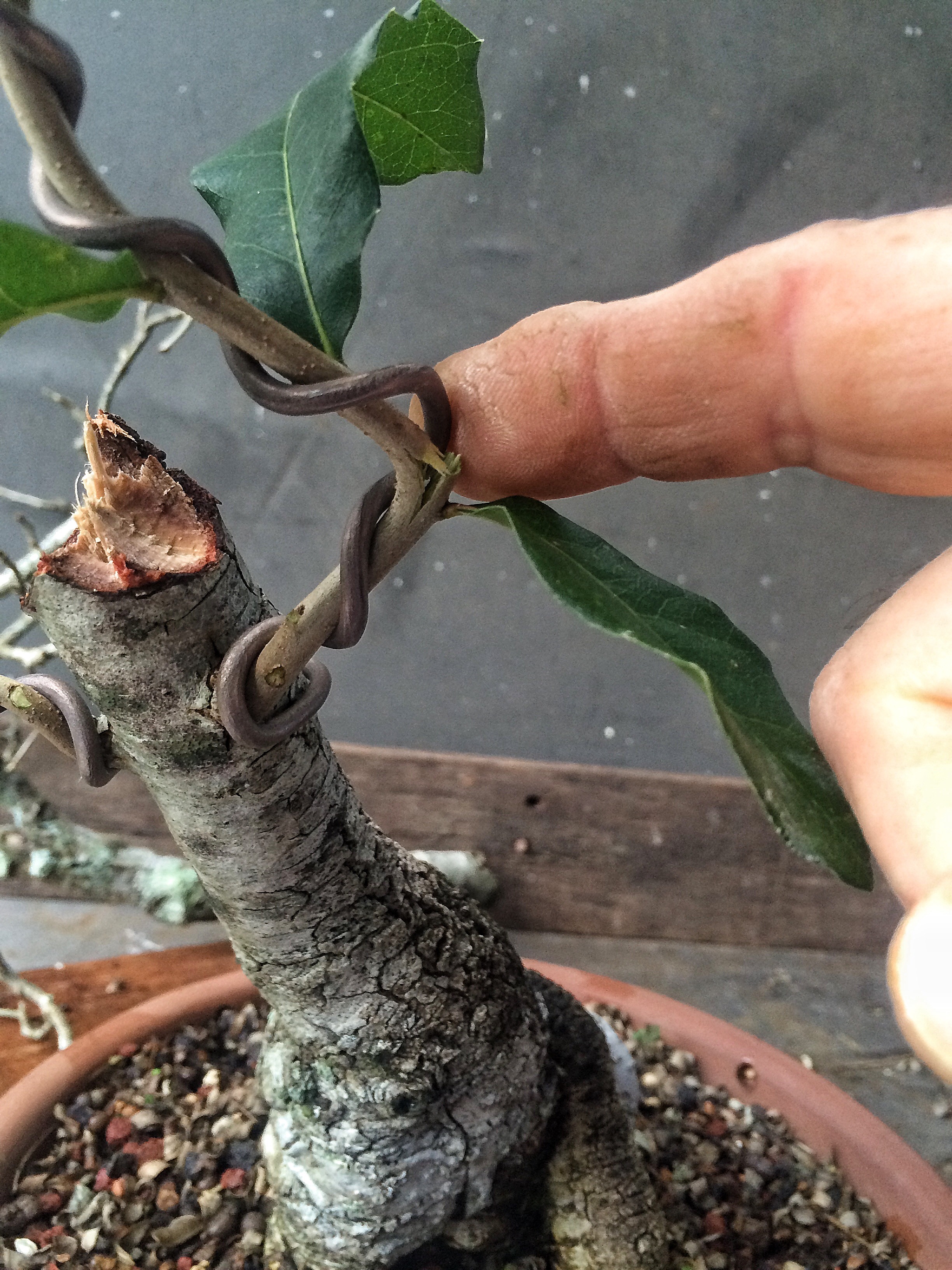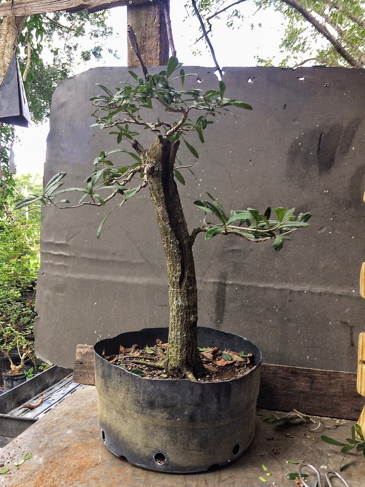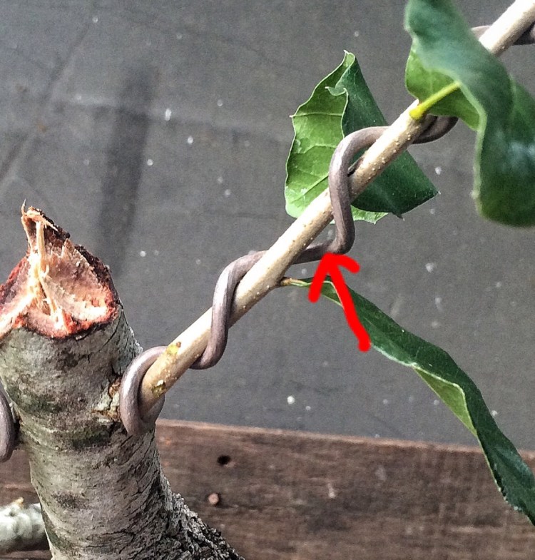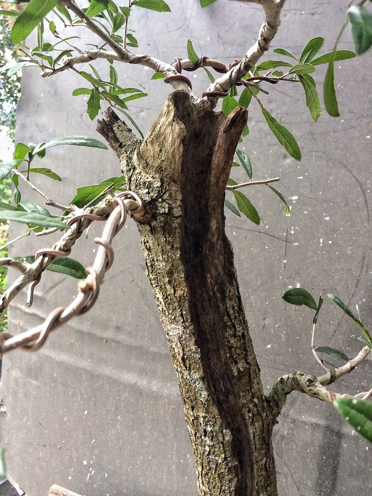 You’re wondering why I didn’t cut those two long branches back. Since I’m starting over, I have to get those branches thicker. I’ve gone from a near finished tree back to a growing stage with this tree. The first branch will be cut sooner than the new leader but I’m thinking probably two years before I begin really training the secondary branches above the first branch. It’s staying in Florida so that is at least a plus.