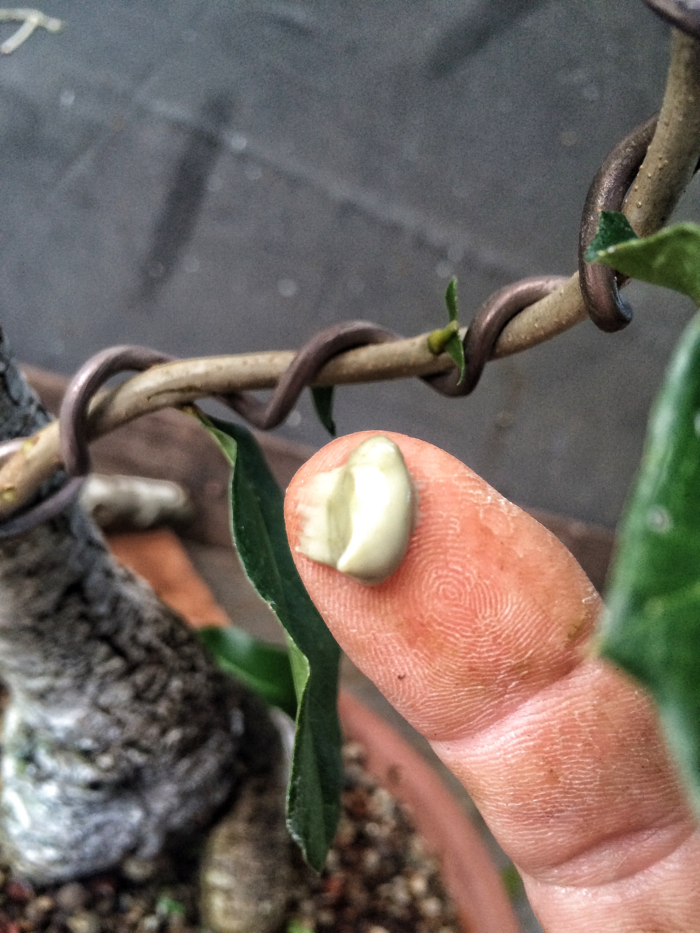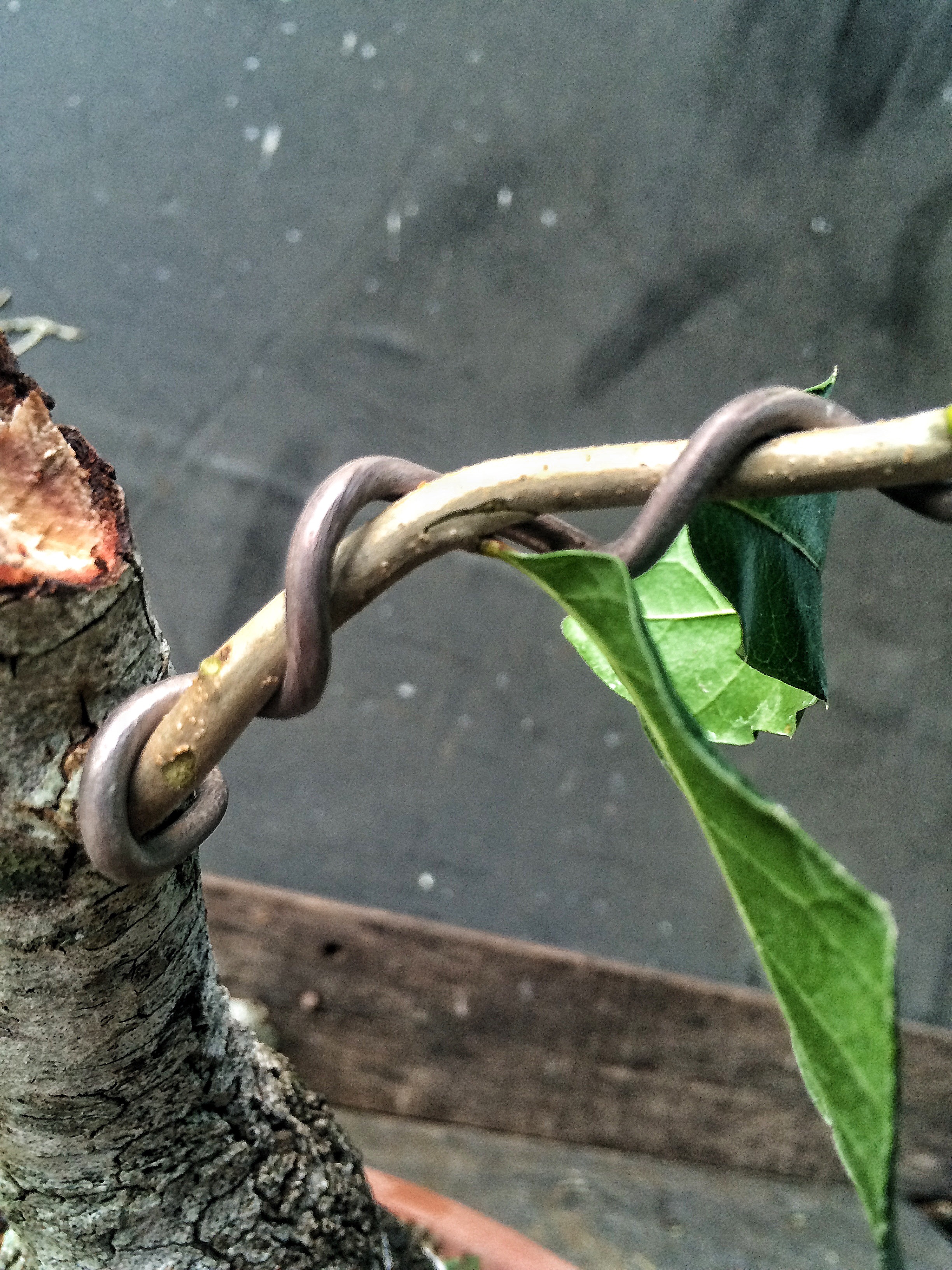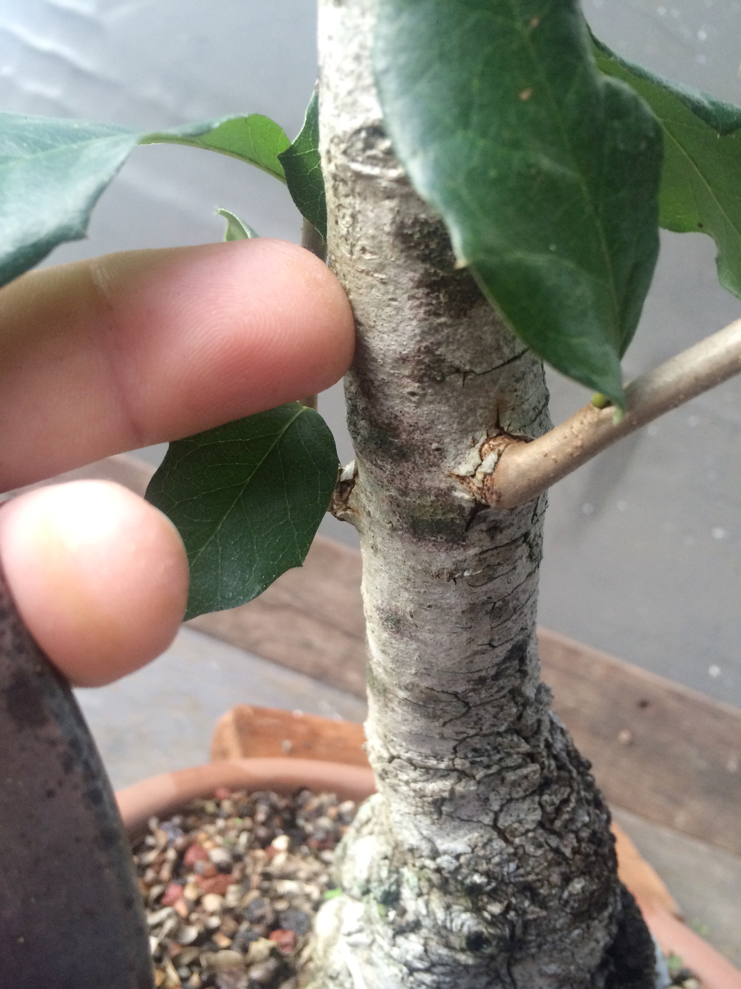 You’re wondering why I didn’t cut those two long branches back. Since I’m starting over, I have to get those branches thicker. I’ve gone from a near finished tree back to a growing stage with this tree. The first branch will be cut sooner than the new leader but I’m thinking probably two years before I begin really training the secondary branches above the first branch. It’s staying in Florida so that is at least a plus.