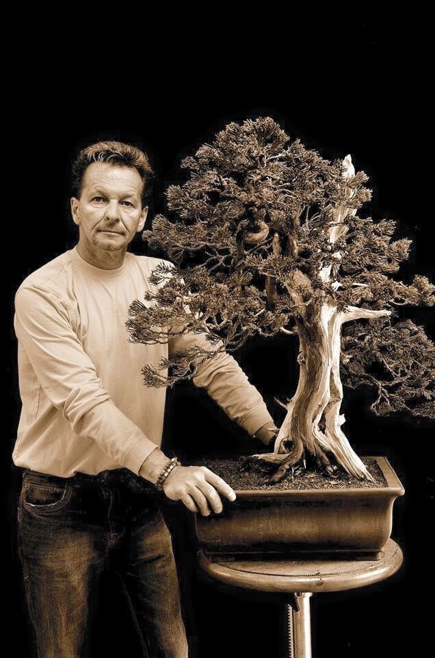 He styles in a beautifully naturalistic (and classical) style that most modern bonsai artists have abandoned. He also likes to pose with his trees. If I worked on the trees he gets to work on, I would too.