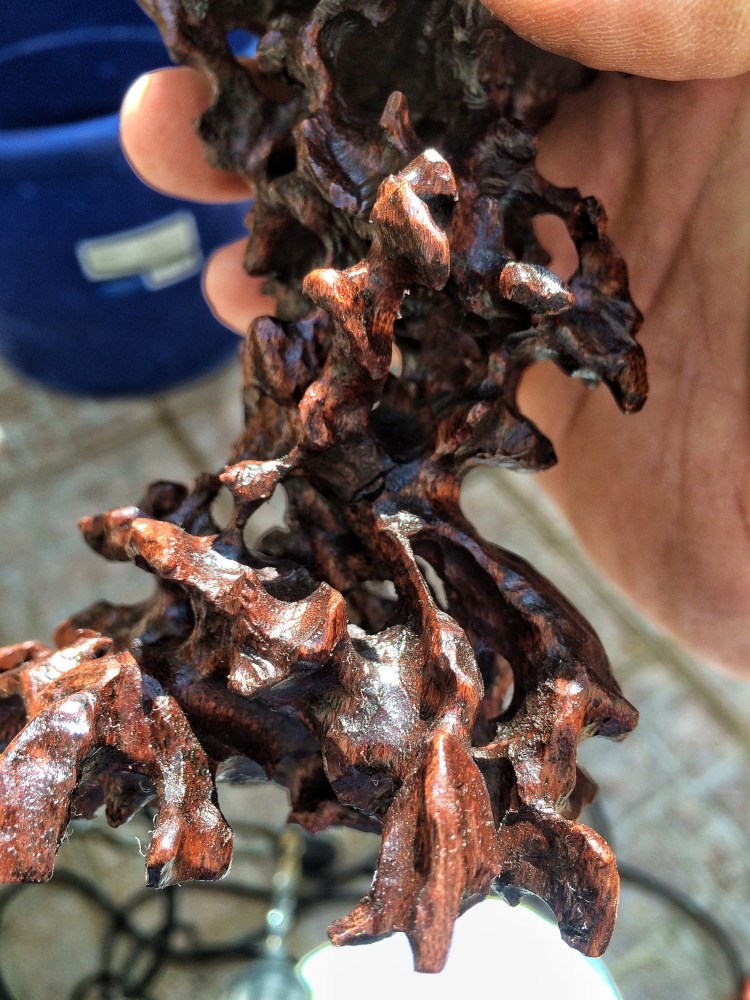 That’s the base a suiseki sits on (a suiseki is a stone that tends to look mountain like or such. It’s a whole ‘nother art that requires a book to explain. Look it up). The stone above was featured in the 3rd annual Nippon Suiseki Exhibit at the Metroplitan Museum of Art in Tokyo. One of the only westerners to have that honor.