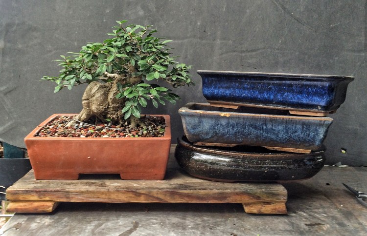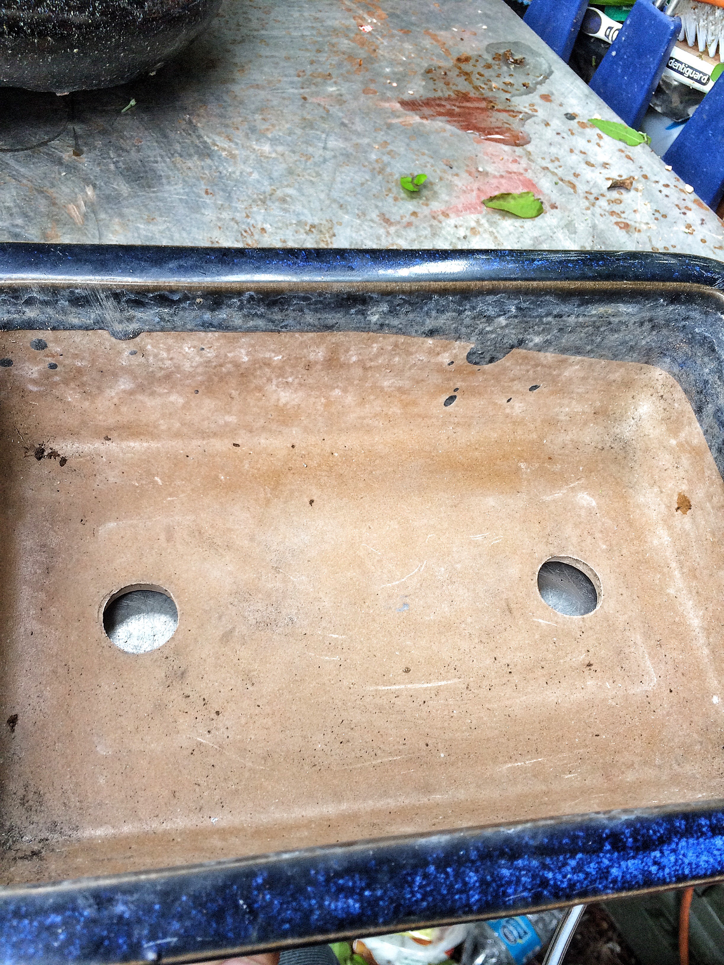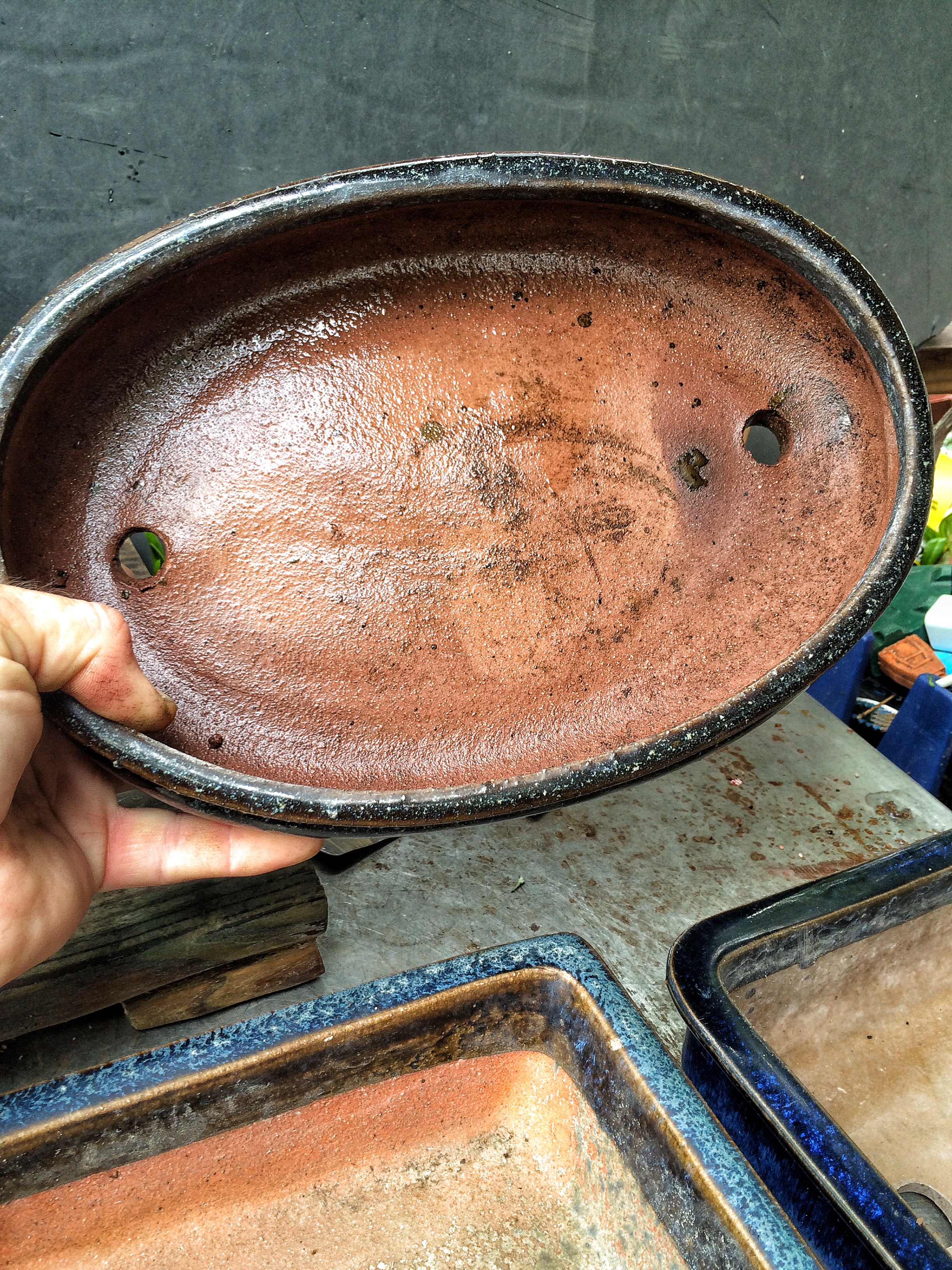 “Grown beautiful….with age or use” basically means: dirt and grime buildup from being used (for a long time) as a bonsai pot. (Here’s something funny to ponder: the word “patina” comes from Latin meaning “a shallow tray or dish”. Ironic, since I’m talking about patina on a bonsai pot, which is a shallow tray or dish. And to tie it all together, the antique Chinese bronze incense burners (remember definition “a” above) were some of the first shallow bonsai containers. It’s almost like the whole history of the bonsai pot is interconnected, or some mystical thing like that. Which illustrates the concept of Synchronicity, just for Seth.). Anyway, we try to make our trees look old. With our pots, it’s also a desirable thing for them to be old, or appear to be old. Age and provenance are things that are revered in Asian cultures. But our second pot, to me, might be too bright and clean for this tree.