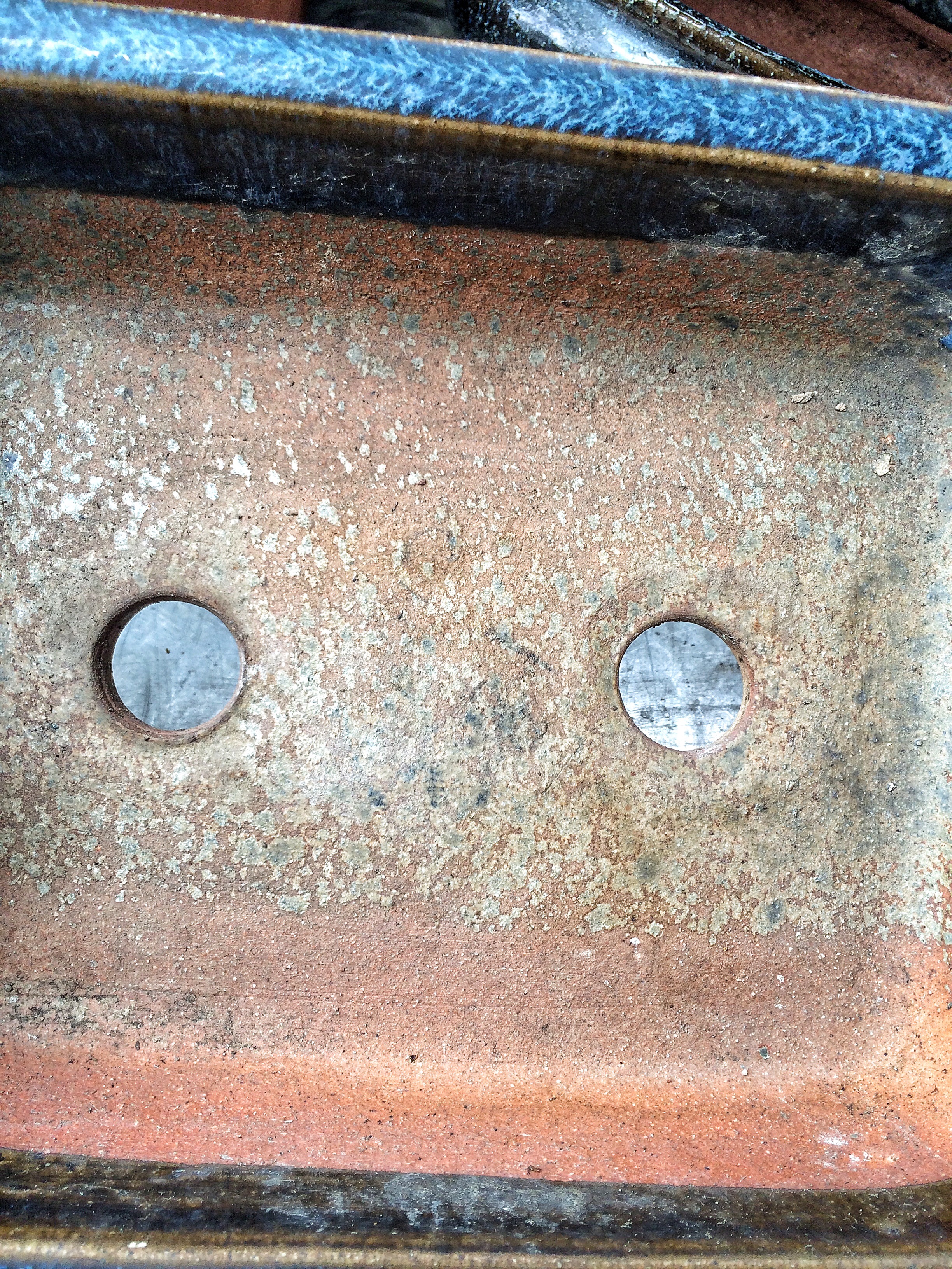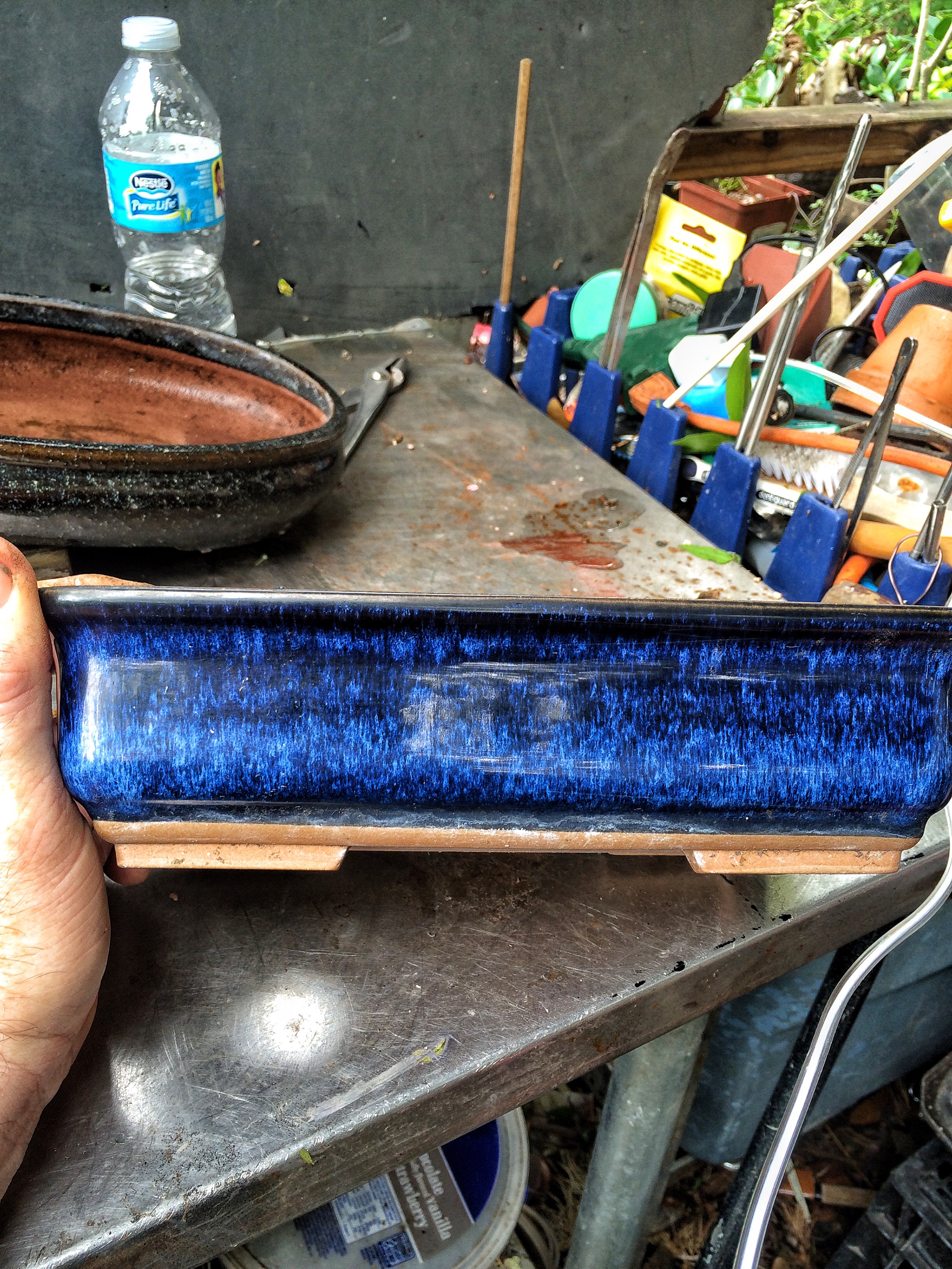 First pot, a contemporary (but probably ten year old) Chinese pot, in a glaze they (they being the potheads of the bonsai world…..and regular potters too, or ceramists to be more precise, because those who play with clay make things other than pots, you know,like coffe mugs and tea cups and plates and stuff) call: namako.