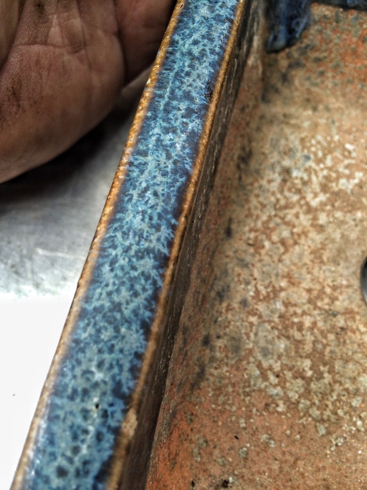 I’m thinking, actually, that all three pots are namako (these links are blogposts from Peter Tea and Ryan Bell respectively, Here and Here, that explain what “namako” is, way better than I can, and makes me think so). Namako has brown, blue, and white in various stages of dominance depending on the clay body and the application of glaze.