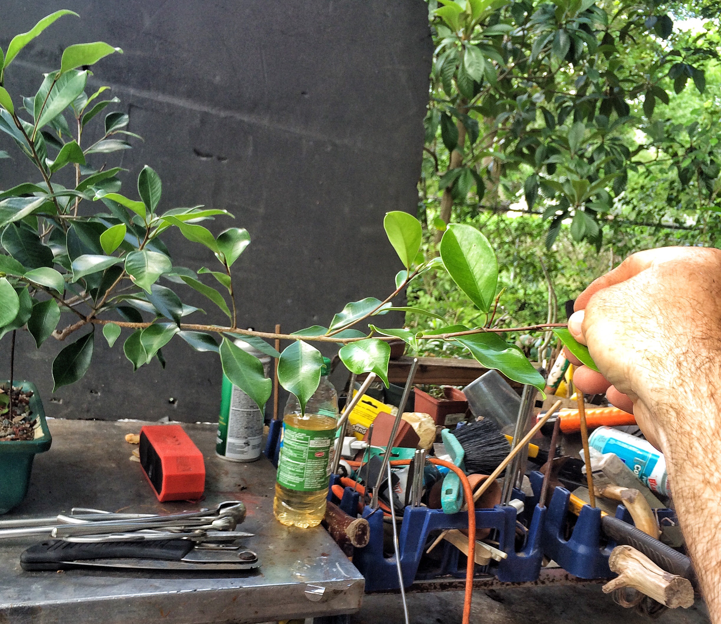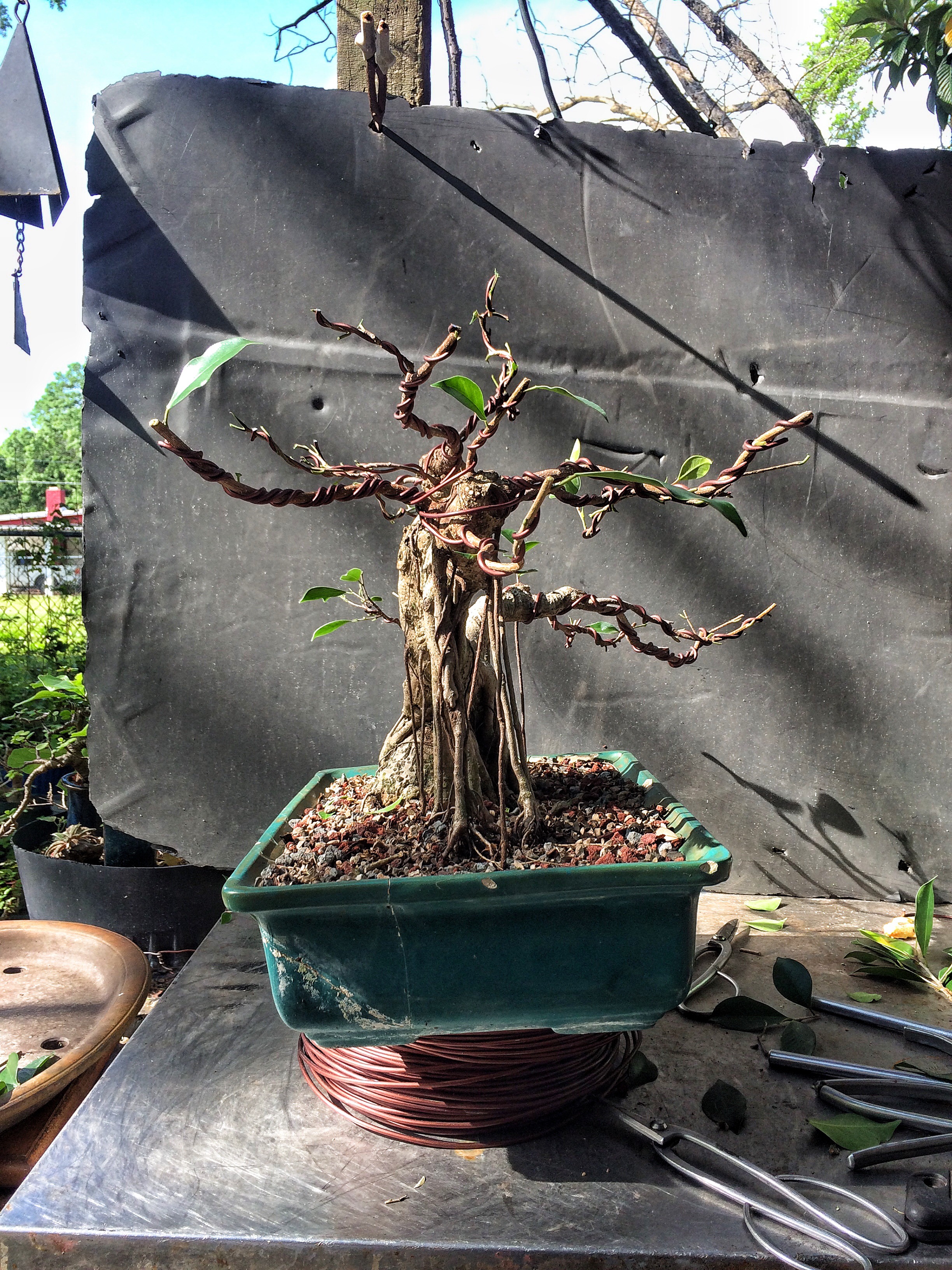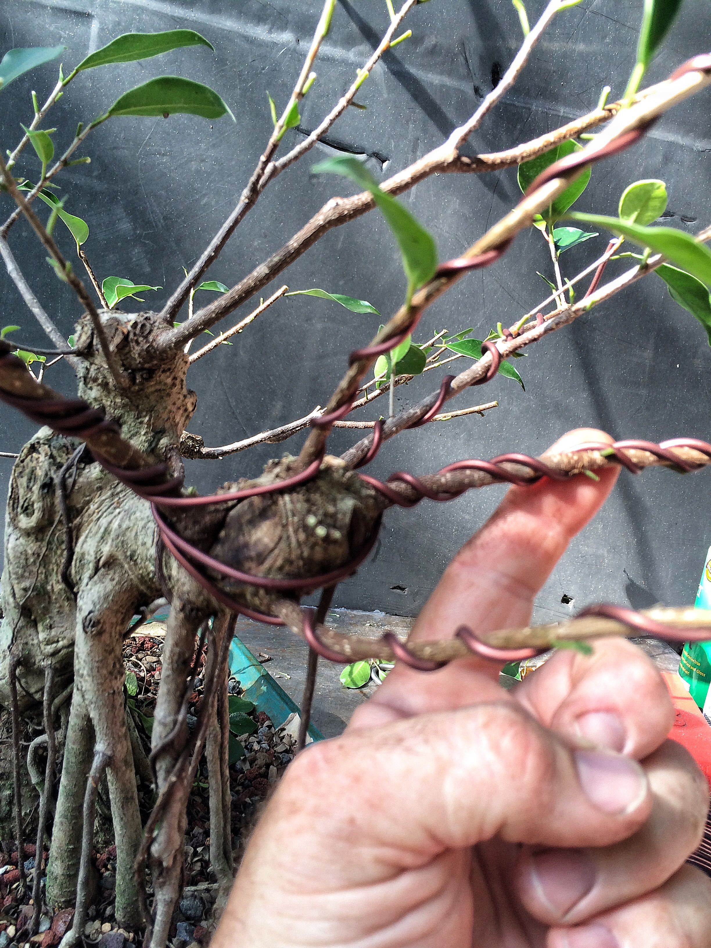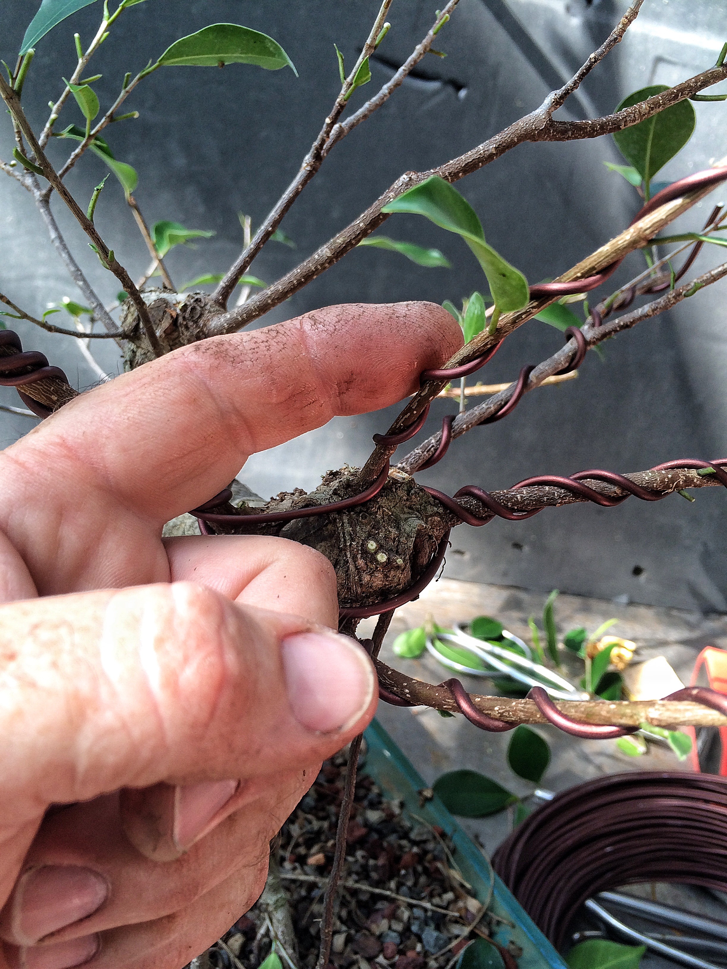 So, I figured out that the first branch needed at least three #3 wires to hold. It is an older branch and more stiff than the other branches, which only needed one wire, albeit they are maybe half the size. Ya’ dig? You need to get your hands on trees and start wiring and bending.