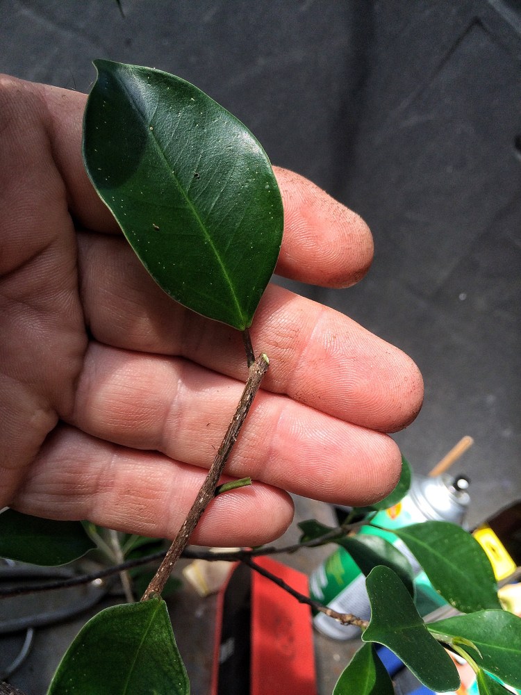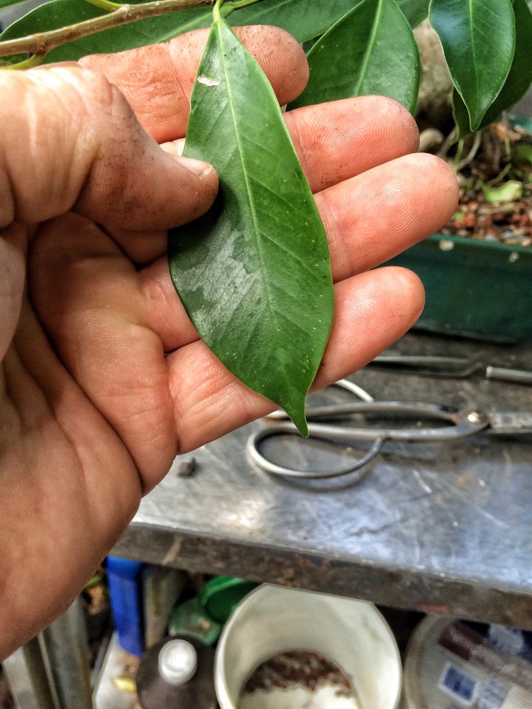 The leaf is about full size here. With proper cultivation, we can get the leaf size down to about the thickness of one of my fingers, or maybe a little more. I got the tree from my bud Ronn at a convention about three years ago (Blog post here)