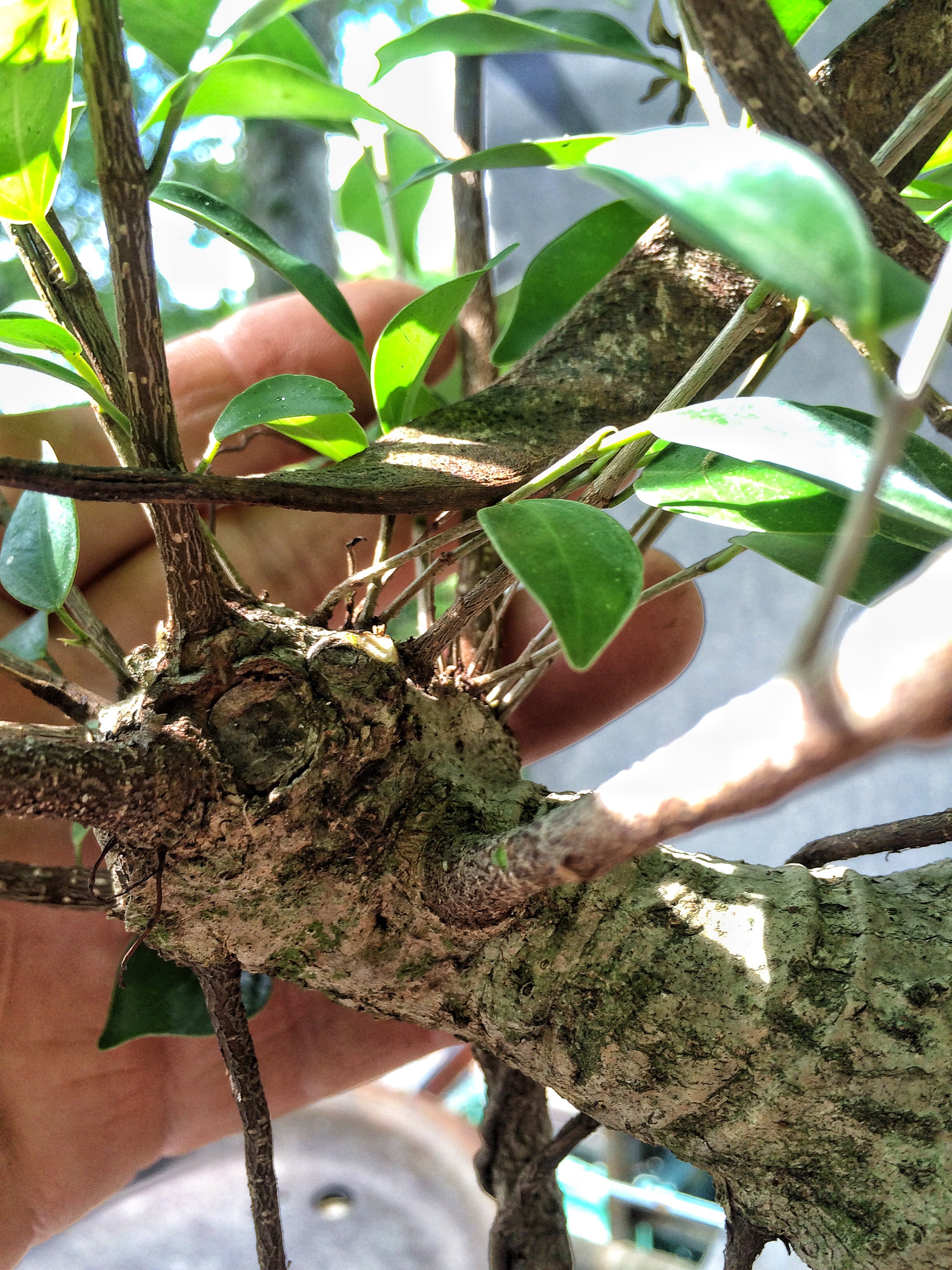 Reach out and touch someone (that used to be a telephone company’s slogan. Sounds kinda creepy nowadays). The tree is a ficus microcarpa.
