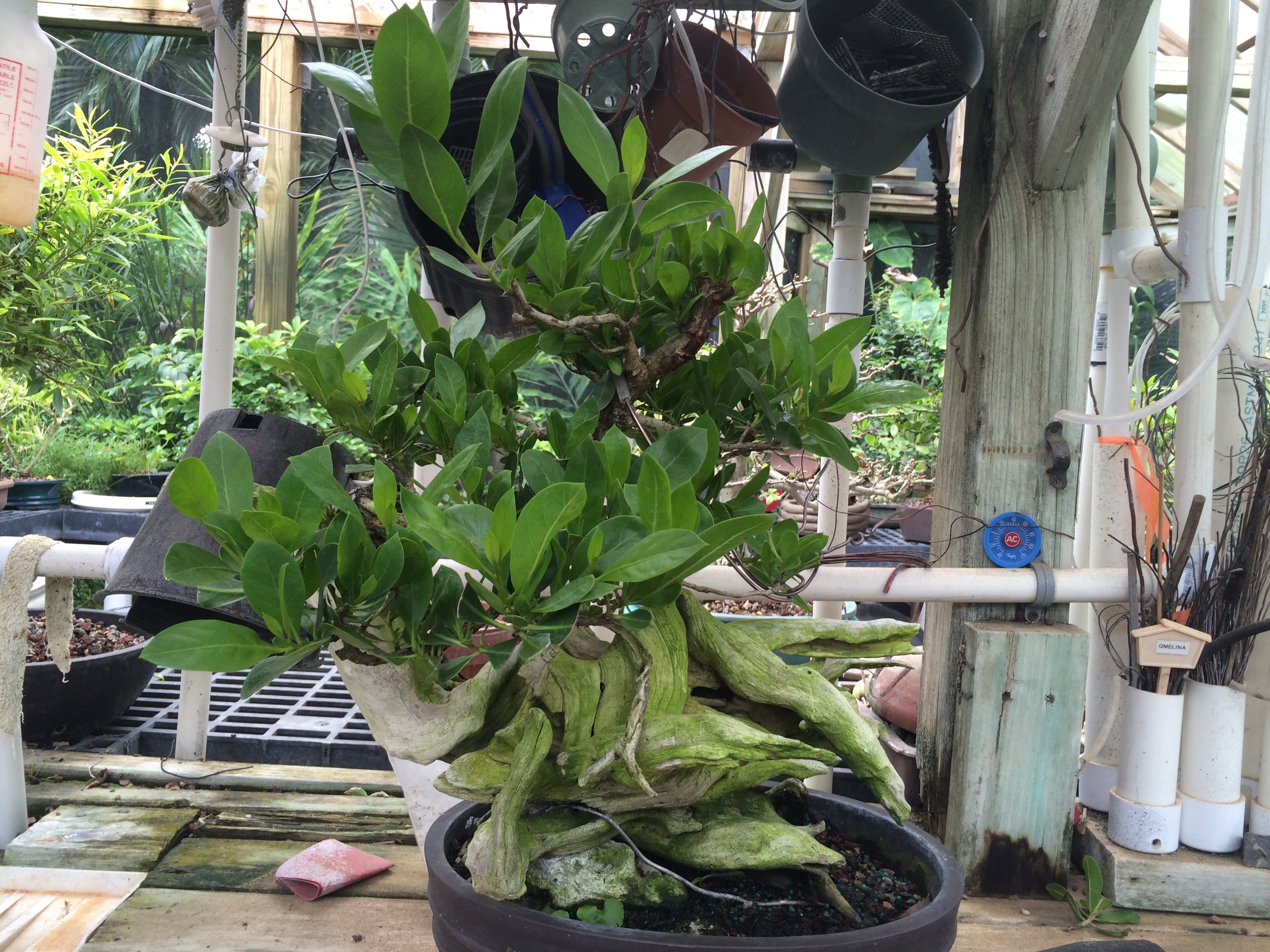 The buttonwood is one hundred percent a natural tree (except where it was carved I guess) the main bulk and shape of the deadwood was probably once the roots and the tree was knocked over and it re-rooted at that angle. That’s pretty common. Most collected buttonwood that’s a cascade or an upright but with a twisty trunk was laying down and then repositioned by the collector (usually Mary Madison)