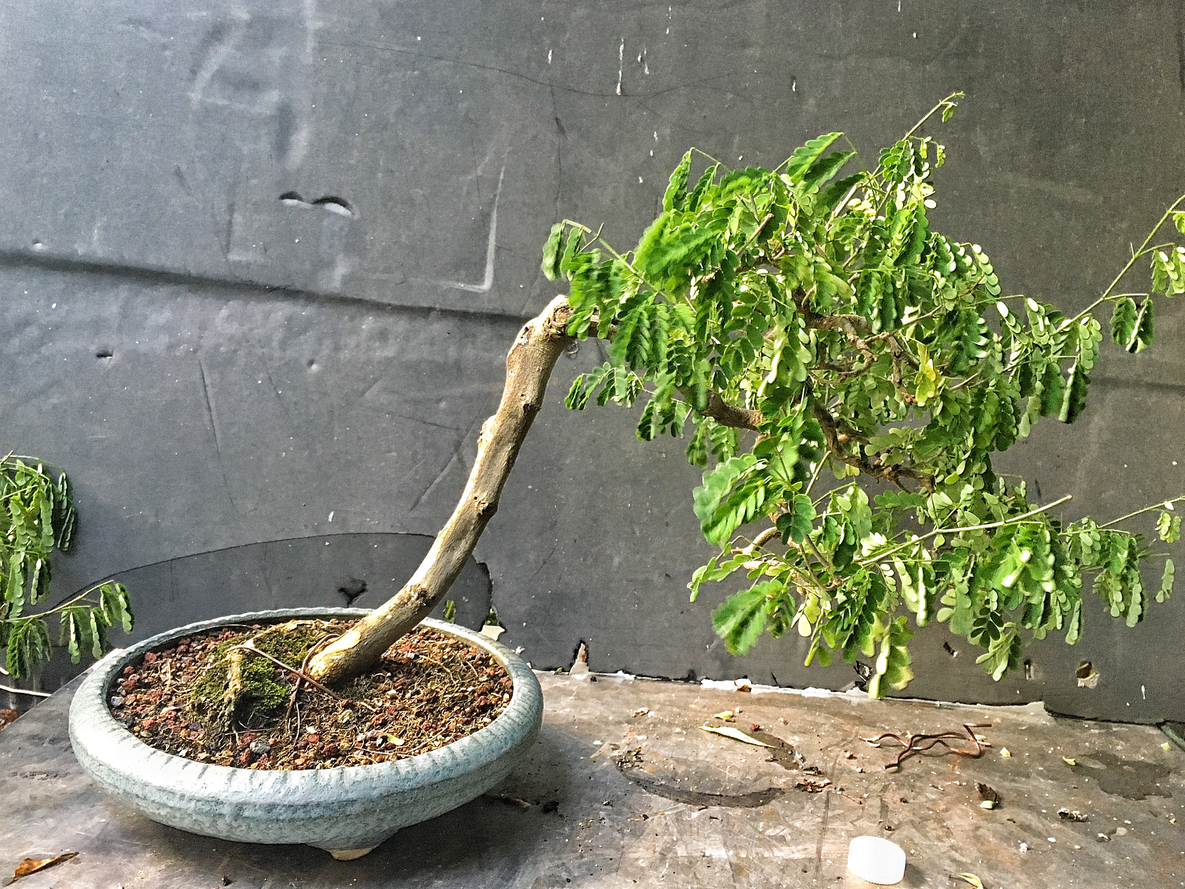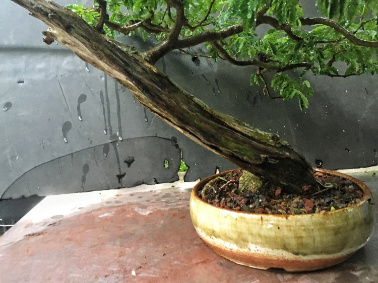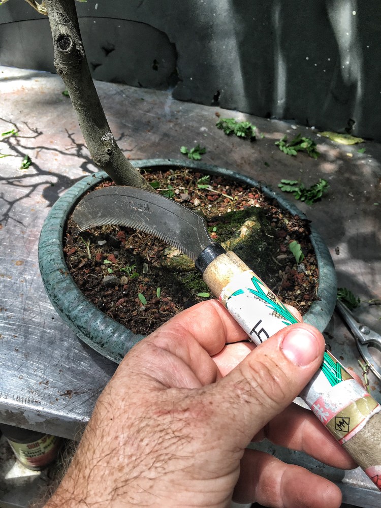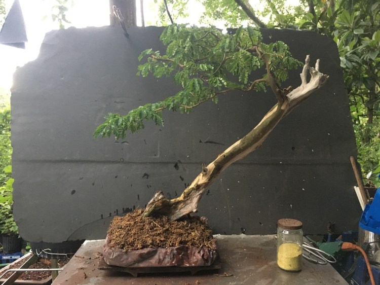 My usual modus operandi is to defoliate (to reduce transplanting stress) and style/wire at the repot time but I’m trying an experiment. You’ll notice that the soil is covered by sphagnum moss. It’s there to keep moisture in the top layer of soil, which is what usually dries out first. With raintrees, my experience is that when you repot BRTs, they’ll drop all their leaves. Let’s see how this helps.
