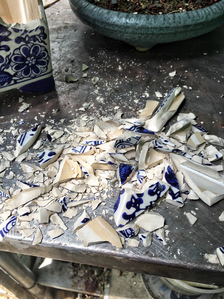I like your cracked pot tree, great way to reuse, recycle a damaged pot. But I think the tree should be set just an inch or two higher.