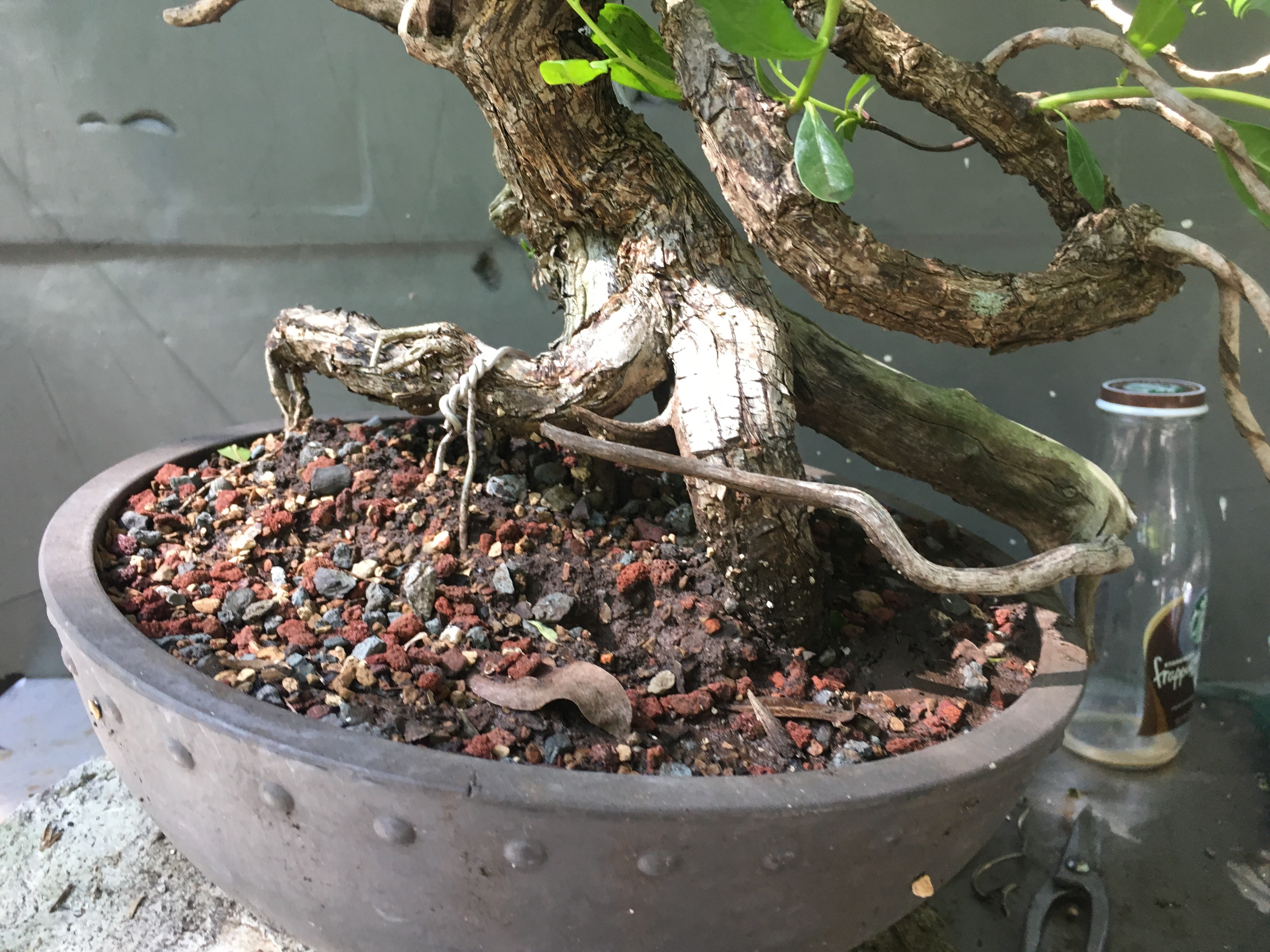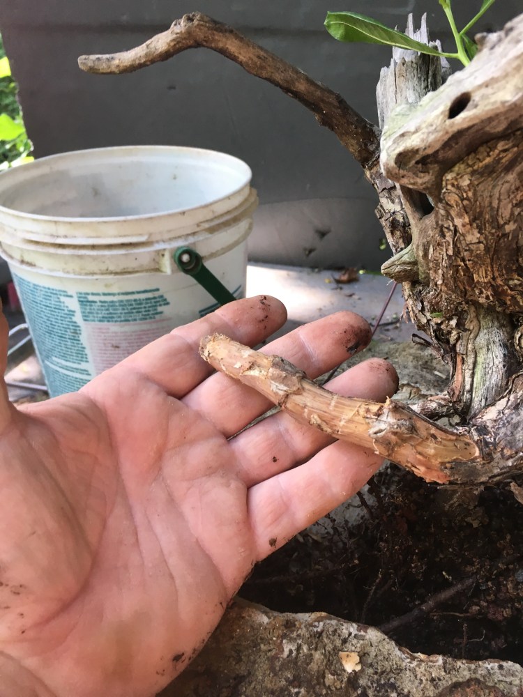 Now for a little style. I think it needs a bit. I’m going to defoliate it some. First, to help with transpirational water loss and, second, to see the structure (or more precisely, so you can see it).